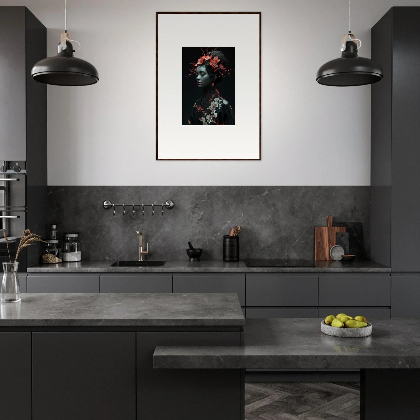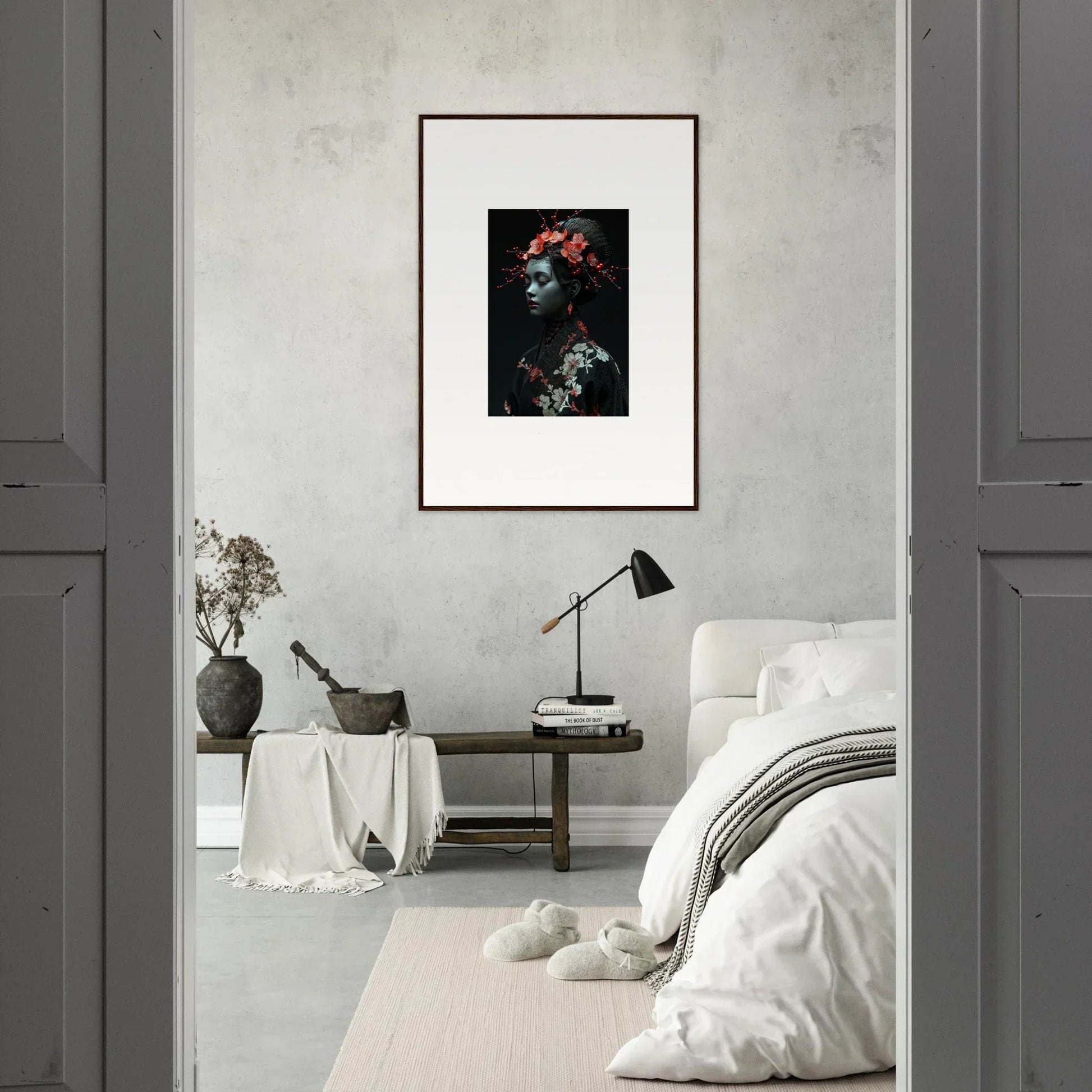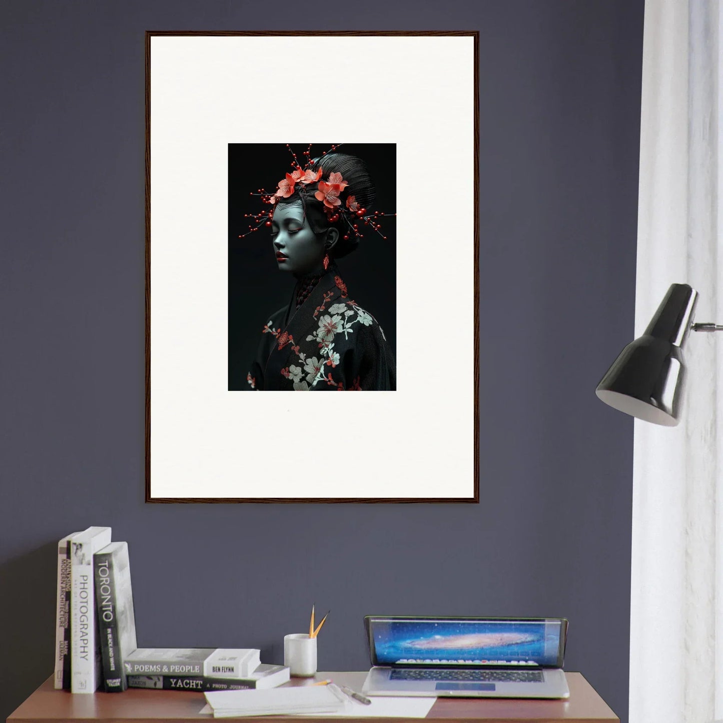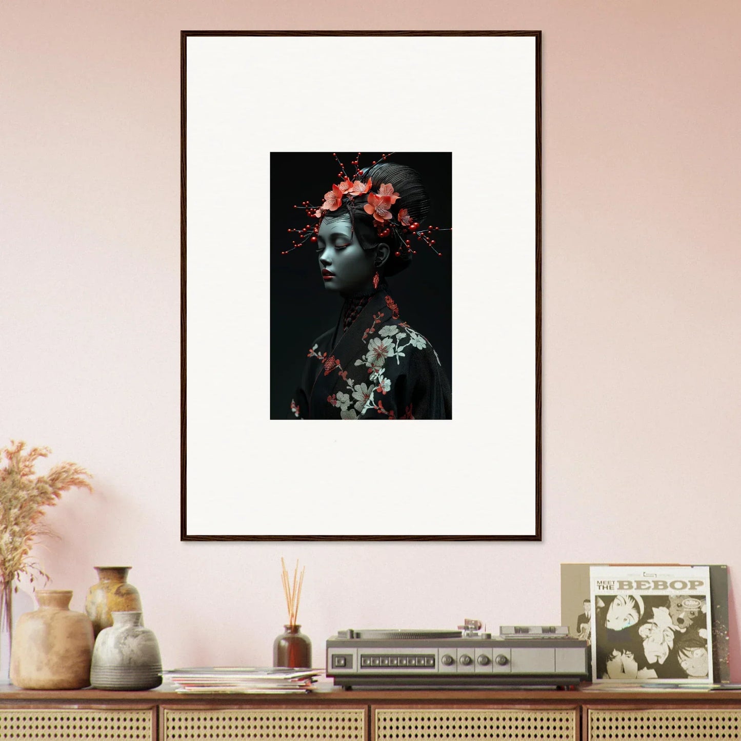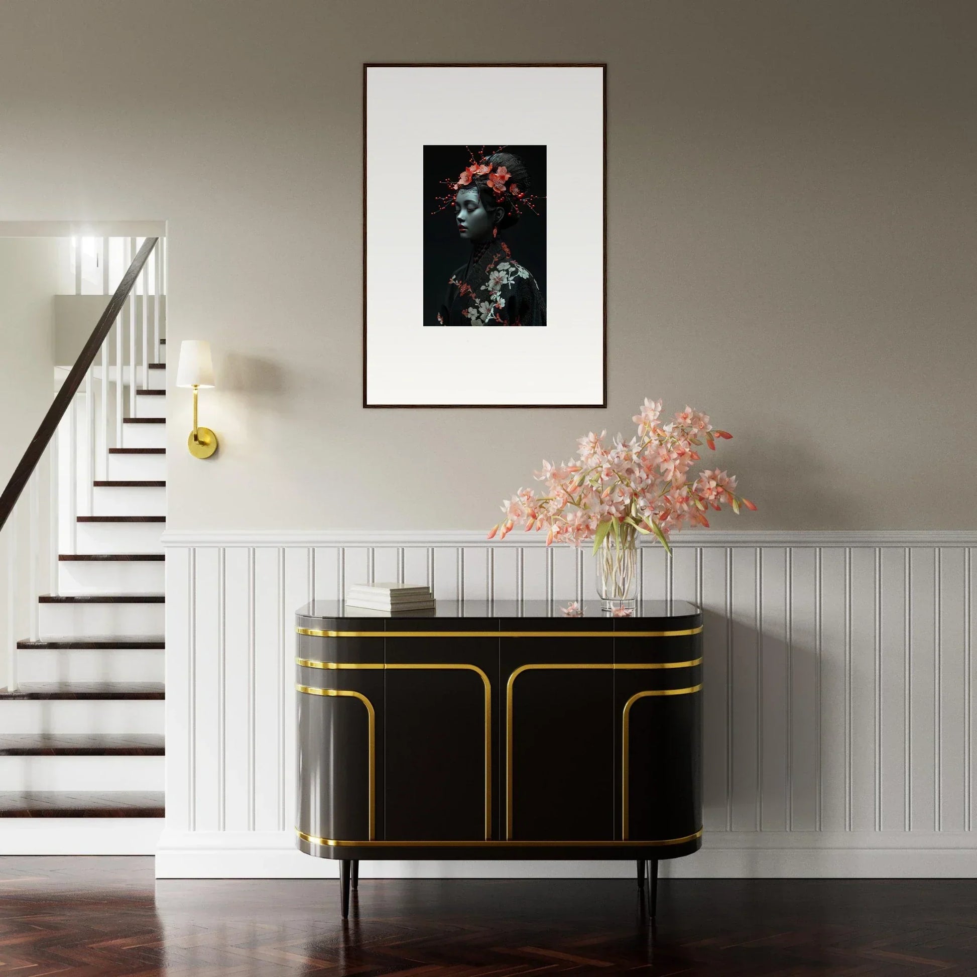 The eloquent Porcelain Cherry Essence is more than just a visual delight; it's an embodiment of luxurious style and serenity. The beautifully composed portrait, enriched with harmonious red hues and a bold black backdrop, effortlessly complements any bedroom or living room. The serene mood it brings is perfect for infusing tranquility and peace in your cultural and world-themed spaces.