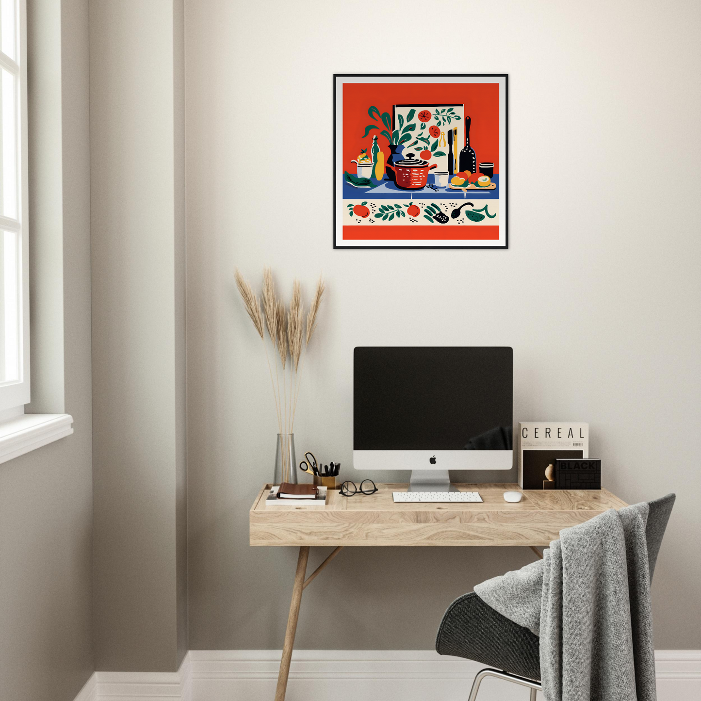 Our Pot Bohemian Bounty Framed Wall Art adds color, vibrancy, and warmth to kitchens and dining spaces. With hues of vibrant red, green, and blue, it beautifully complements both contemporary and classic interiors. Enrich your surroundings with a homage to the warmth and joy of meals shared.