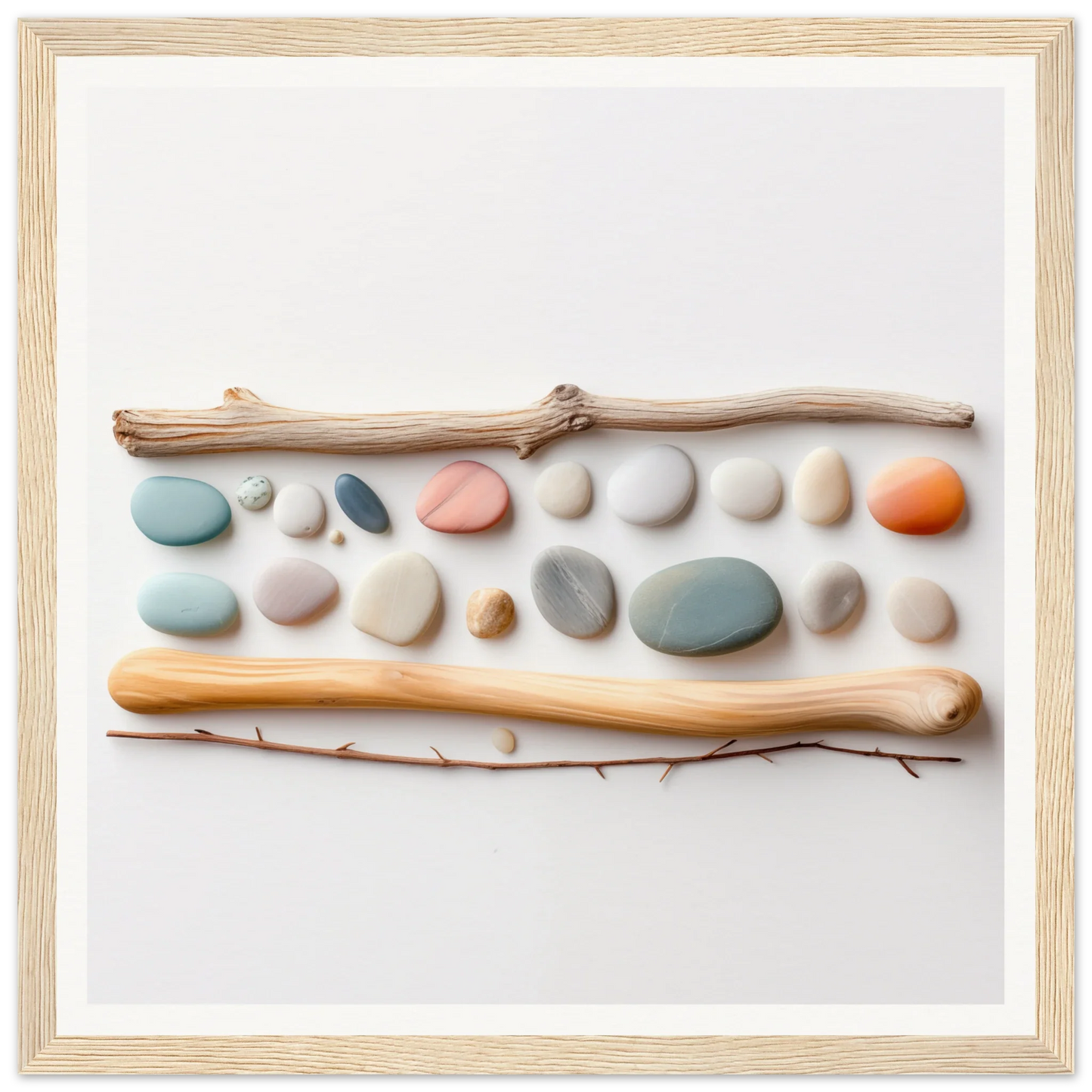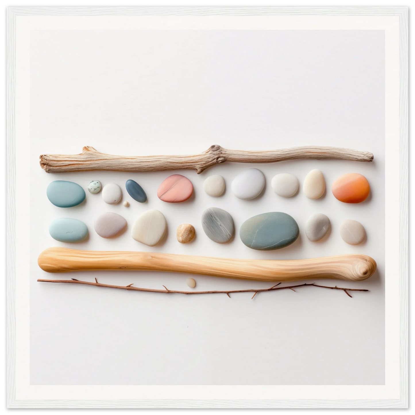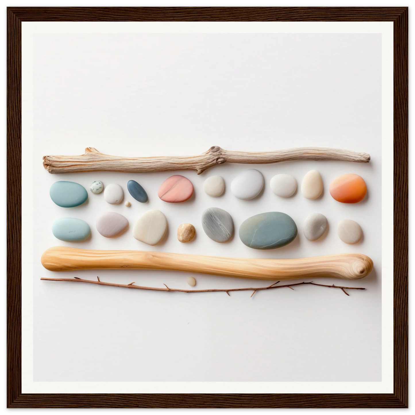 Welcome serenity into your space with our Precarious Pebble Poetry Wall Art, a minimalist masterpiece crafted by the union of nature and technology. This stunning framed artwork captures the simplicity and balance of smooth stones and driftwood arranged in harmonious lines, creating an oasis of calmness right in your room.