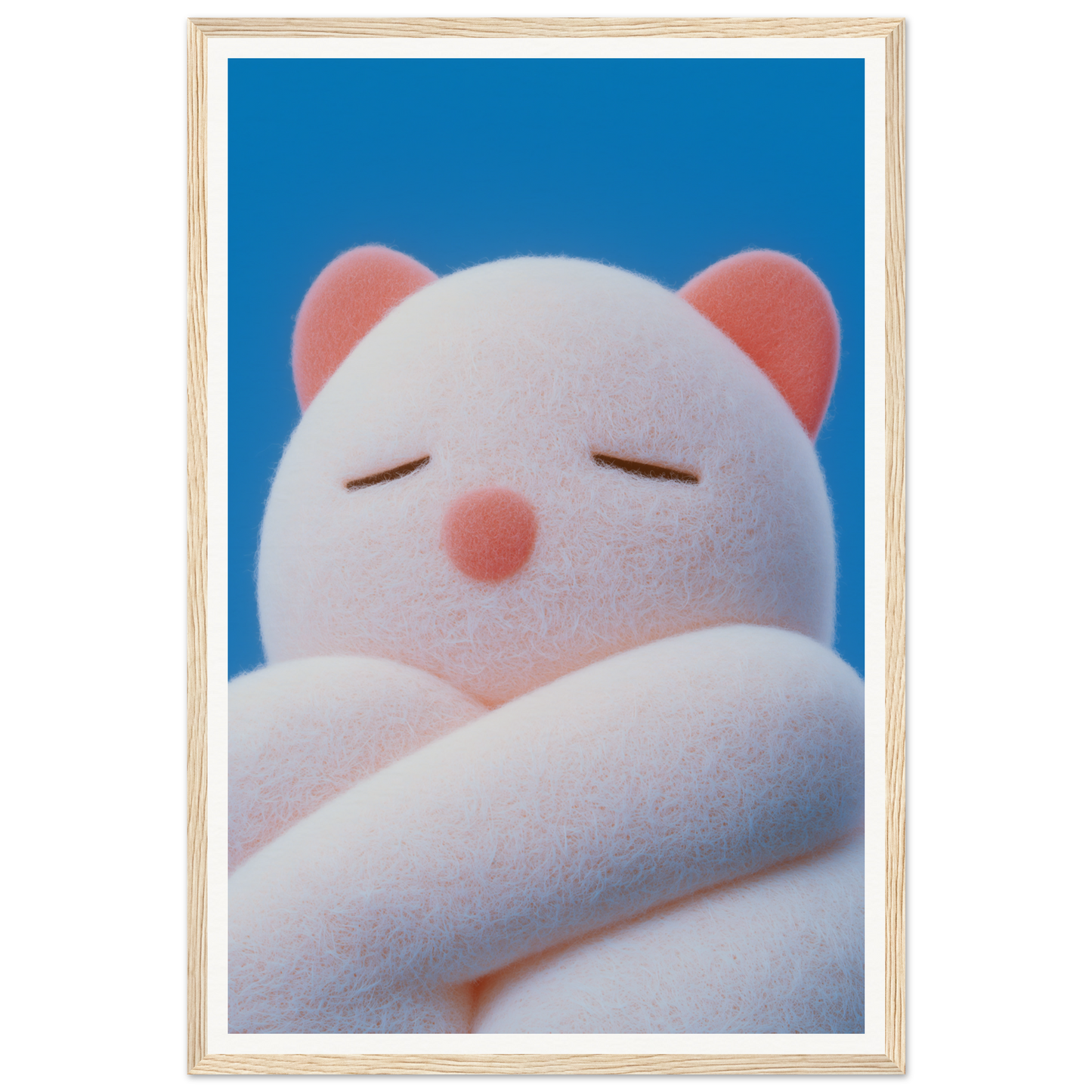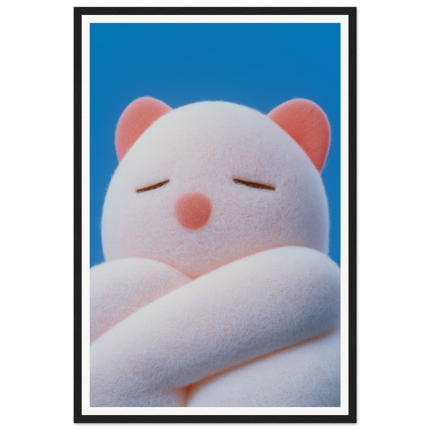 Introducing Pink Eloquence Cradled, a masterpiece where art embodies a plush, anthropomorphic creature in a serene moment of self-love. Its tender embrace and minimalistic features are painted in soft pastel pink, capturing a world where simplicity and warmth connect. Brought to life using cutting-edge AI image generation, this framed wall art is designed to bring tranquility and elegance into your home.