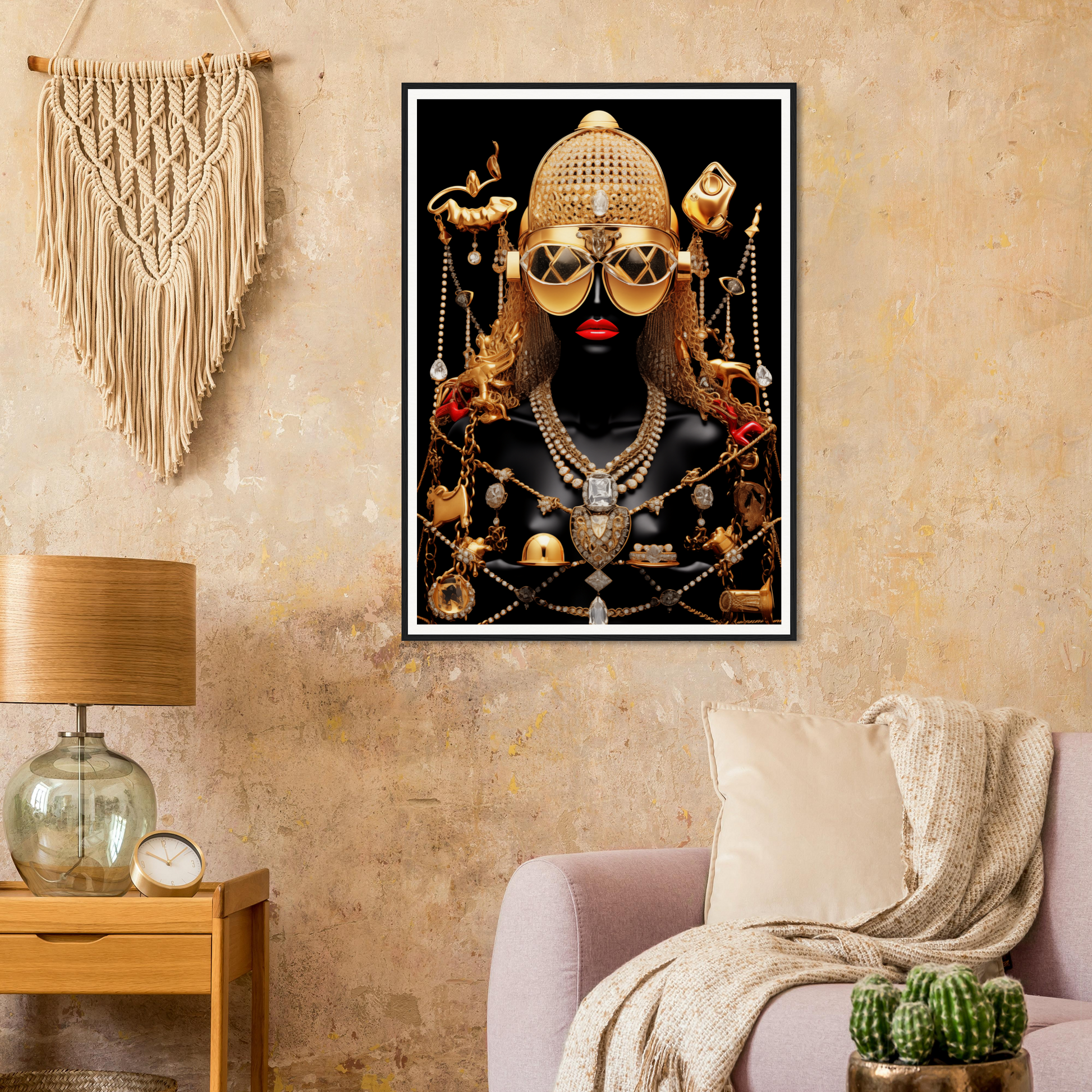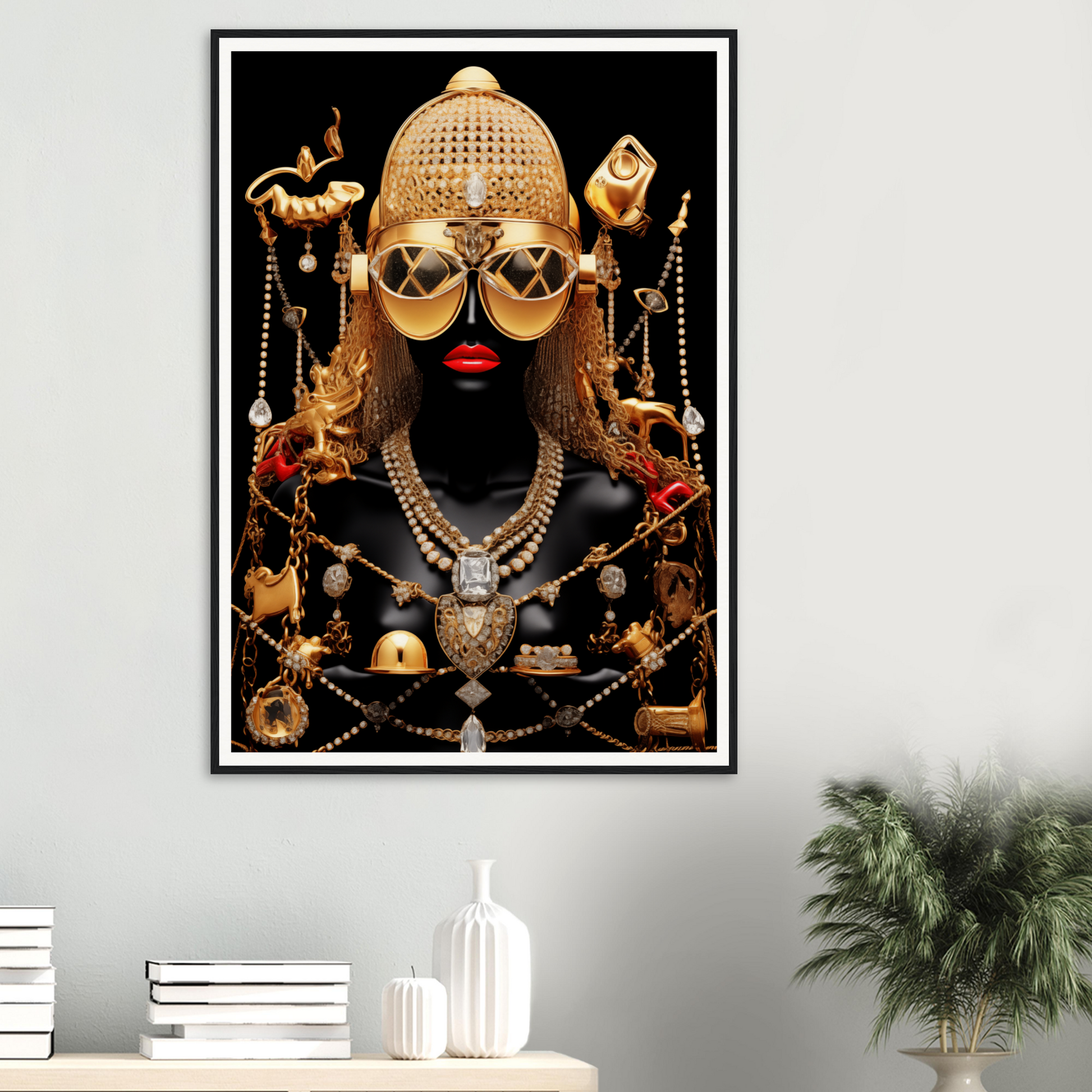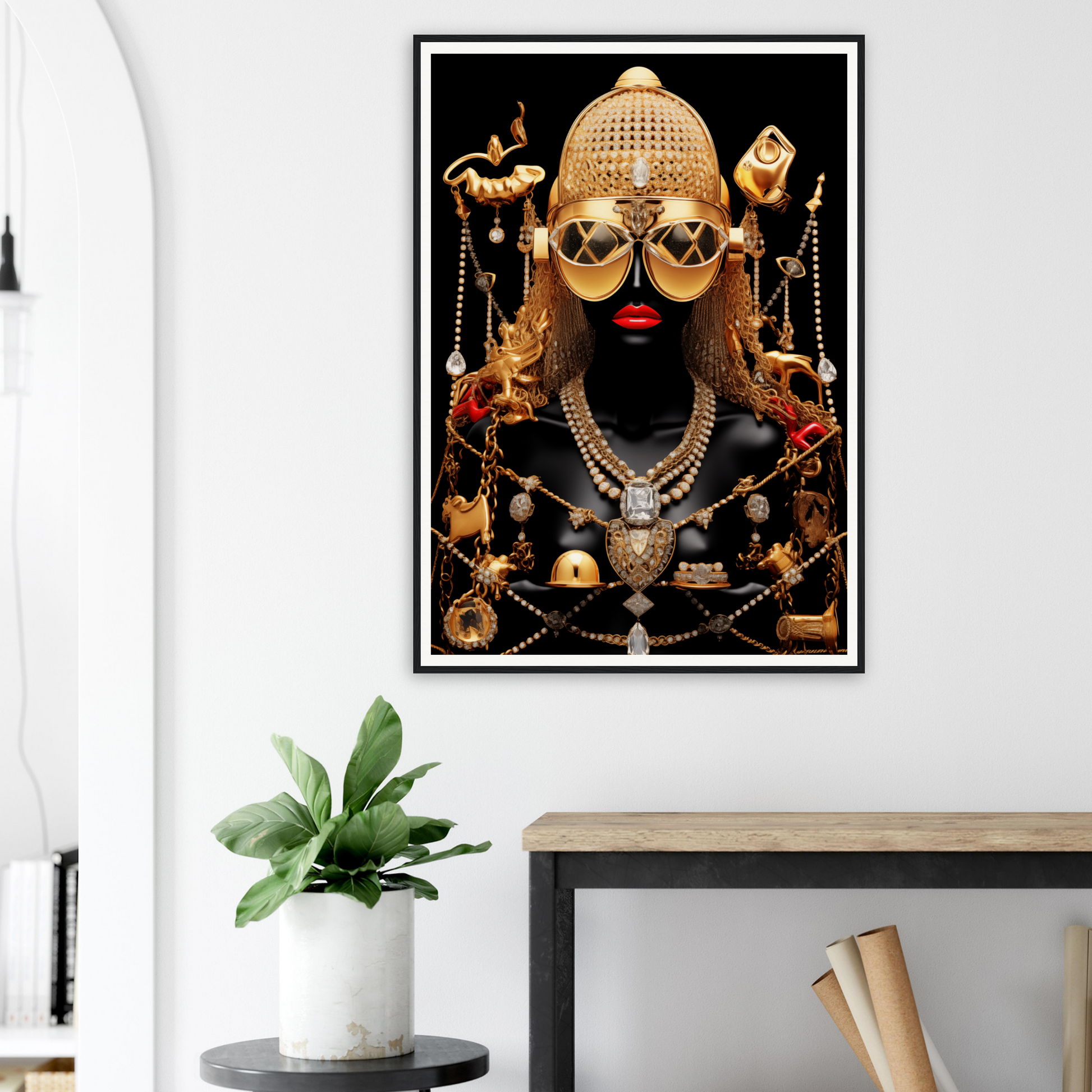 Experience the rich splendor of a gold-dominated color palette, contrasted against a deep black background. The framed canvas not only exhibits striking visual depth but also invites introspection into themes of identity and materialism.