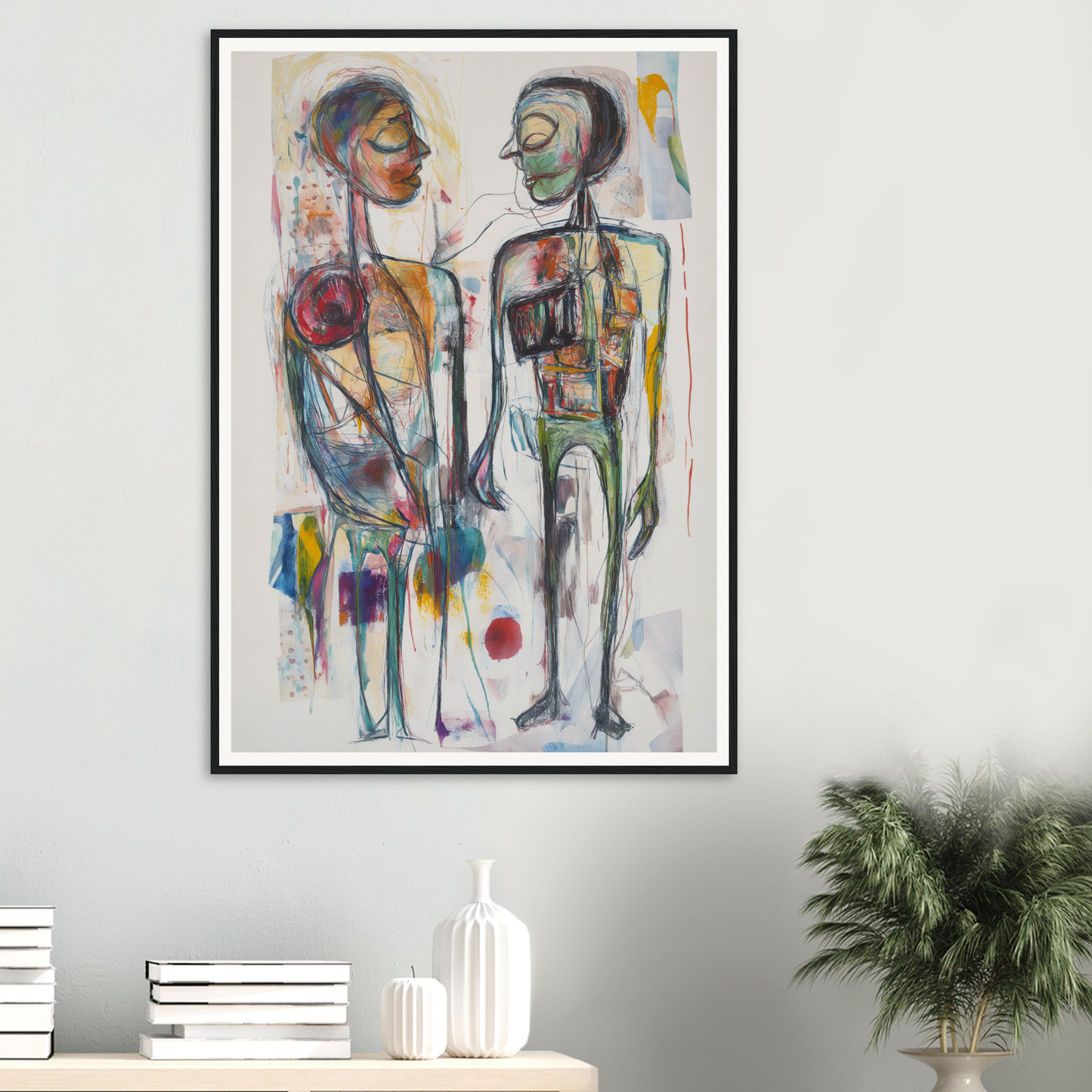 This piece graces both living rooms and bedrooms, allowing its themes of connection and introspection to adapt to your personal spaces, whether accentuating white walls or complementing the deep bowels of an art space. Advanced AI-generation techniques ensure a cutting-edge aesthetic, harmoniously merging technology with a timeless artistic ethos.