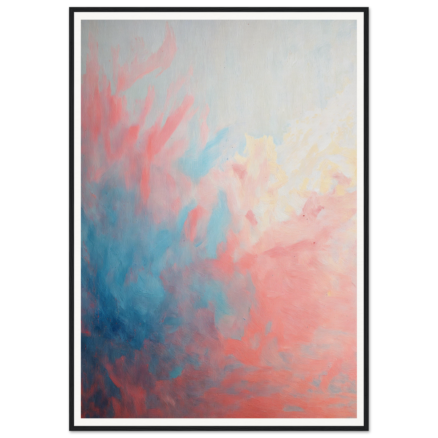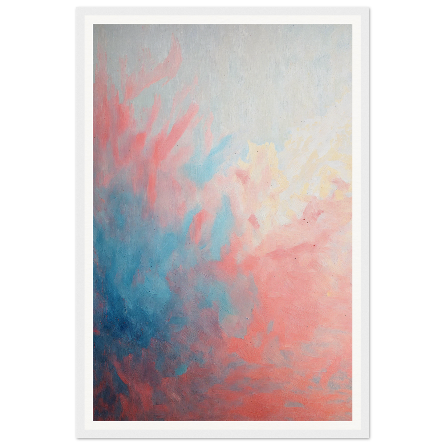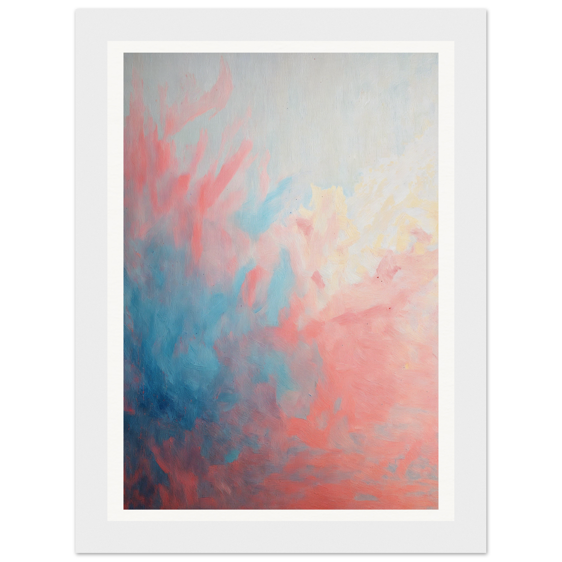 Step into a world where colors whisper and forms soothe the senses. Soft Cosmic Reverie employs a flowing composition of gentle pinks and pale sky blues, balanced by hints of soothing pastel coral and yellow. The palette evokes dreamlike tranquility and gently draws viewers into a serene, contemplative headspace.