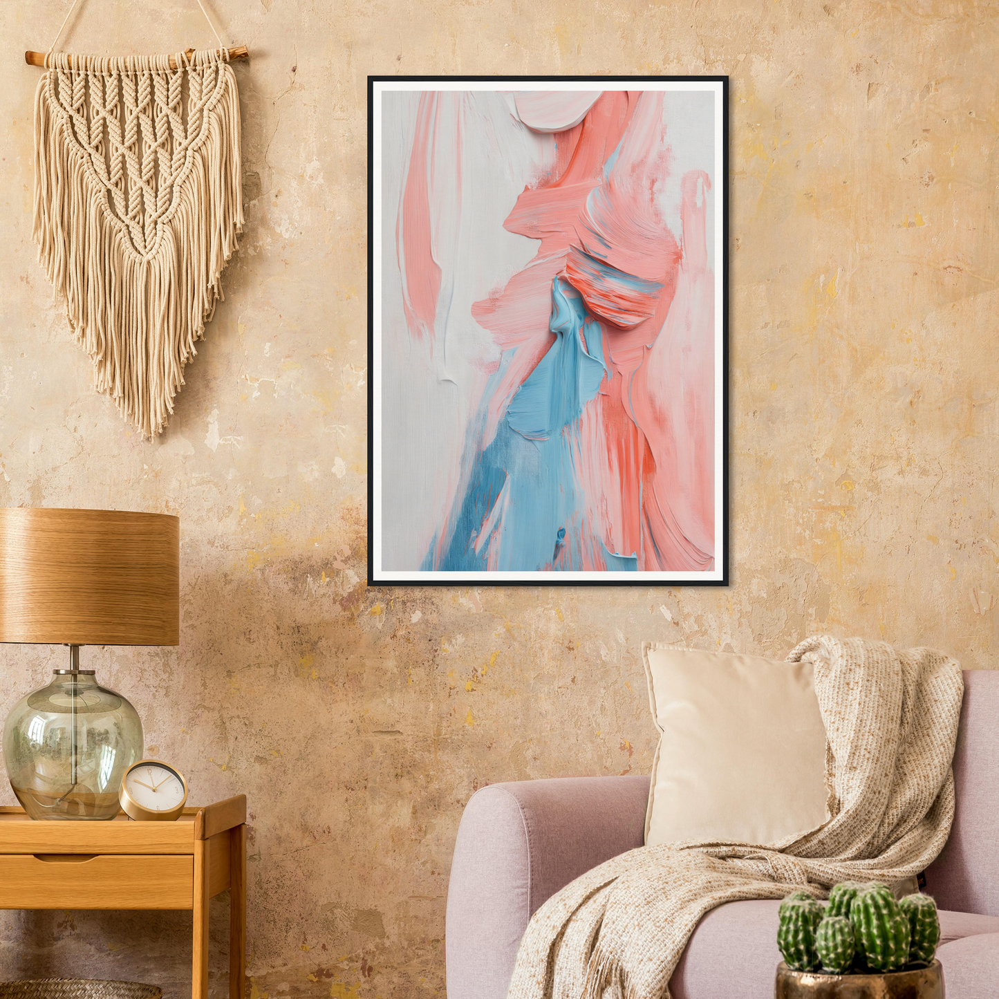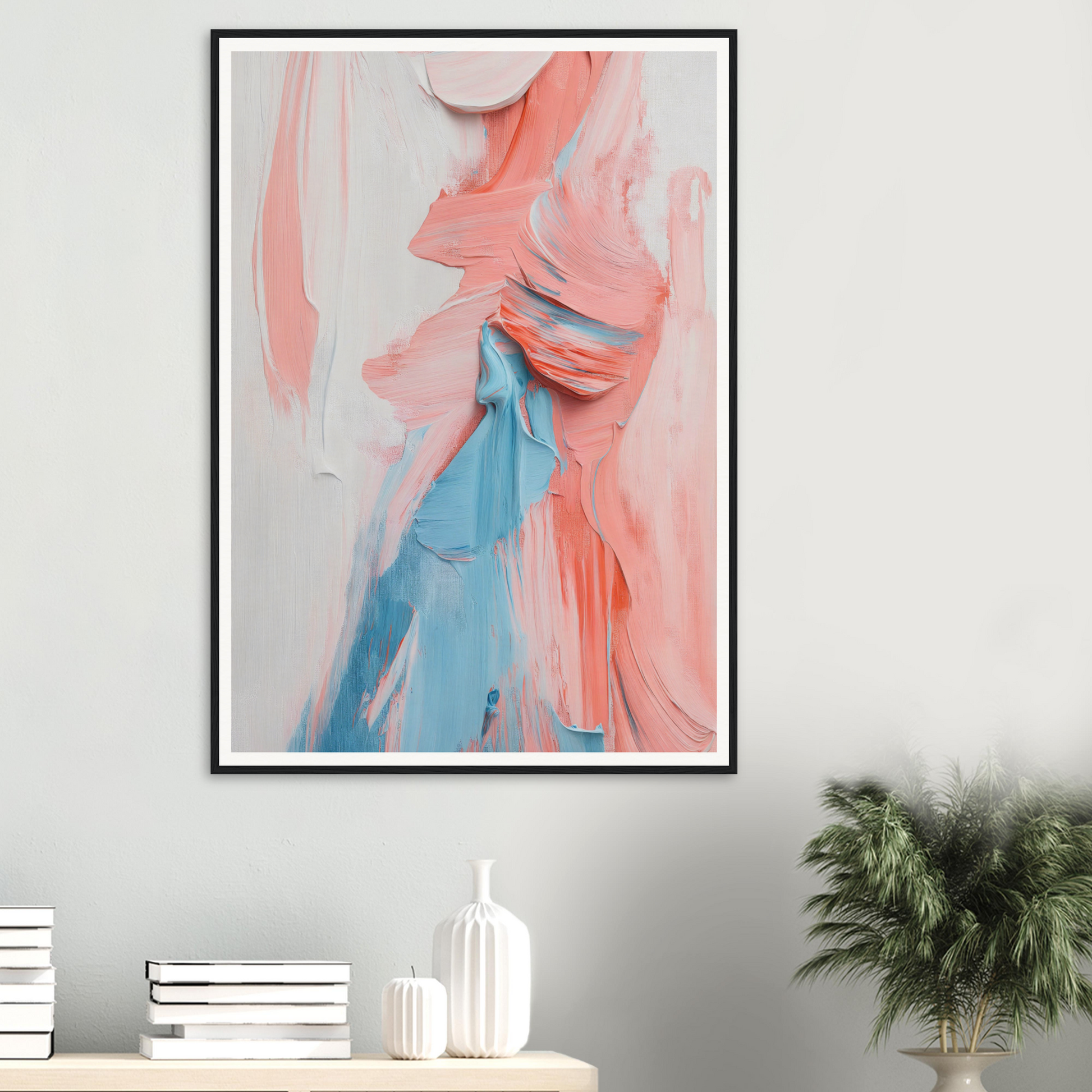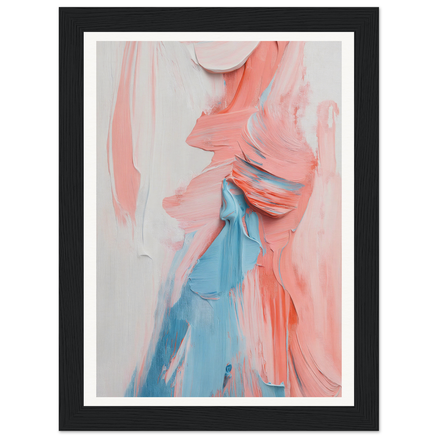 This abstract expressionist canvas envelops viewers with a gentle pastel palette: soothing peachy pinks and sky blues that dance across a subtle backdrop, invoking both calm and energy. Set within a meticulously crafted frame, choose between natural wood, black, or white accents to perfectly complement any decor style, be it contemporary or bohemian.