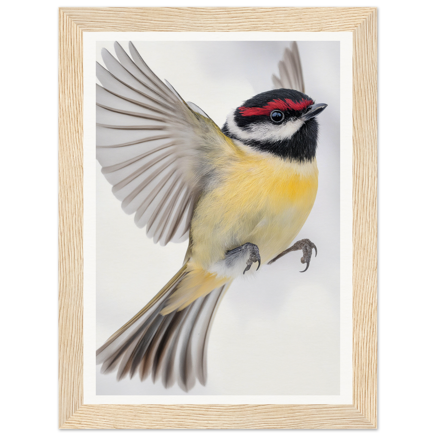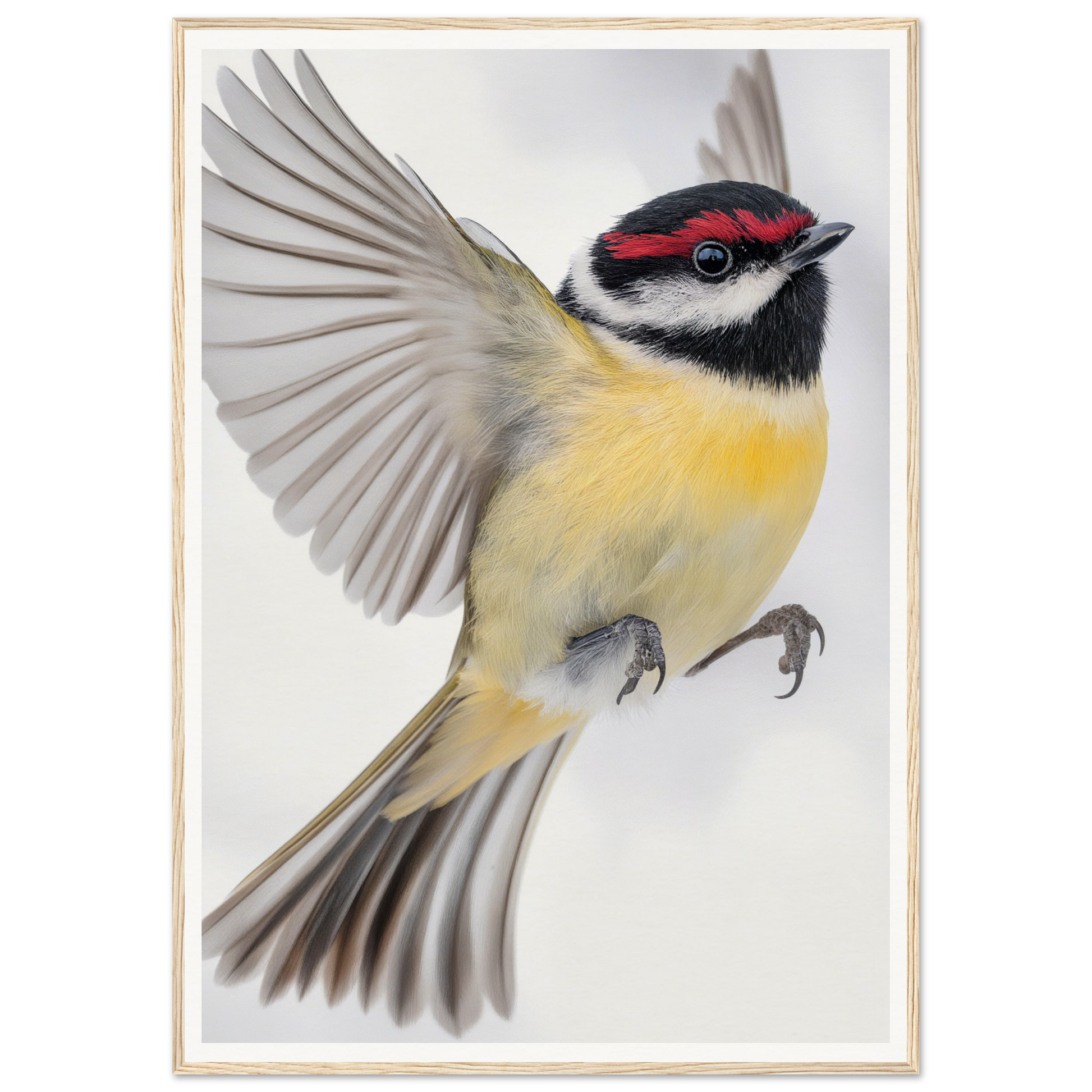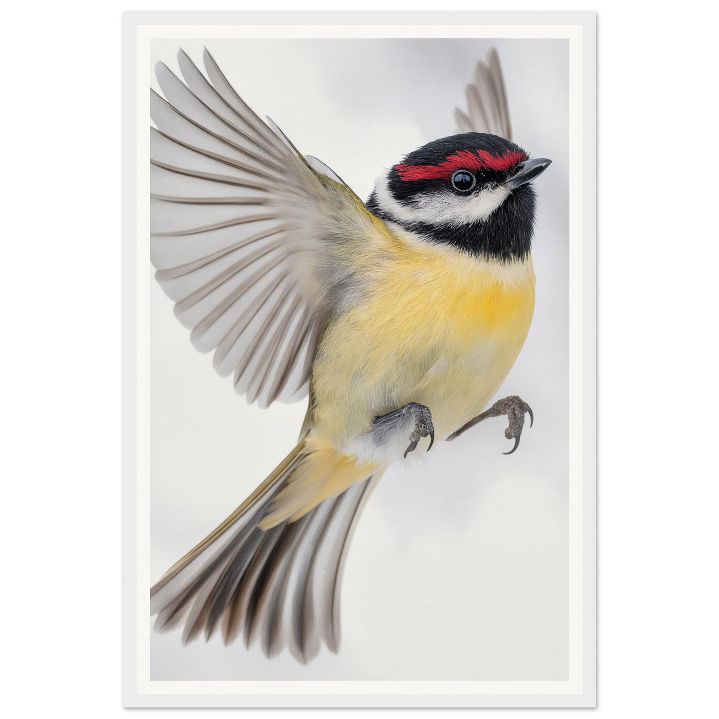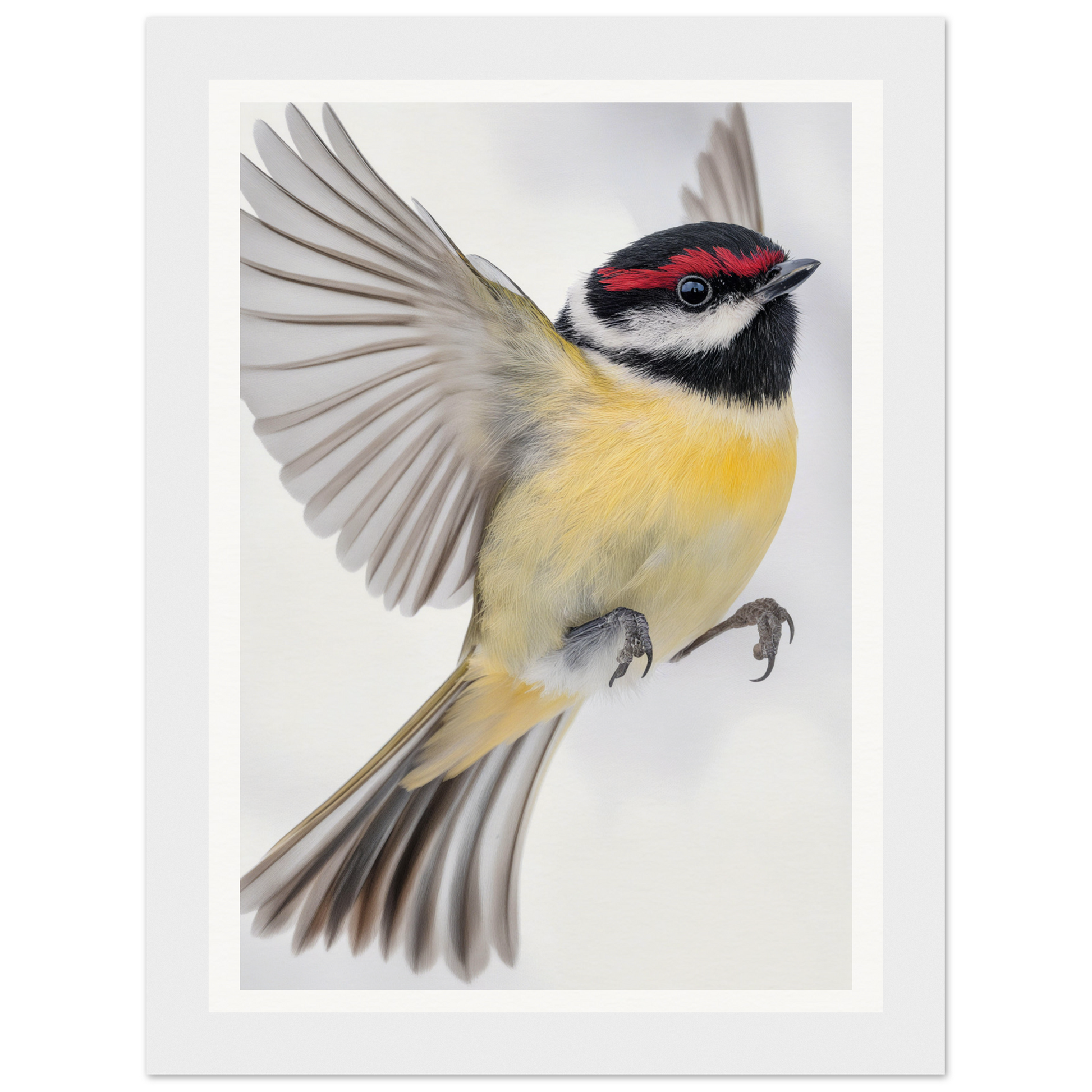 The dominantly soft yellow breast and contrasting black head and wings of the bird allow this artwork to resonate style and sophistication. Accentuated by a vivid streak of red above the eye, the art invites spectators to witness nature's alertness and charm. A predominantly white background enhances these colors, offering a serene canvas for your home.