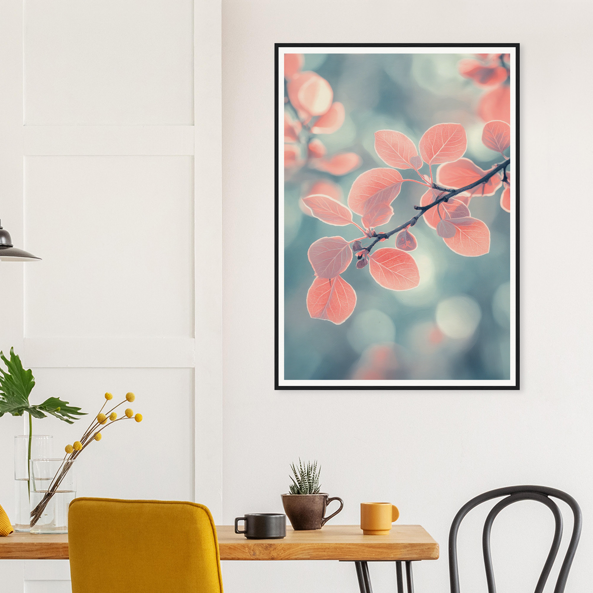 Envision your space infused with tranquility and timeless beauty. Our Whispering Vein Reverie, crafted using the latest AI image generation technology, brings this serenity into your life. This exquisite framed art captures the elegant simplicity of a vine, its soft coral peach leaves contrasting a mystic teal backdrop, creating a serene and harmonious composition.