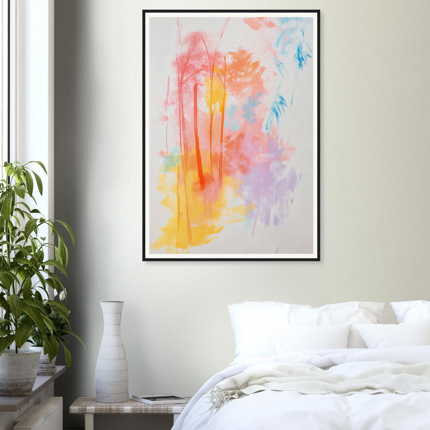 Bask in the serene glow of pinks and oranges as they gently dance across the canvas in a mesmerizing dialogue with vibrant yellows and soothing blues. This exquisite palette, with its whispers of purple and aqua blue against a neutral backdrop, invites tranquility and vibrant energy into any setting—be it a modern living room, a cozy bedroom, or an inspiring office space.