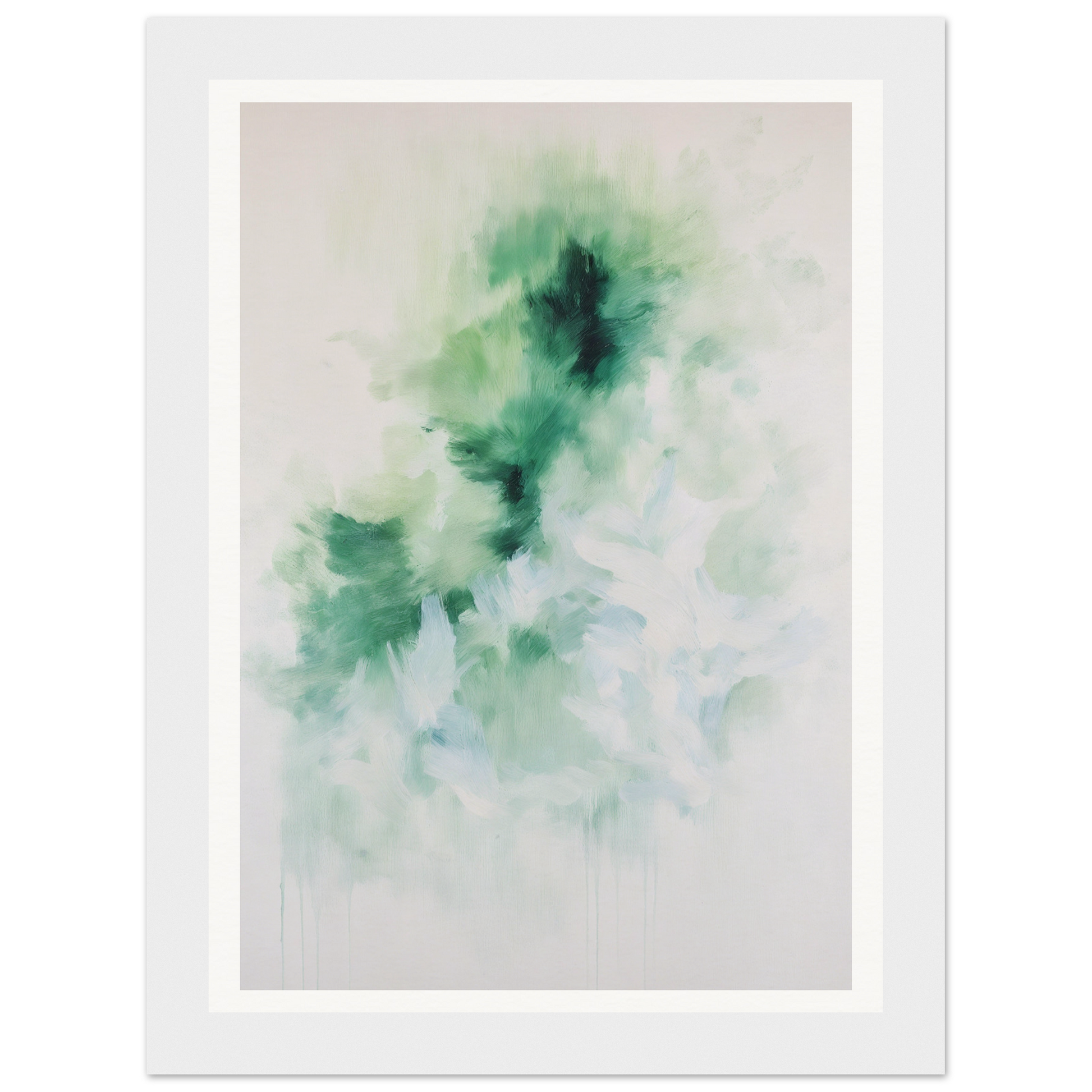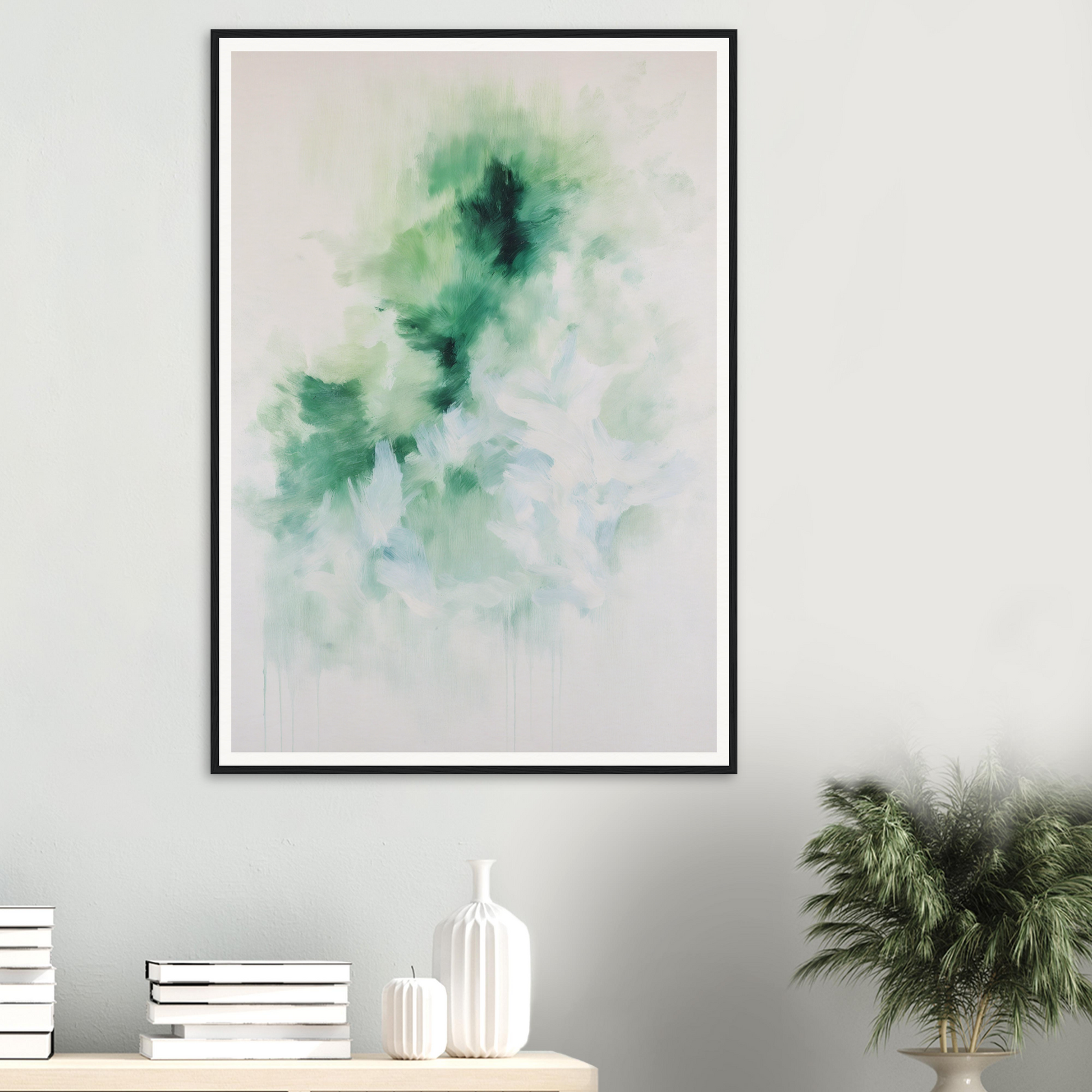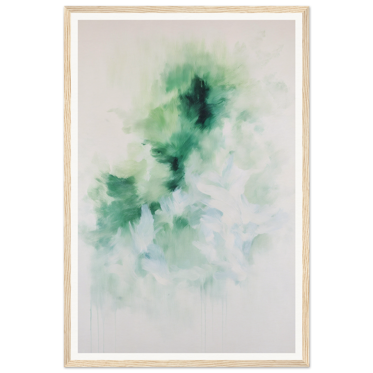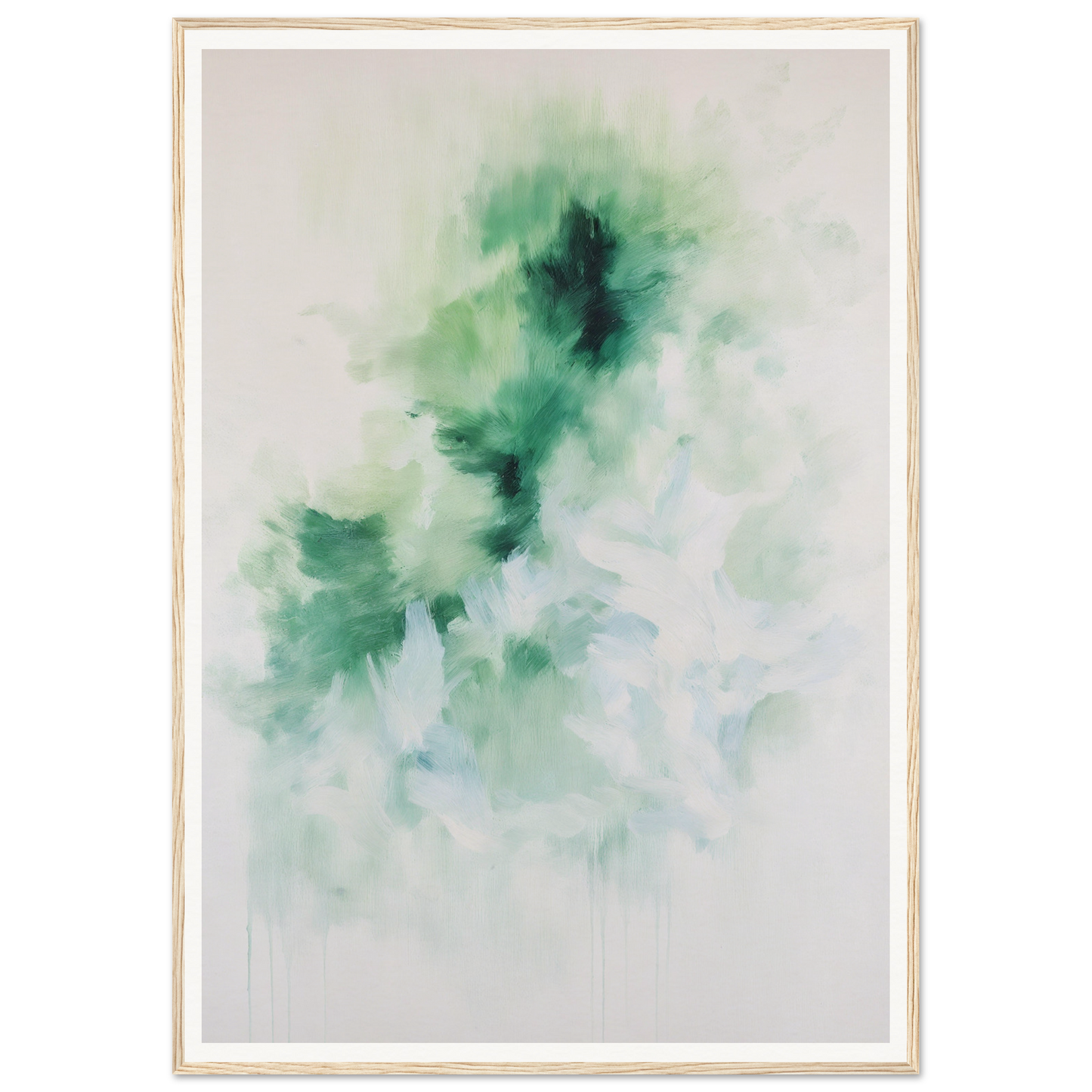Dive into a spectrum of greens, from delicate nochios to vibrant emeralds, all interwoven with soothing blues and pristine whites. This framed art piece captures nature's harmony, instilling a tranquil, contemporary atmosphere perfect for living rooms, bedrooms, or offices alike. The artwork stands as both a soothing vista and an elegant abstract interpretation of movement.