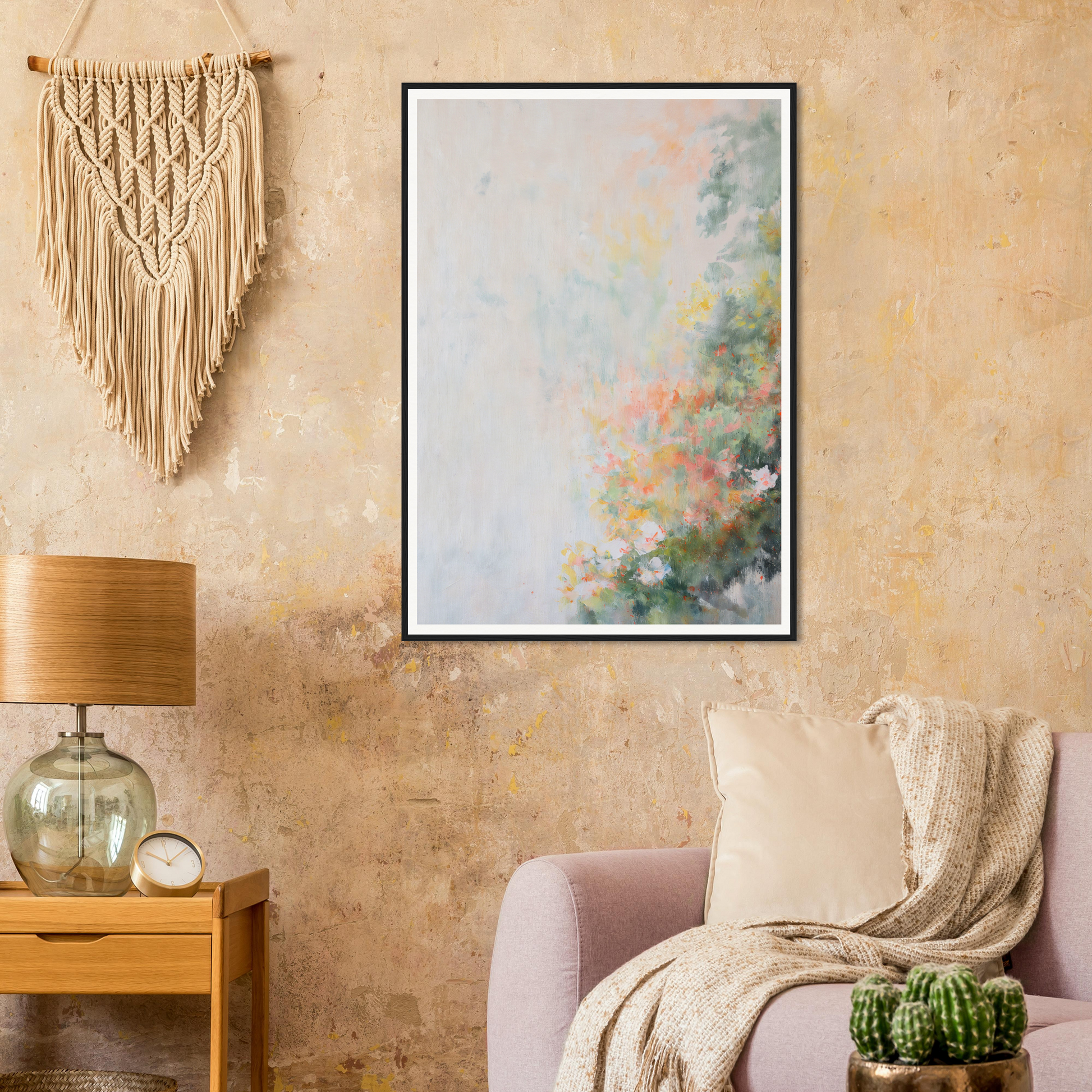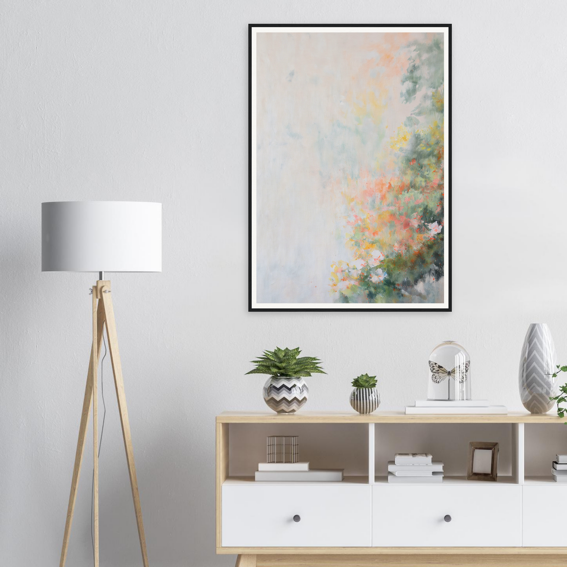 The artwork is printed on archival-quality canvas, ensuring a crisp display of its ethereal color palette: muted whites, soft greens, tender pinks, and whispers of yellow and blue. This ensures the painting retains its vibrant, calming charisma for years to come.