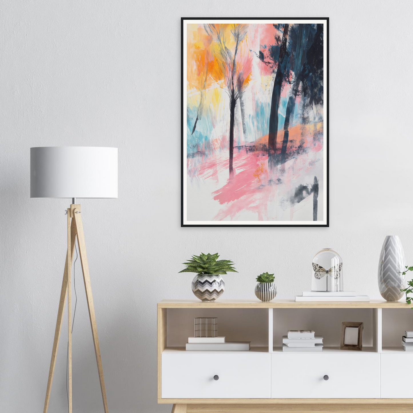 Dive into a realm where soft pinks and pastel blues create a soothing palette of quiet introspection, perfectly contrasted by strokes of dark blues and blacks. It's a landscape of dreams, capturing the transient beauty of nature akin to a sunrise or sunset.