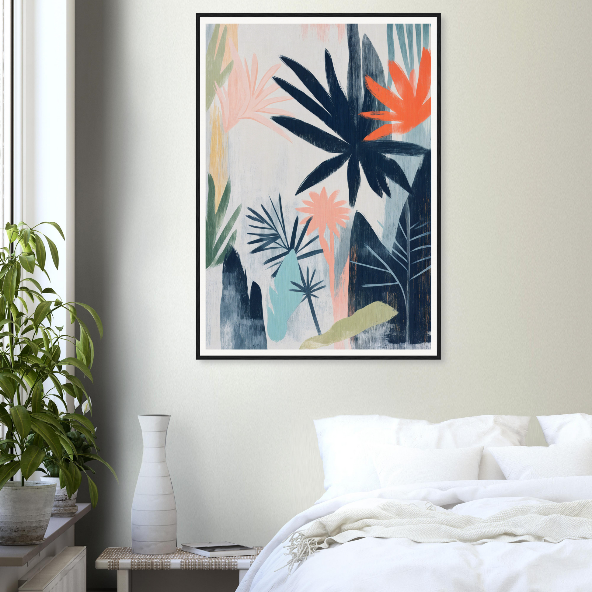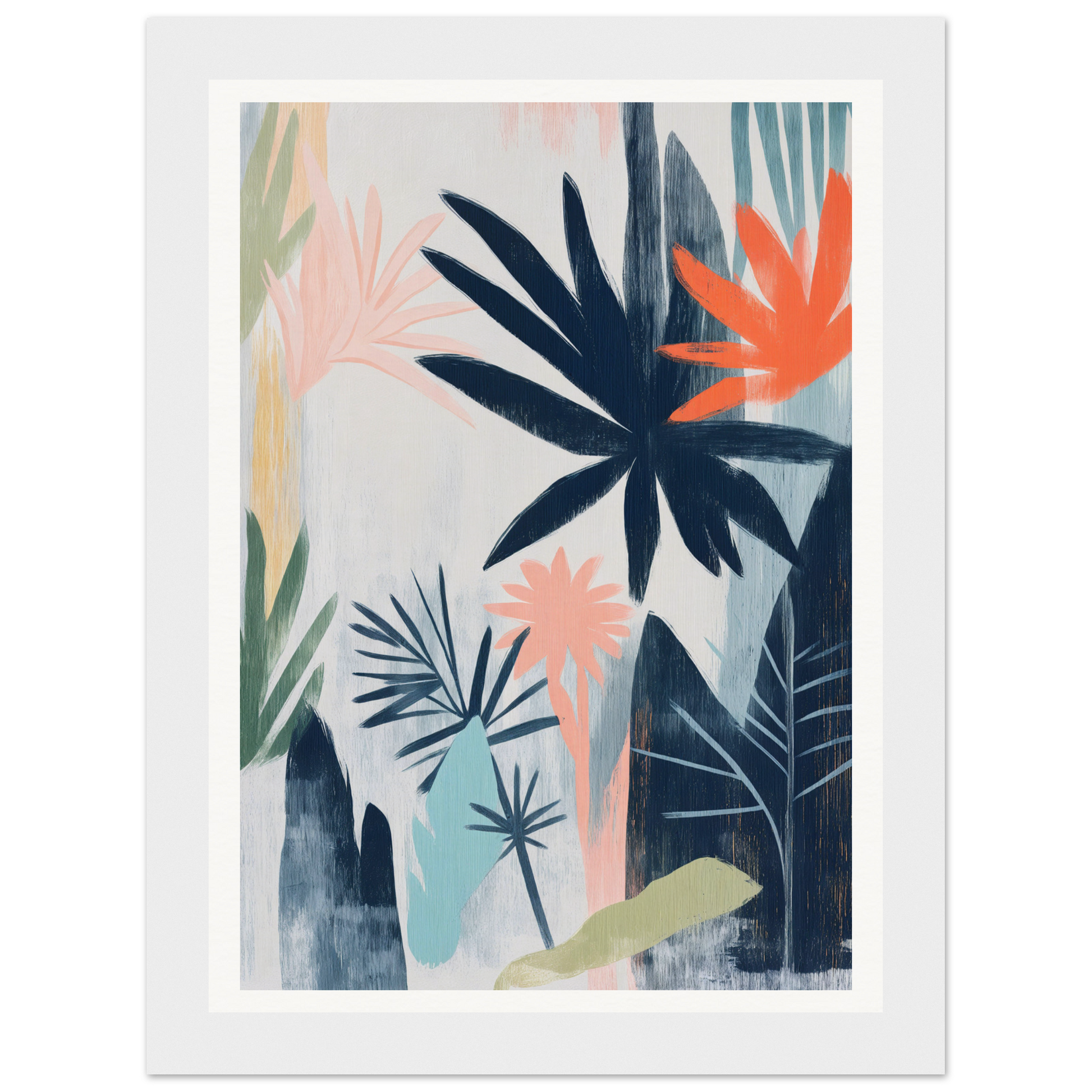 Dominated by deep navy blue, the artwork anchors and infuses your space with a sense of depth and intrigue. This canvas draws you in with vibrant coral orange highlights, balanced by pastel pinks, sage greens, warm beige, and light turquoise. These serene hues, set against a muted gray-beige backdrop, create a calming and lively ambiance, seamlessly blending with various indoor styles, from contemporary elegance to rustic charm.