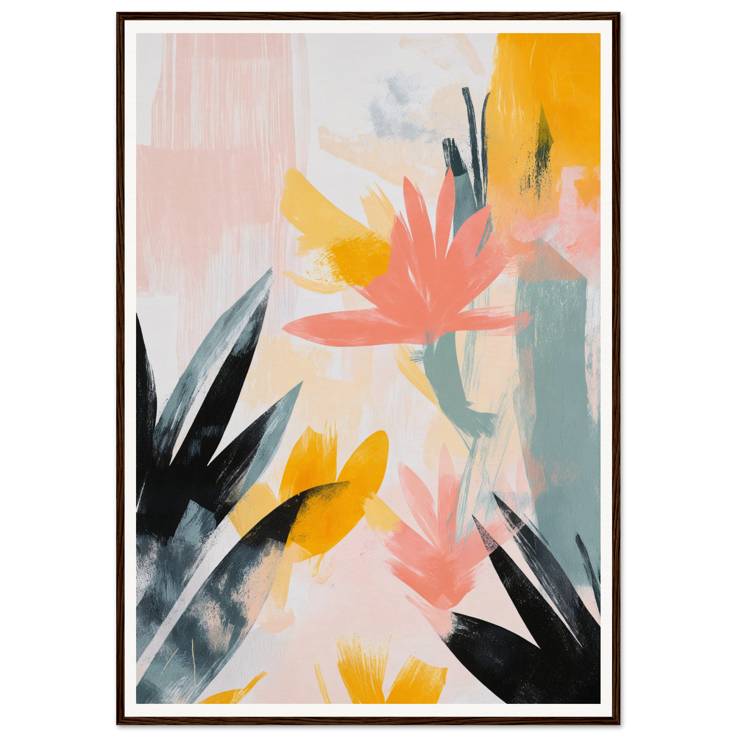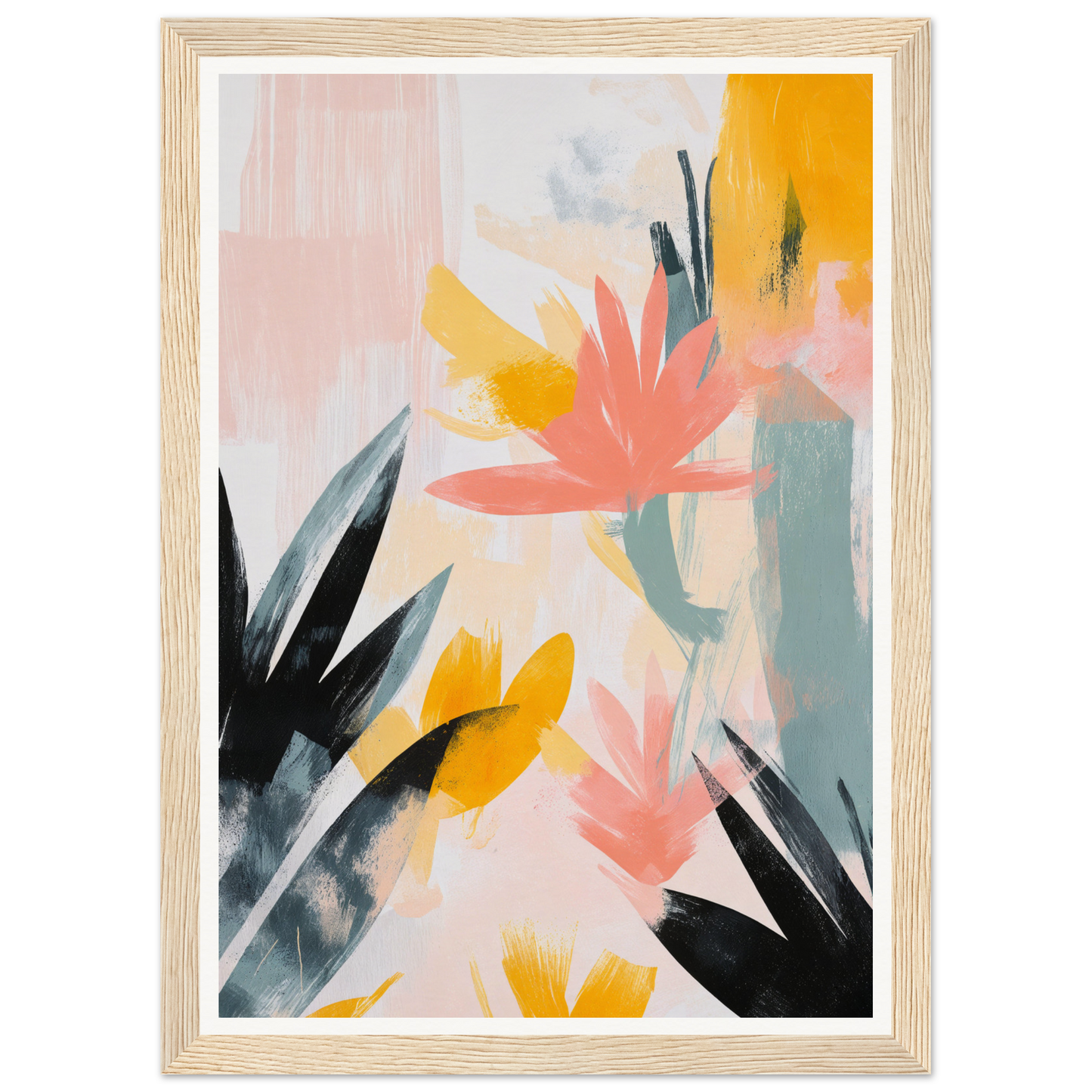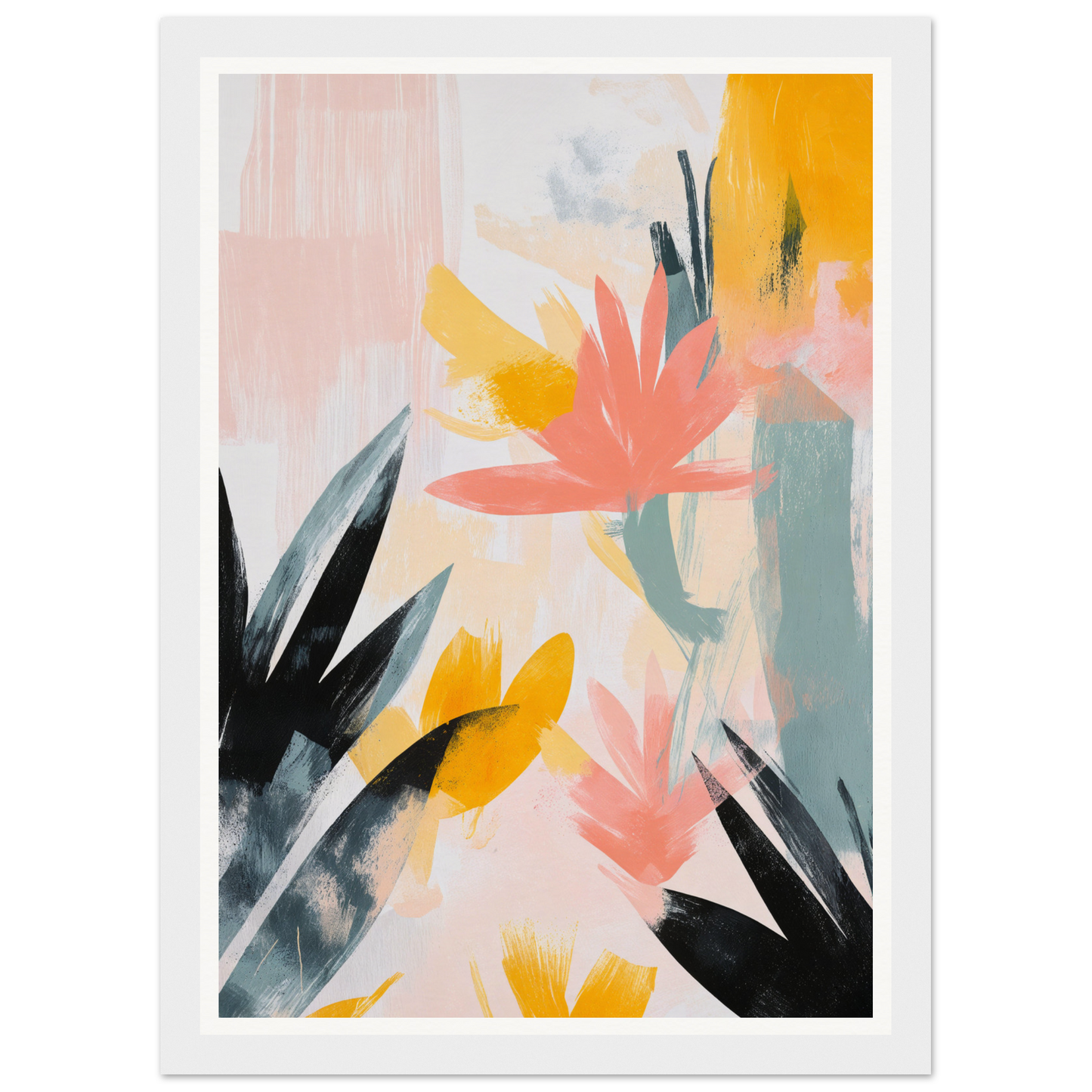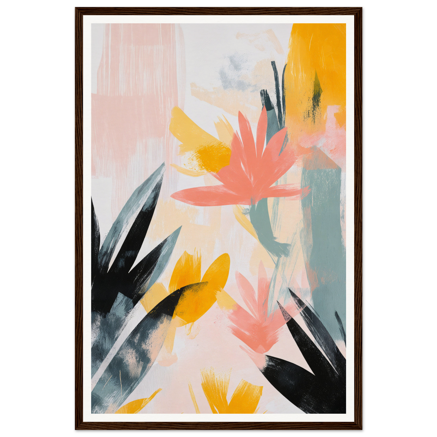 Immerse yourself in a palette of warmth and vitality. The soft pink background, intertwined with vivid yellow, coral, deep blacks, and teal, forms a harmonious abstract floral and leaf theme that encourages both serenity and lively contemplation.