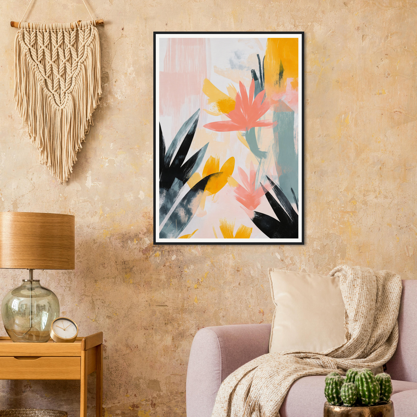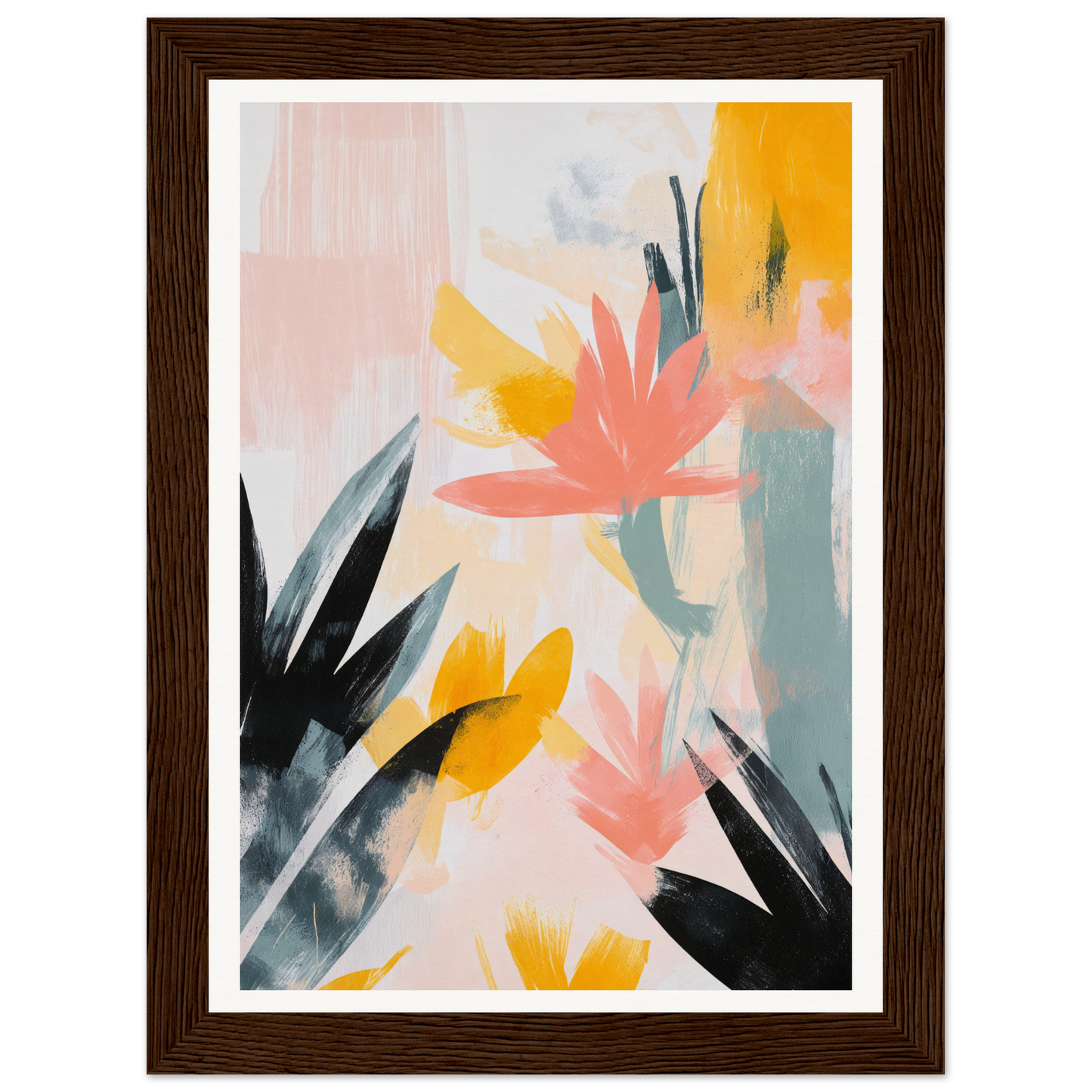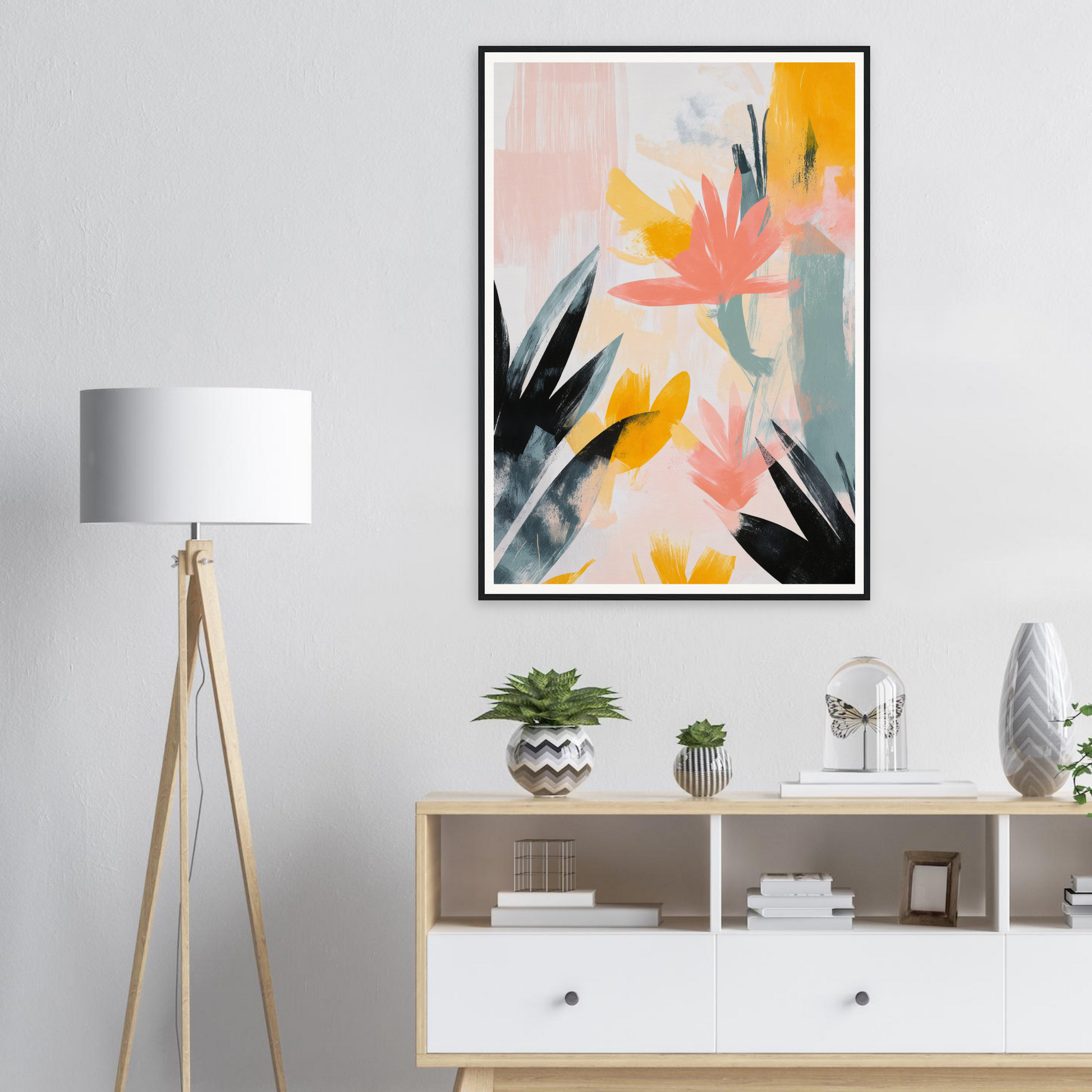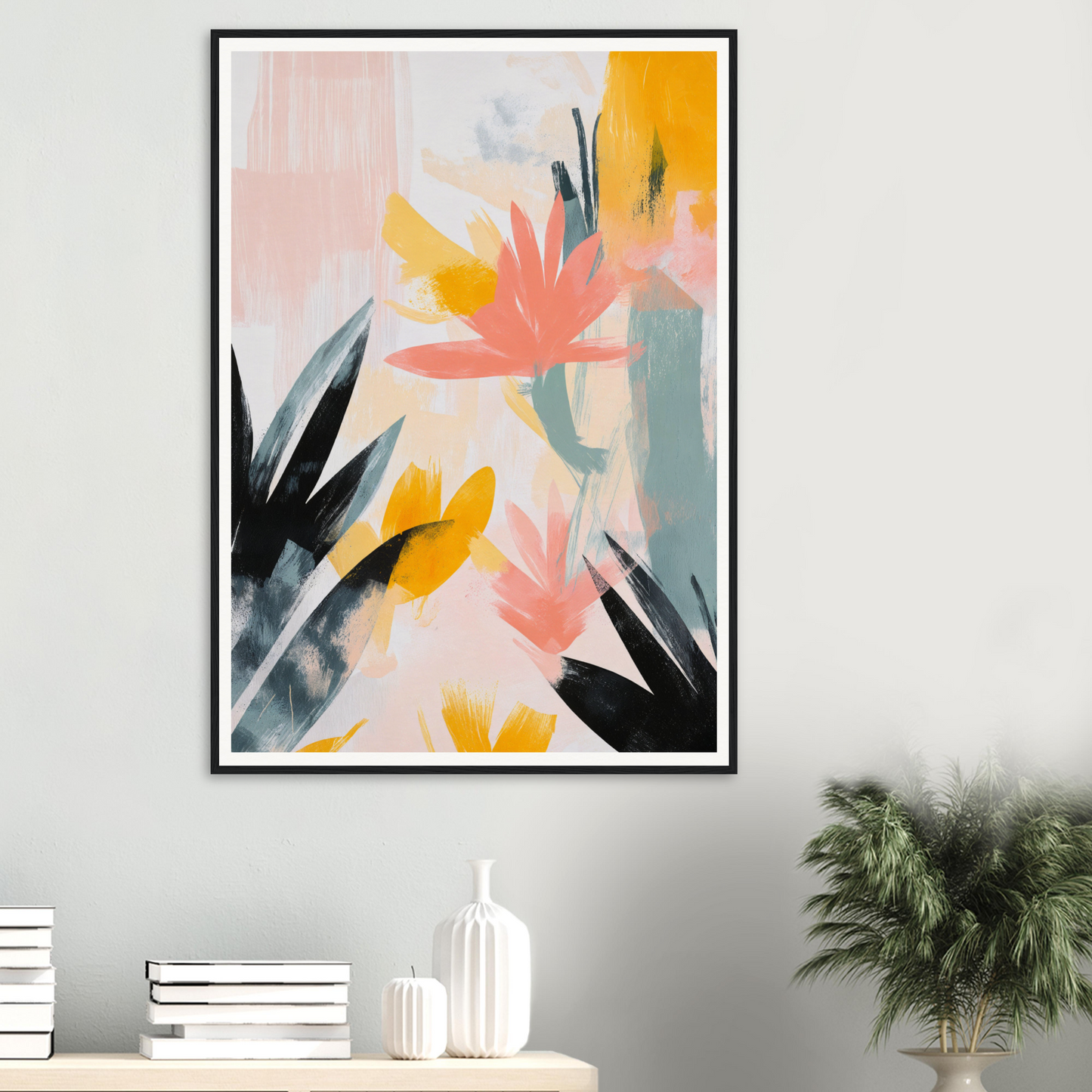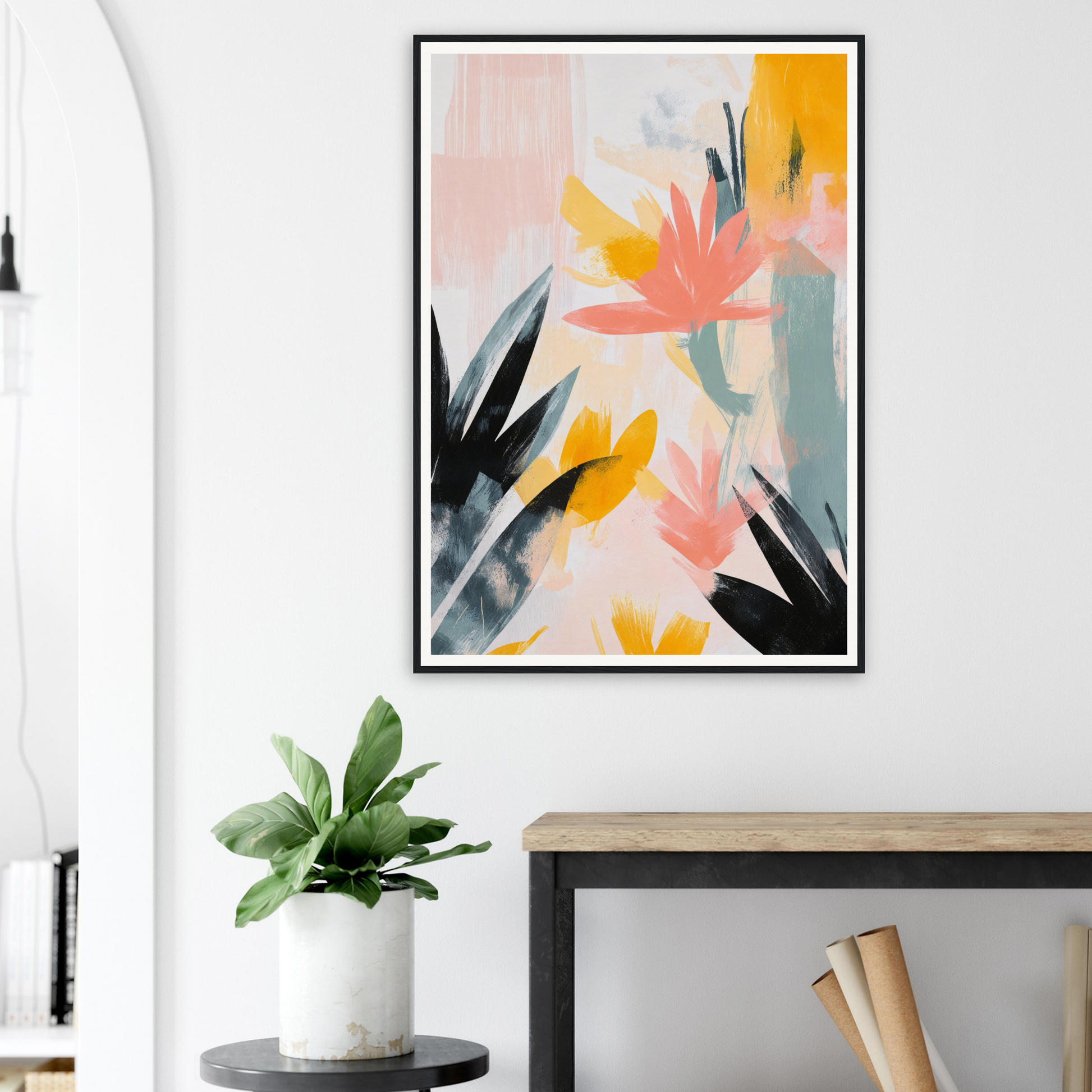 Immerse yourself in a palette of warmth and vitality. The soft pink background, intertwined with vivid yellow, coral, deep blacks, and teal, forms a harmonious abstract floral and leaf theme that encourages both serenity and lively contemplation.