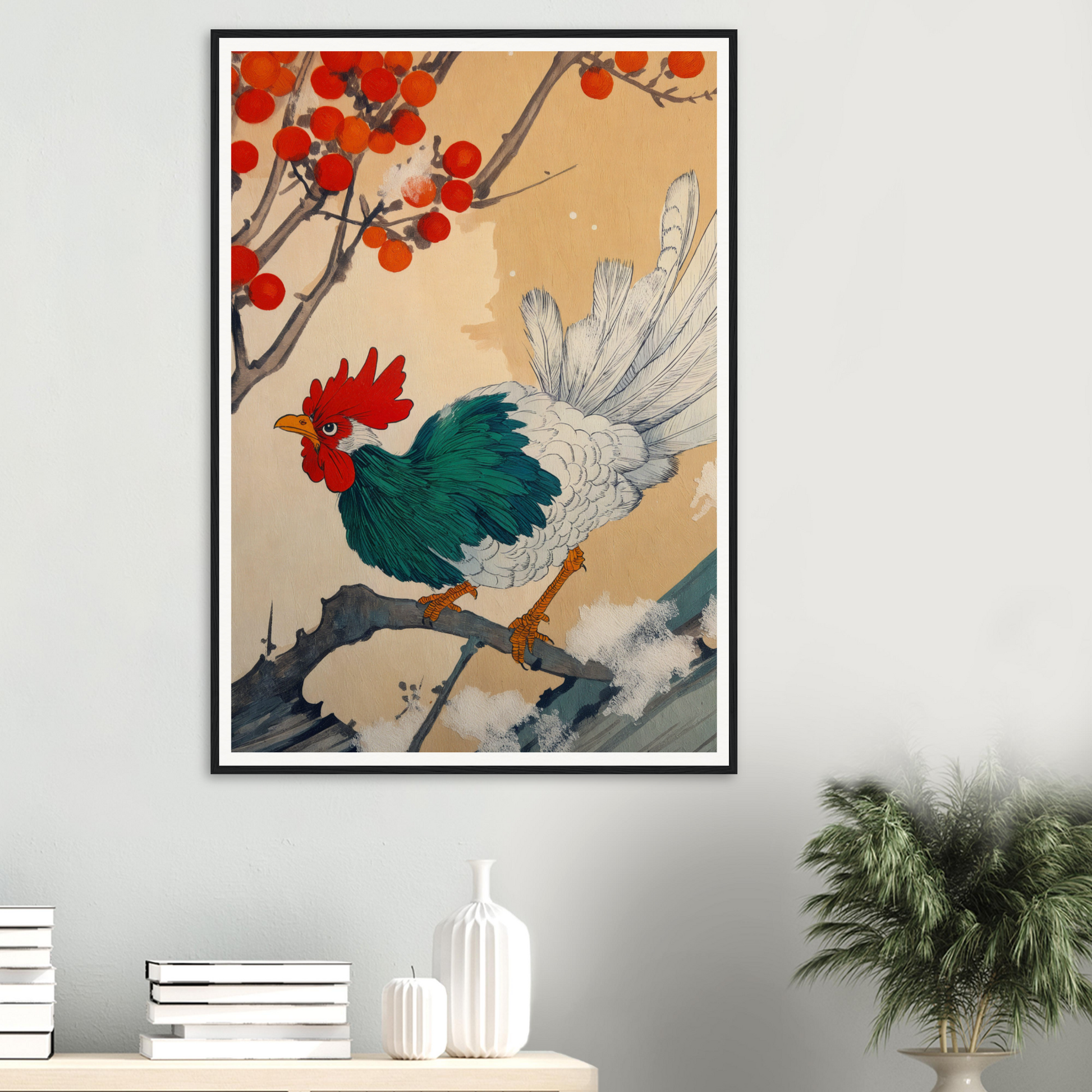 The essence of "Rooster's Dawn Blur" rests in its captivating hues: a serene cream beige backdrop animates the lively palette of vibrant greens and daring reds upon the rooster, mesmerizing all who view it. This Nihonga-inspired art celebrates seasonal abundance and the tranquility of nature, perfect for your living room, study, or any sanctuary of gentle reflection.