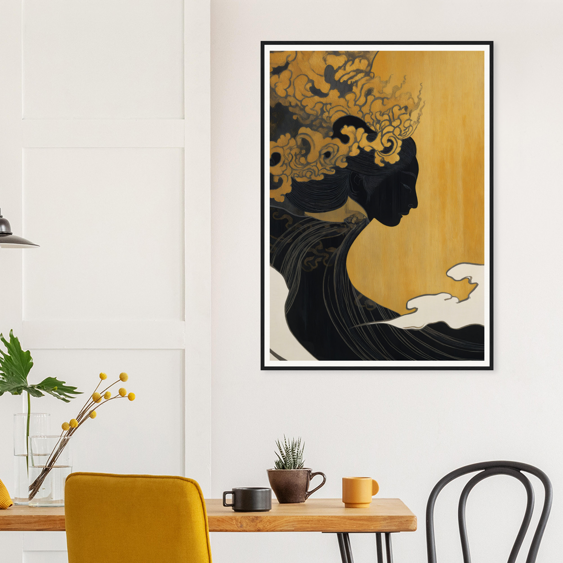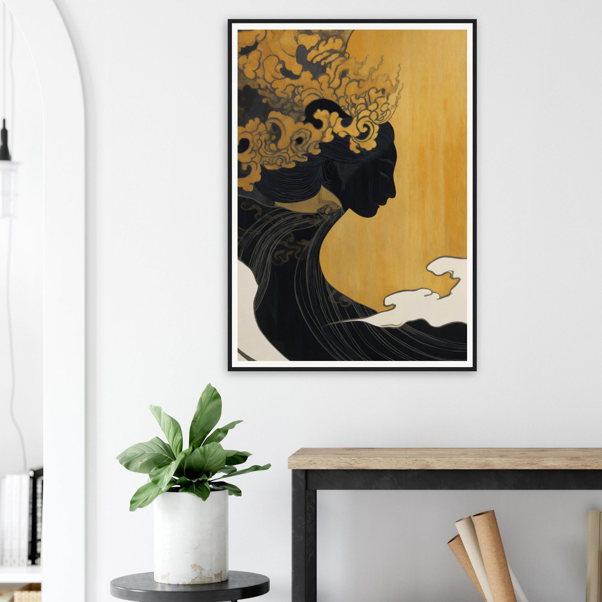 This artwork seamlessly integrates into diverse settings, from classic living rooms to bohemian studios or contemporary offices. Its regal gold tones and serene aesthetic offer a striking contrast against neutral walls, particularly enhancing spaces with warm and deep palettes.
