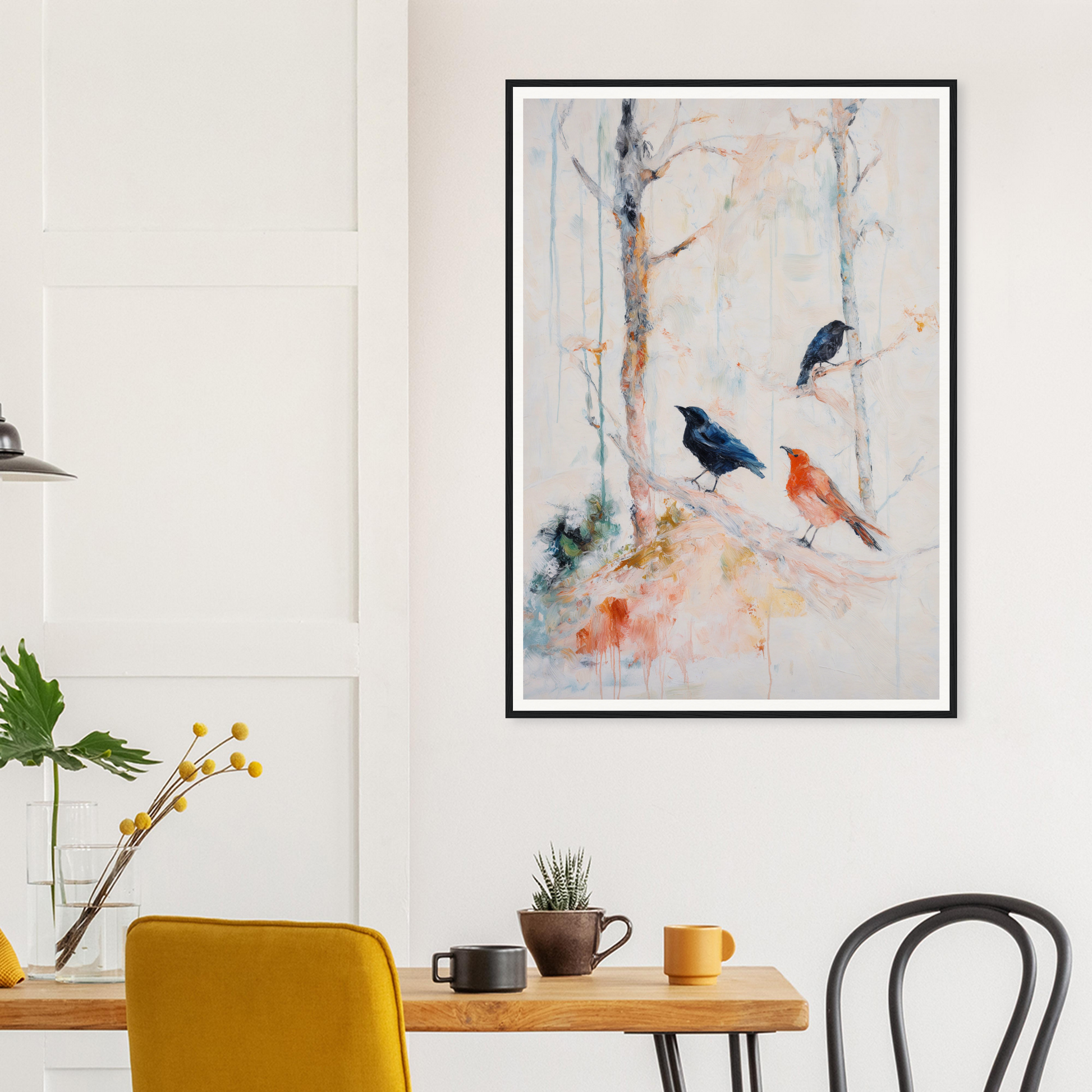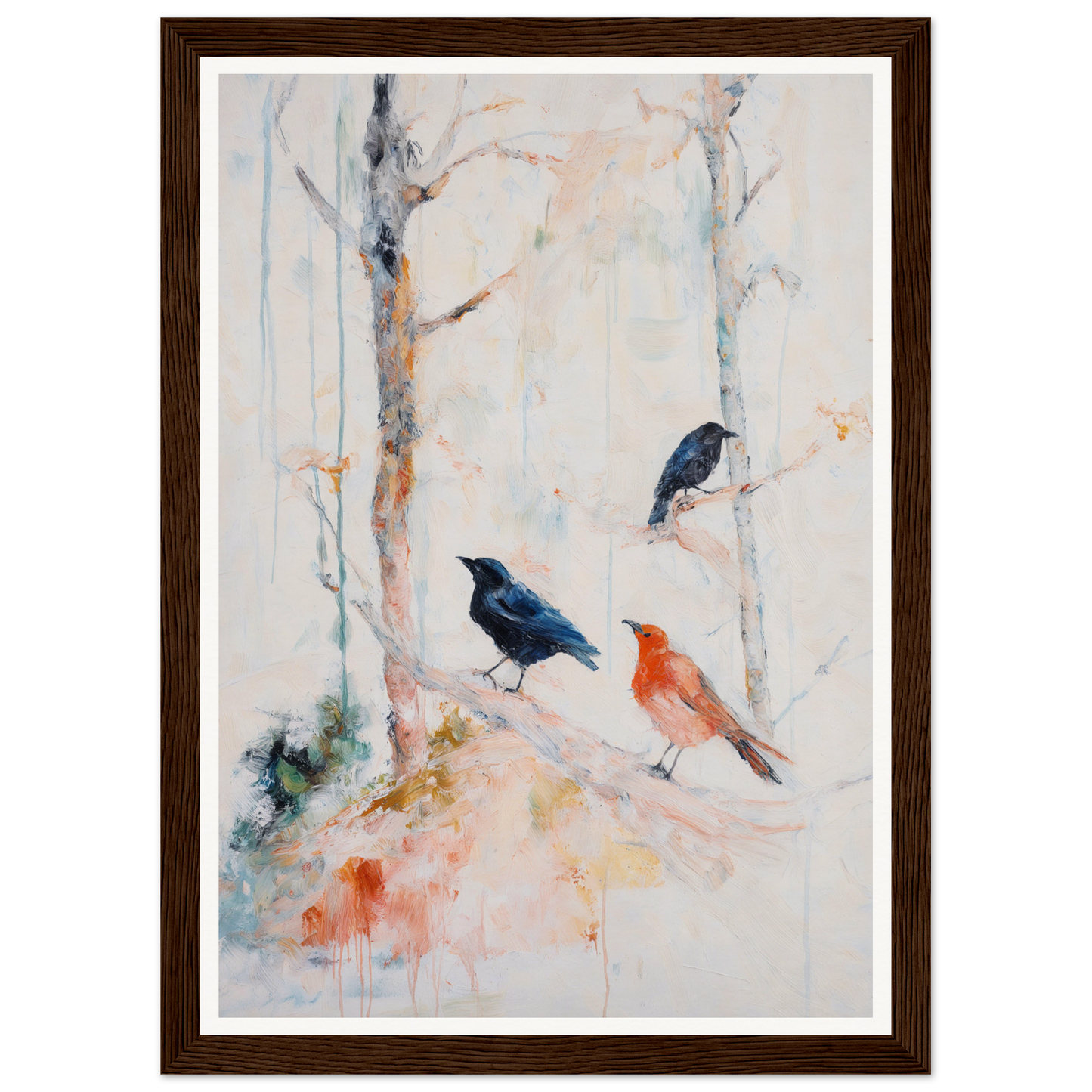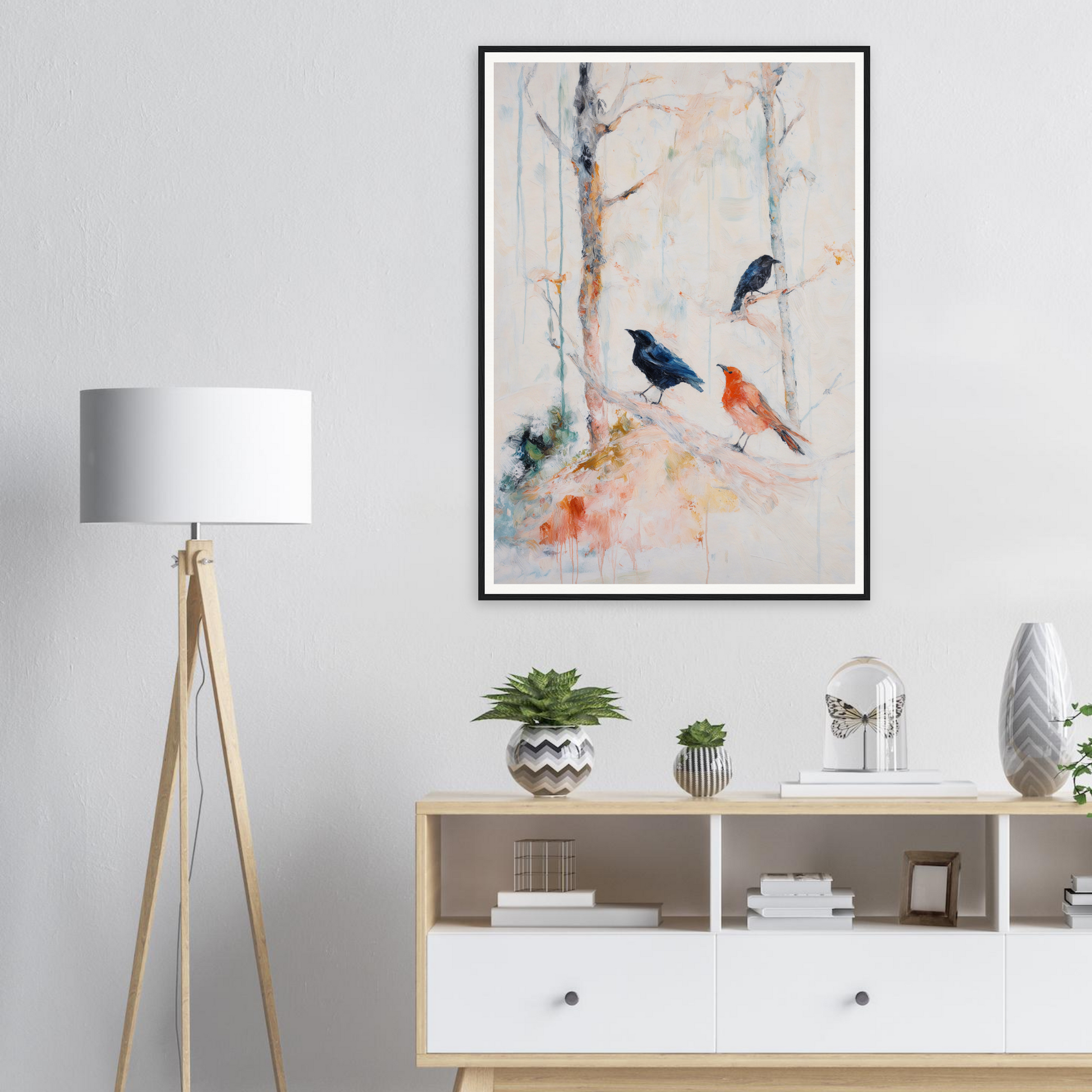 Envision a tranquil haven where art meets imagination, unfolding the beauty of nature in its purest form. The Avian Cantata Symphony framed canvas wall art encapsulates this ethos, elegantly capturing the serenity of three birds graced upon tree branches, reminiscent of a silent woodland harmony brushed into a timeless masterpiece.