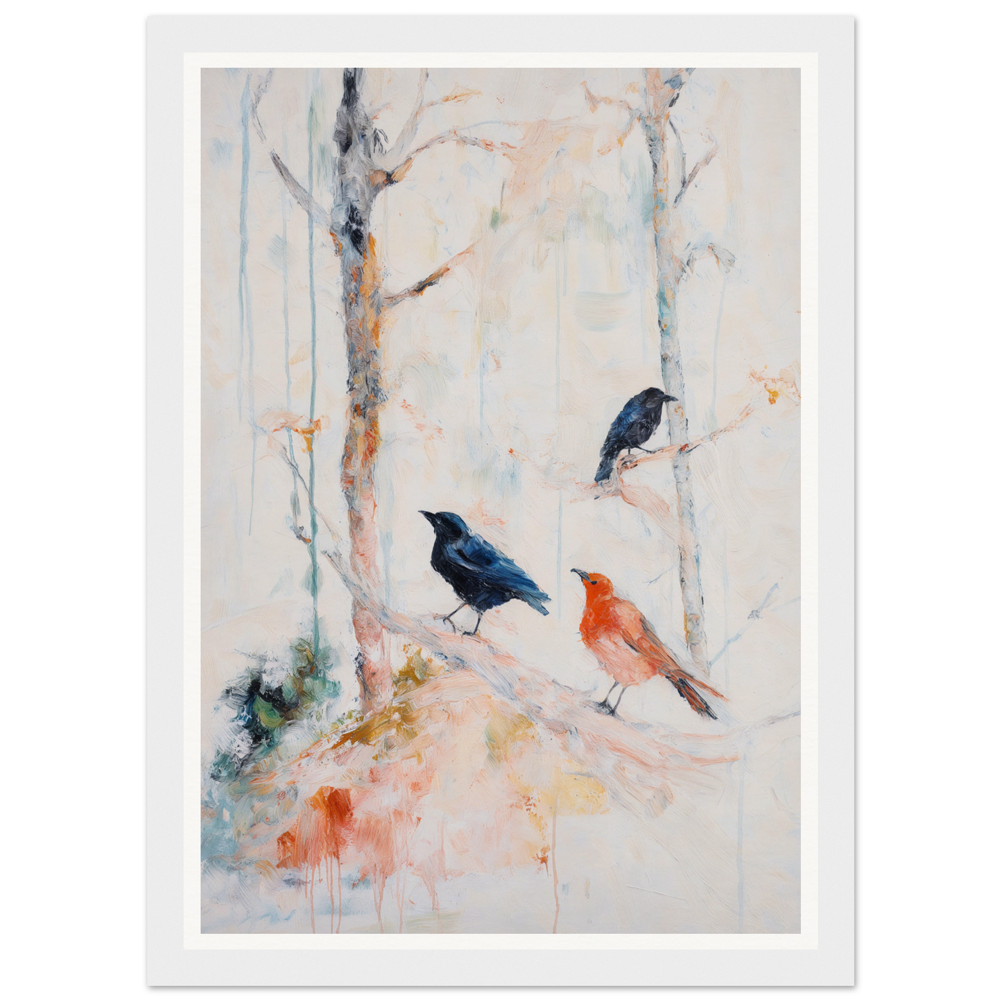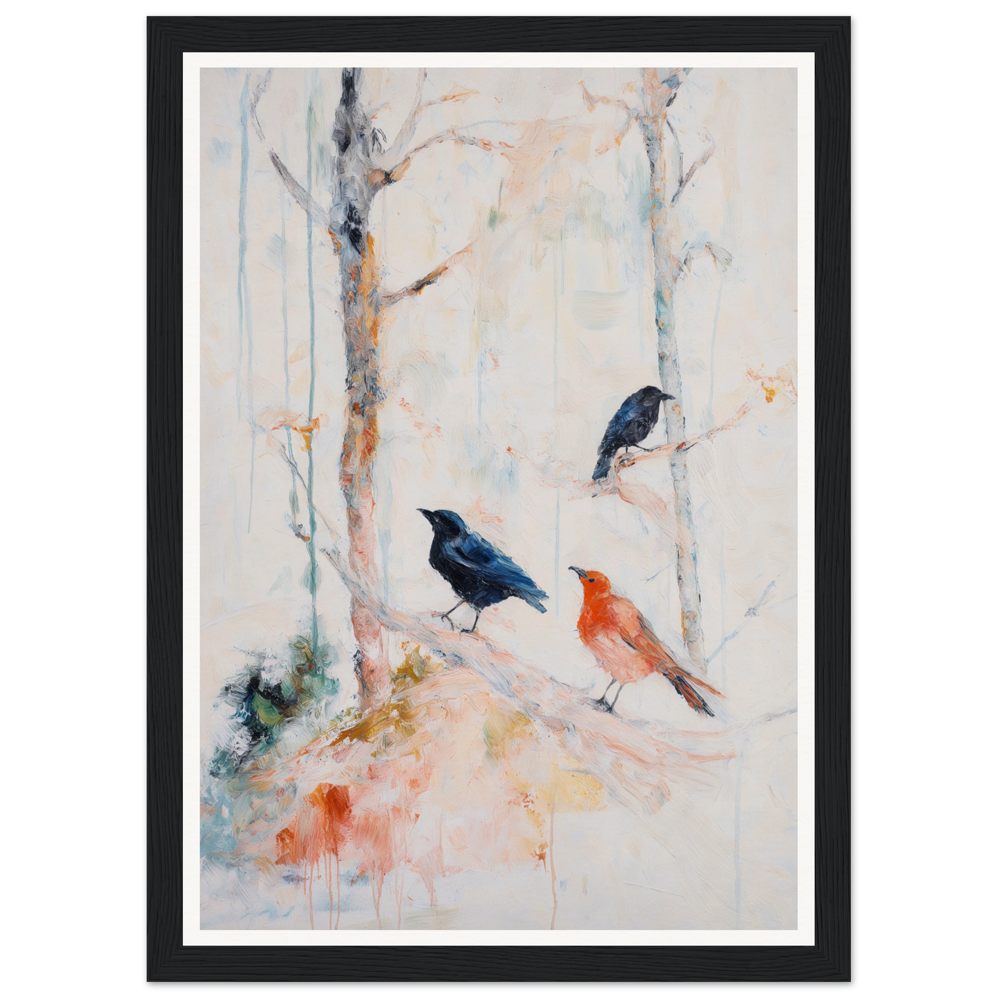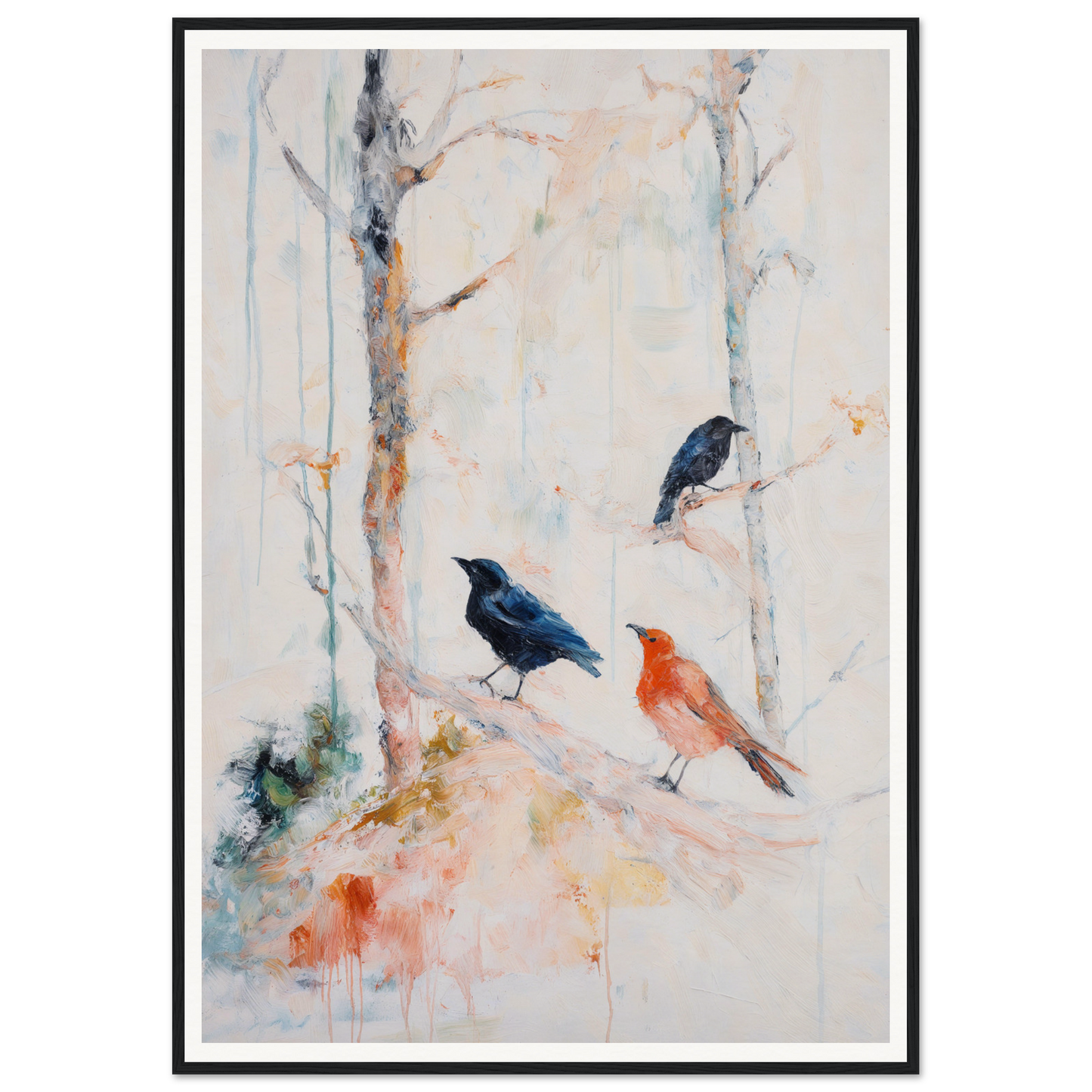 Envision a tranquil haven where art meets imagination, unfolding the beauty of nature in its purest form. The Avian Cantata Symphony framed canvas wall art encapsulates this ethos, elegantly capturing the serenity of three birds graced upon tree branches, reminiscent of a silent woodland harmony brushed into a timeless masterpiece.