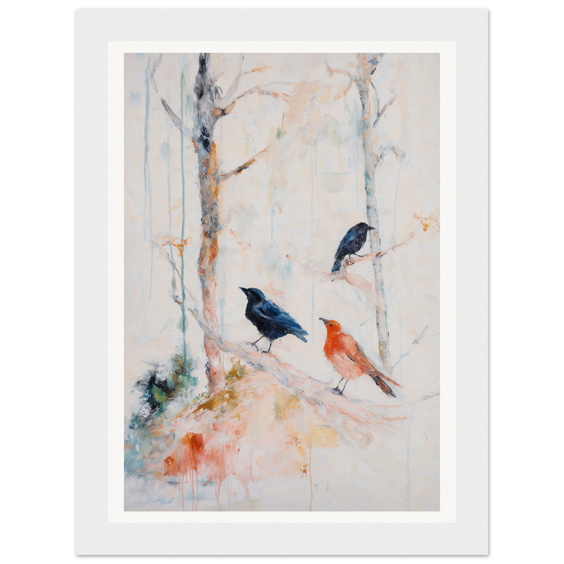 Designed with a subtle and cohesive color palette, this artwork is surrounded by soft, muted creams, creating a serene backdrop for the deep blues and rich blacks of the birds that contrast beautifully with warm oranges and reds in the foliage. This kaleidoscope of earthy tones adds warmth, tranquility, and a touch of nature’s splendid harmony to any modern or bohemian decor style.