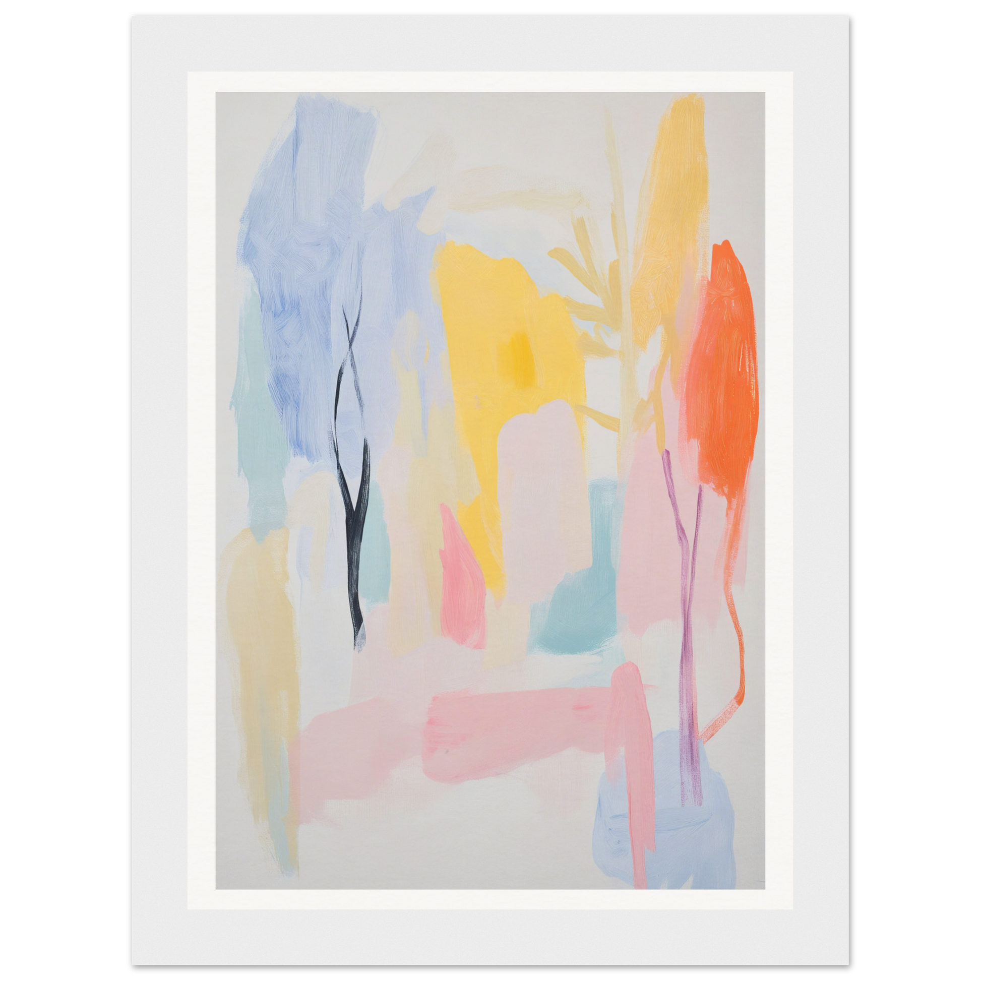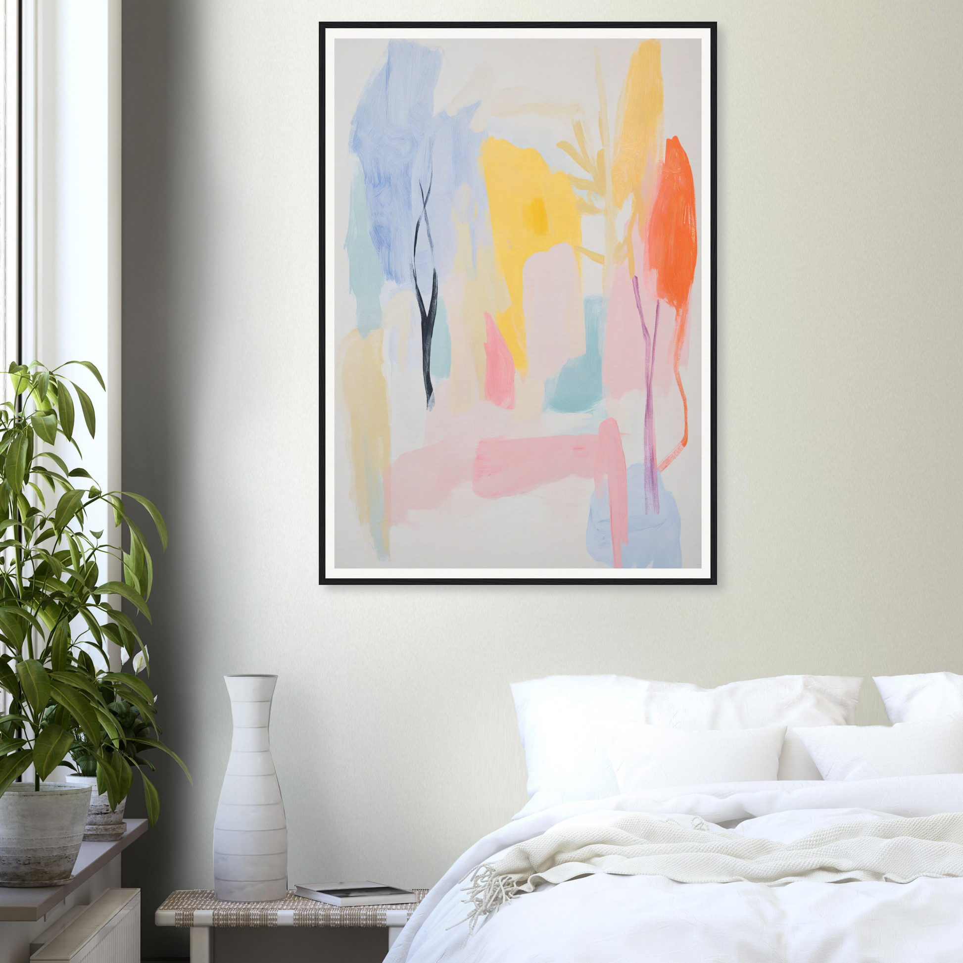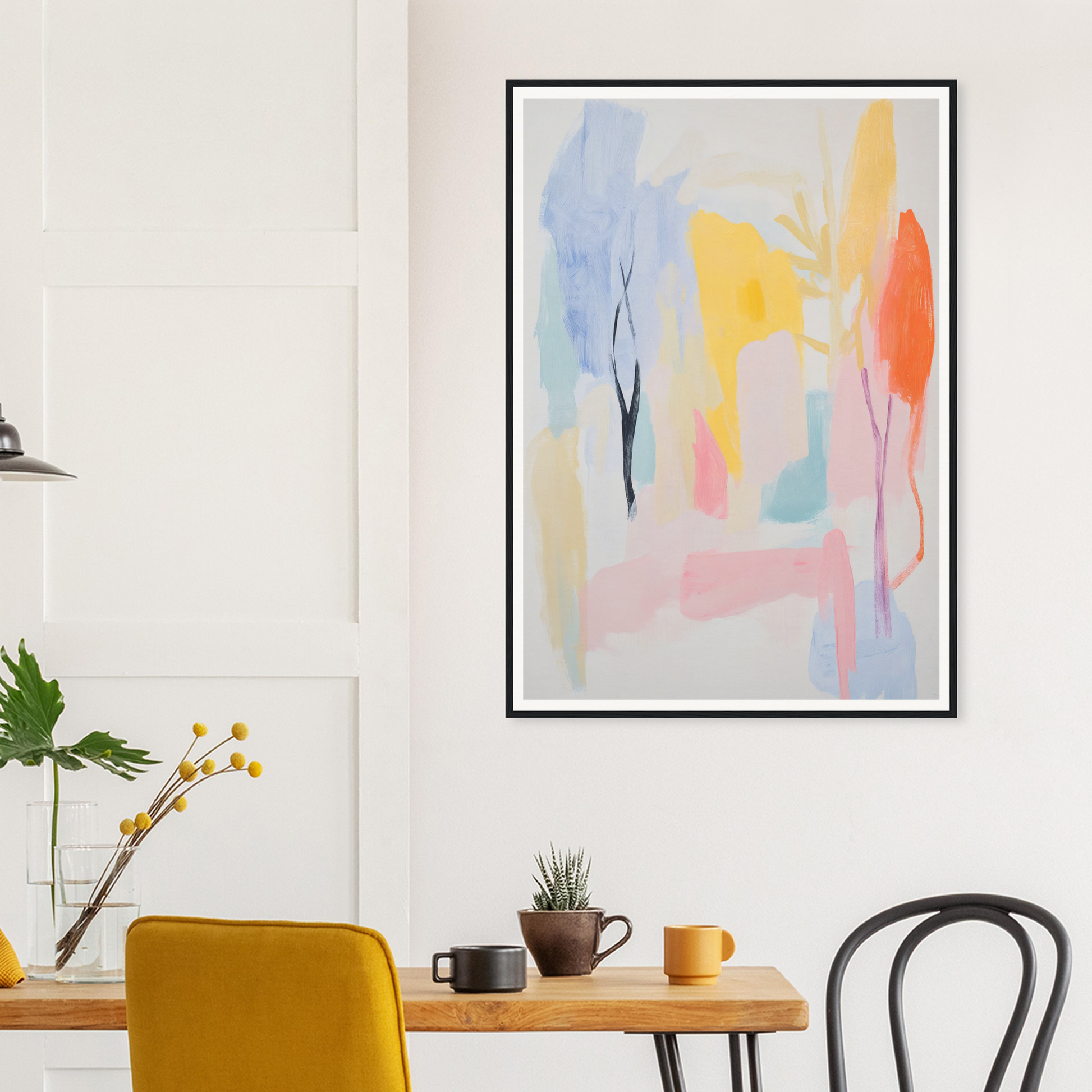 Imagine being enveloped in soft pastel pinks and serene pale blues. This captivating artwork, also incorporating gentle splashes of soft yellow, lavender, and light coral against a muted beige backdrop, constructs a dreamlike palette that whispers peace and elegance. Perfect for modern living rooms or minimalist bedrooms where calm meets style.