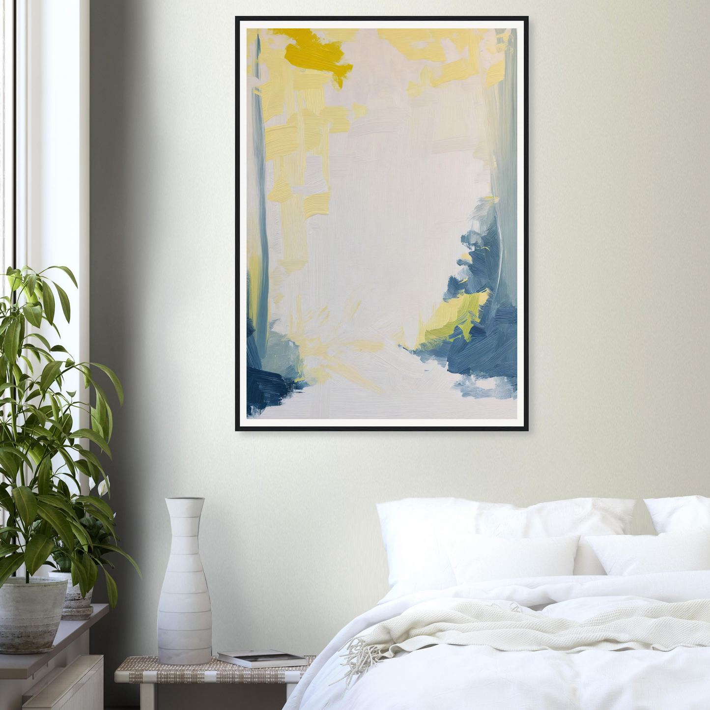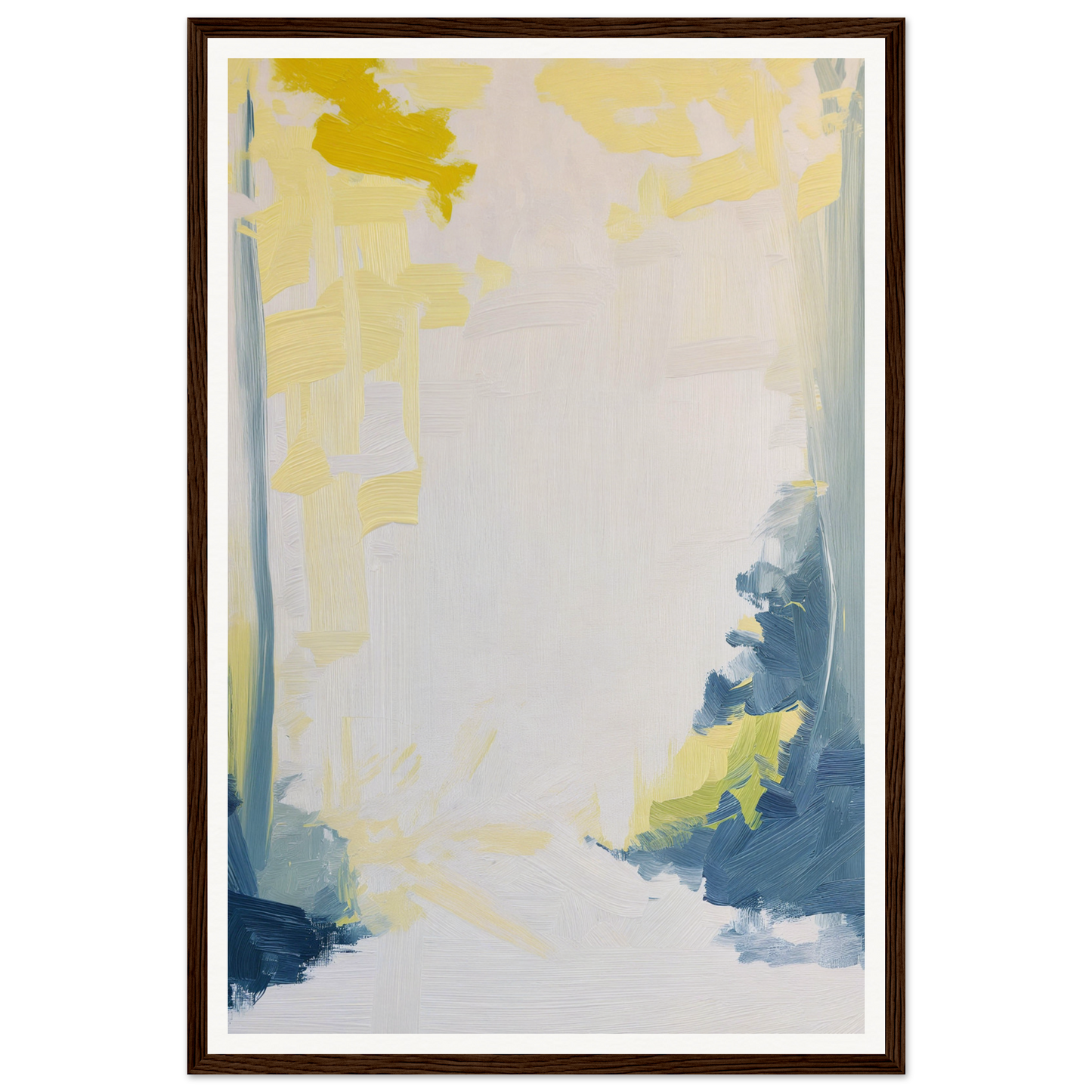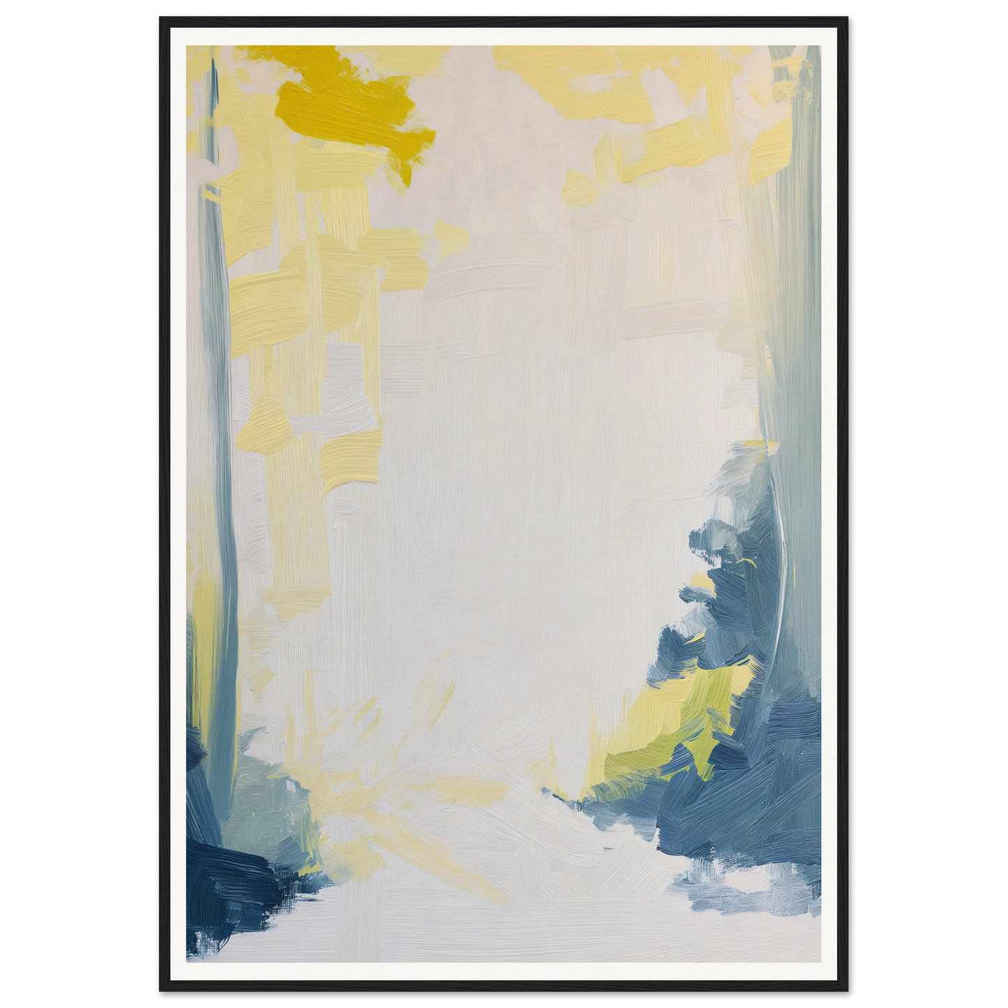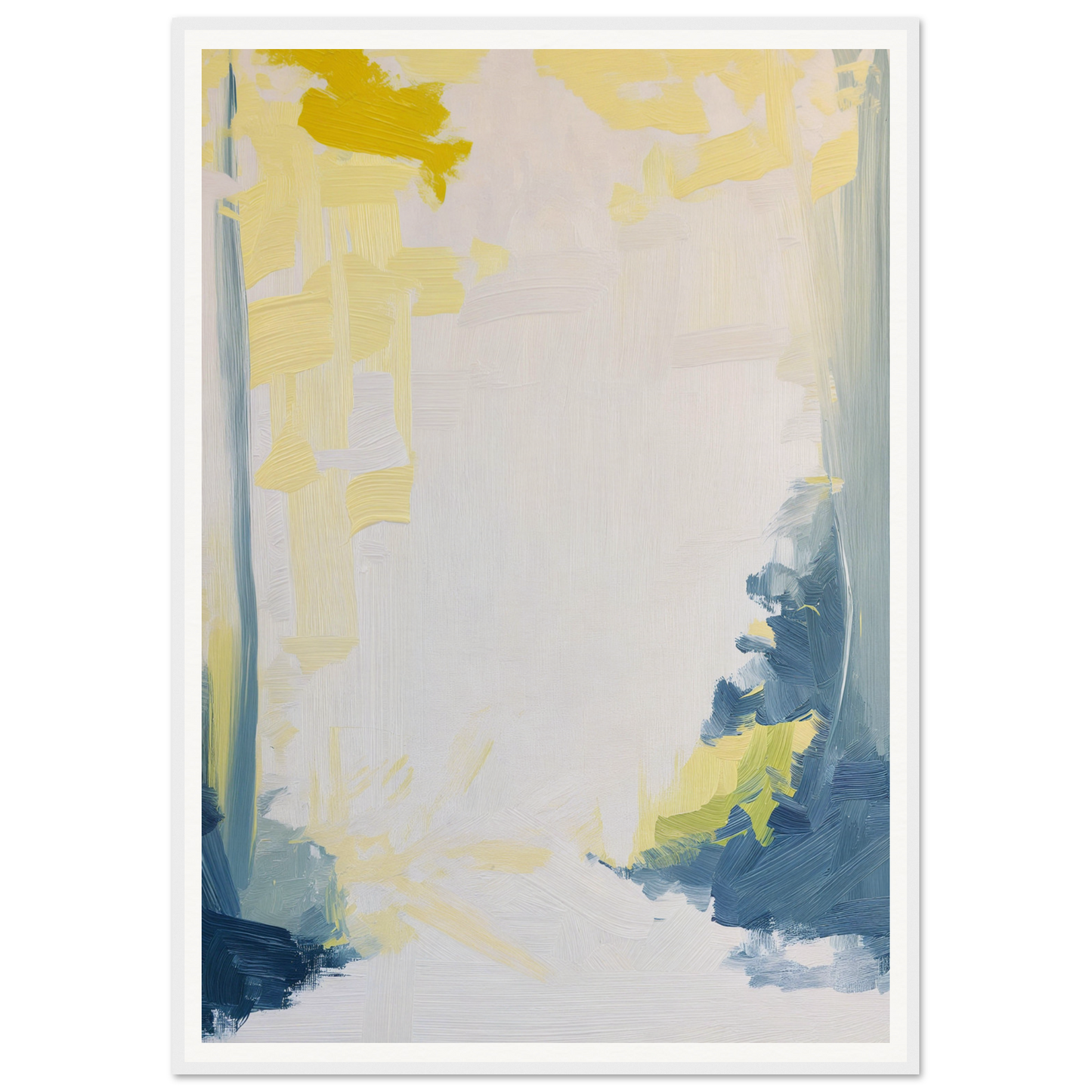 This artwork embraces a modern abstract style, featuring a delicate harmony of creamy whites, lemon yellows, and pale blues. These hues flow across the canvas, leading you on a poetic journey where warmth meets tranquility. The deeper blues and hints of green add depth and serve as the perfect contrast, inviting contemplation and a sense of awakenings past and new.