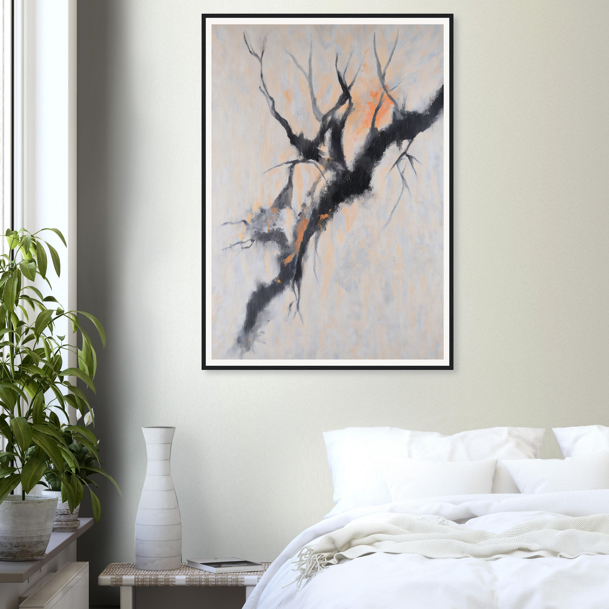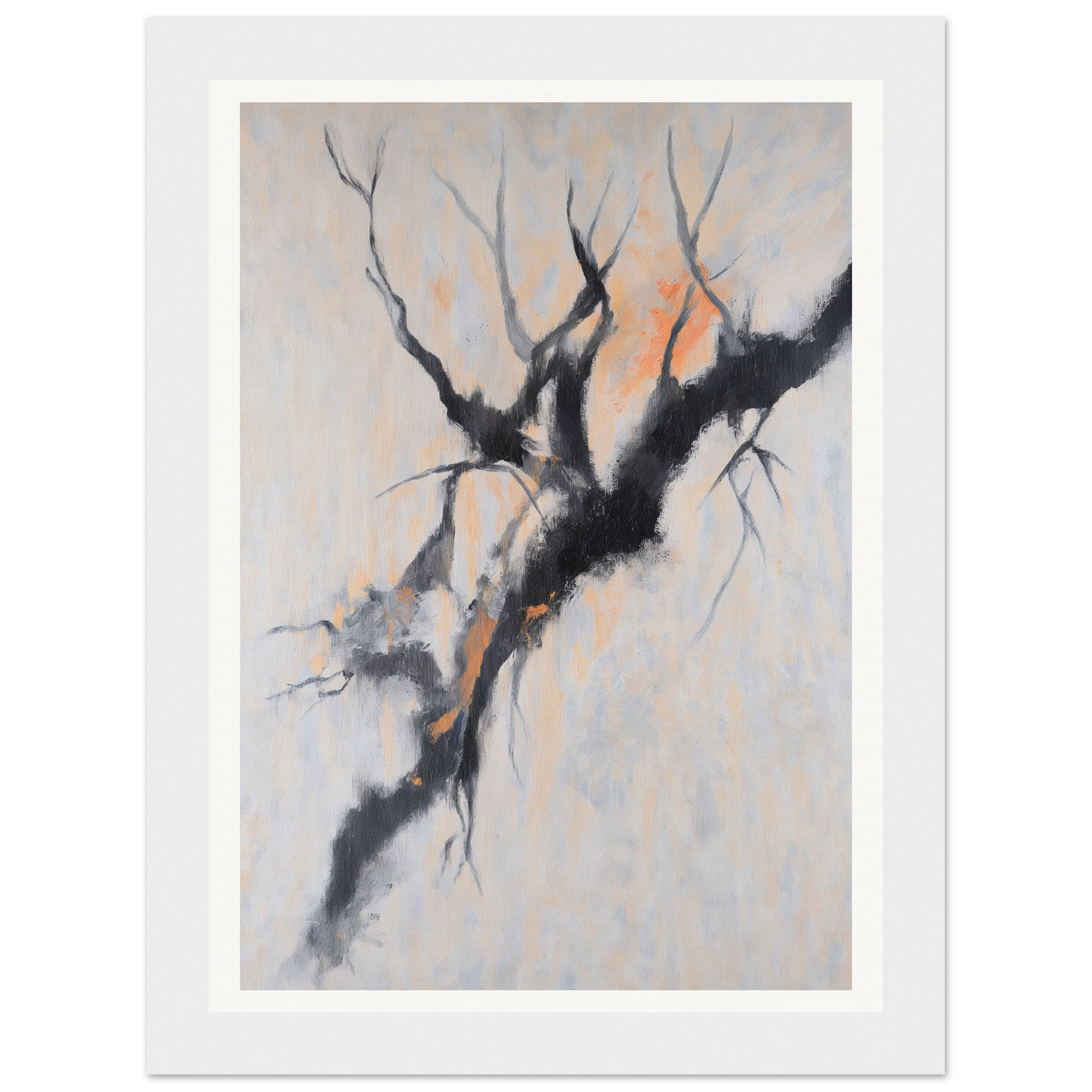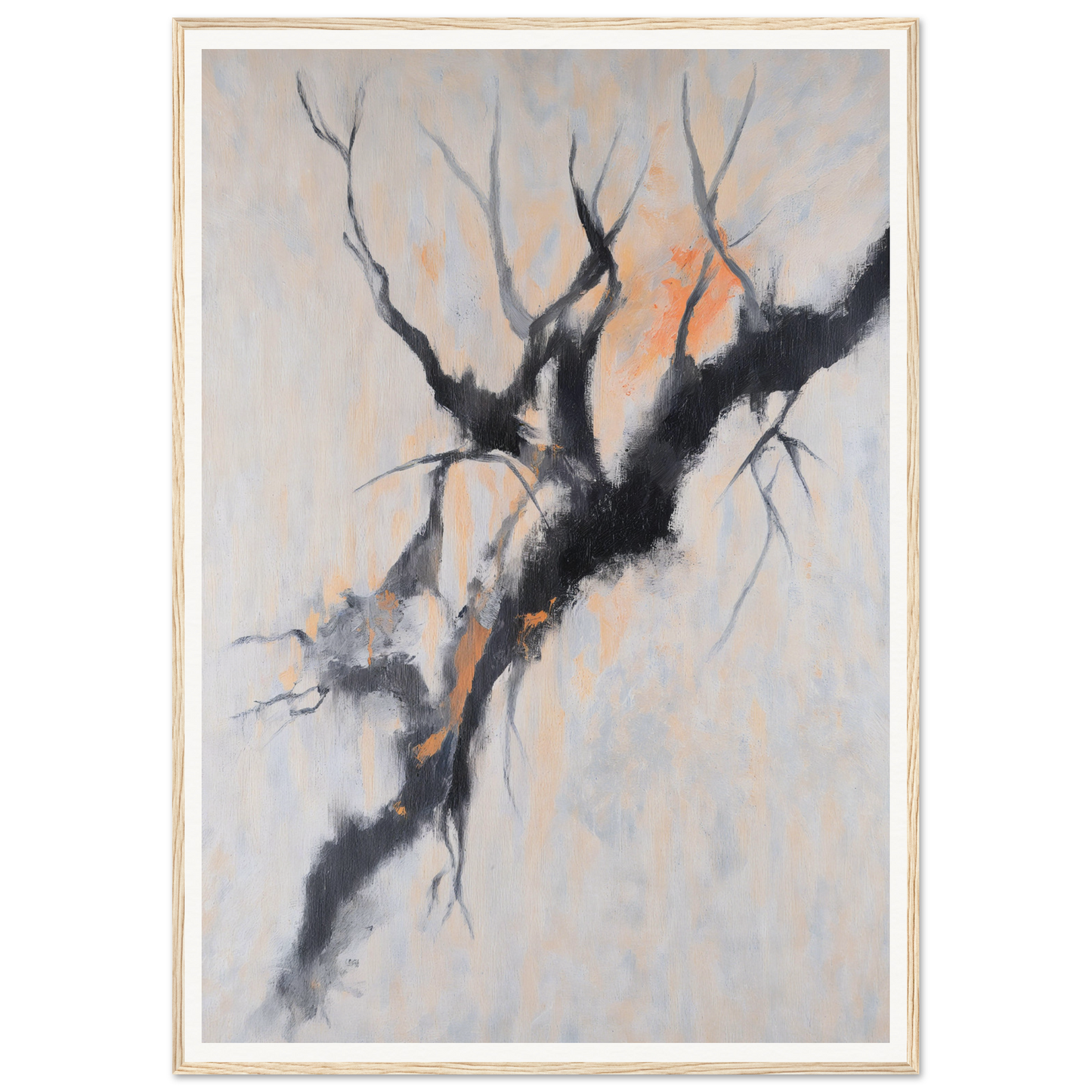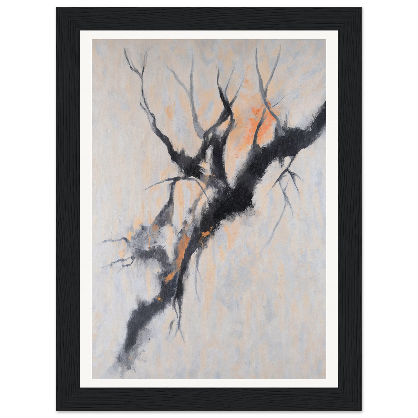 The canvas presents a mesmerizing composition of stylized tree limbs, inviting you into a visual symphony where every stroke conveys resilience and vitality. Predominantly black in palette, the branches command bold presence, complemented by soft orange highlights that breathe life into the scene. Subtle washes of gray and beige balance the explosion of abstract energy, captivating and serene all at once.