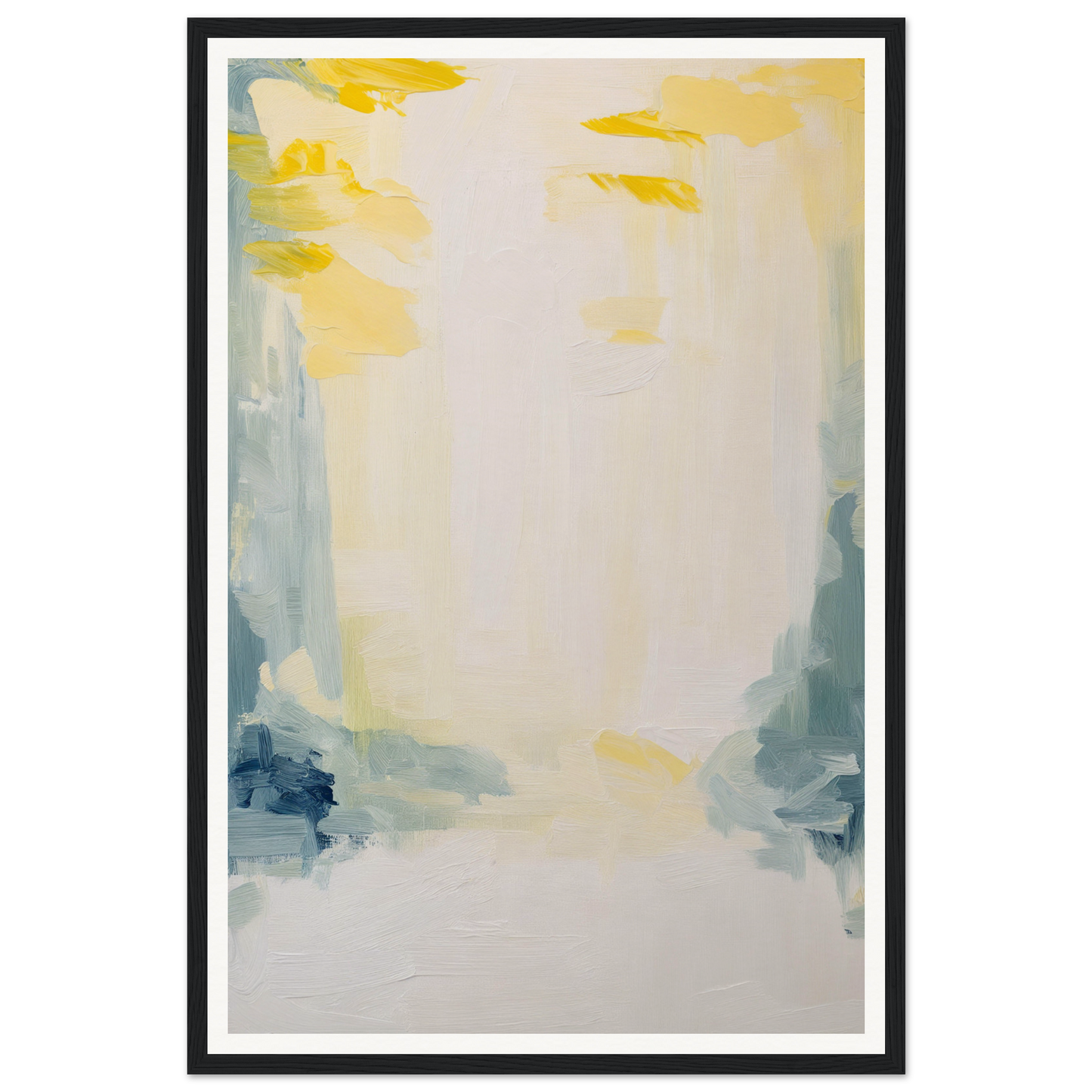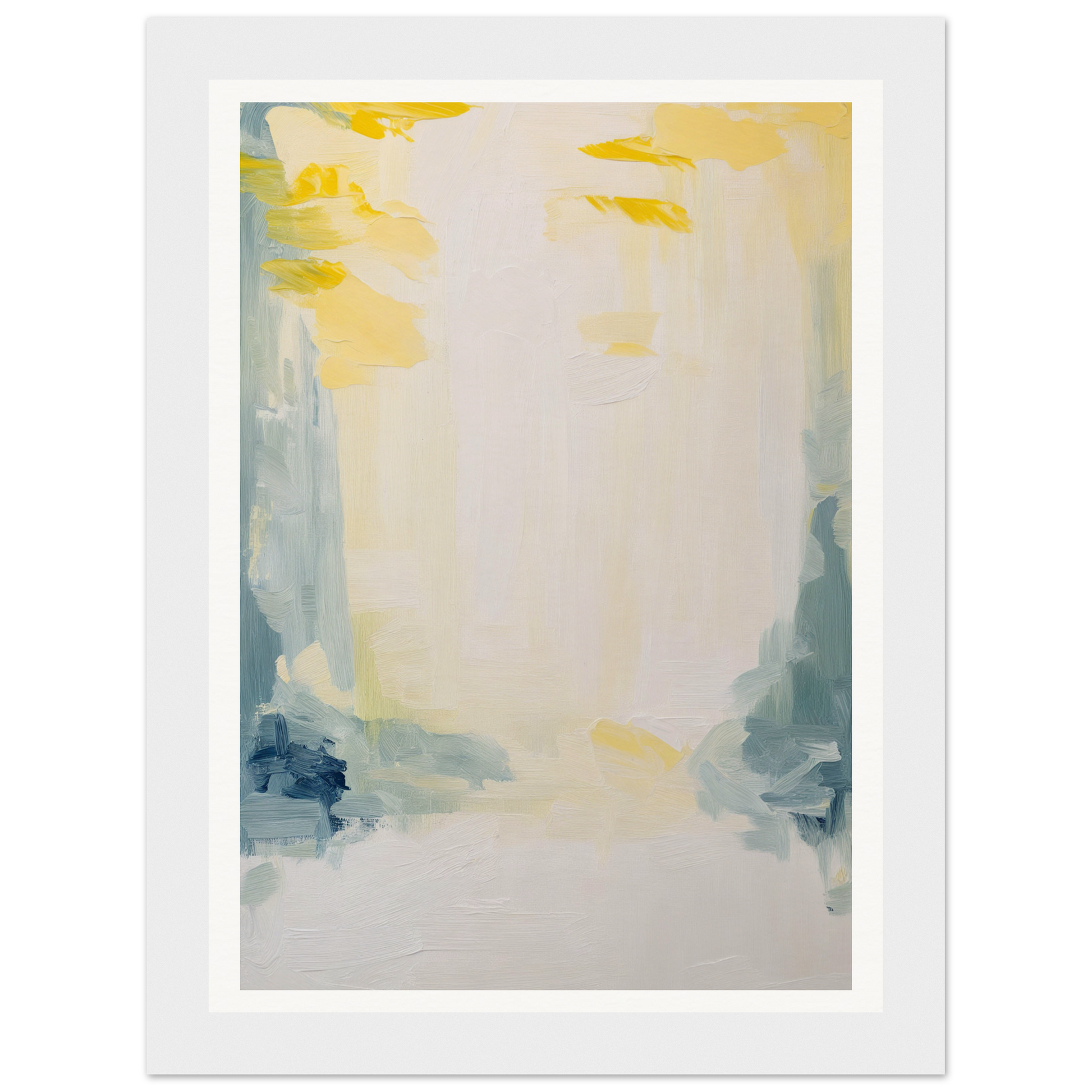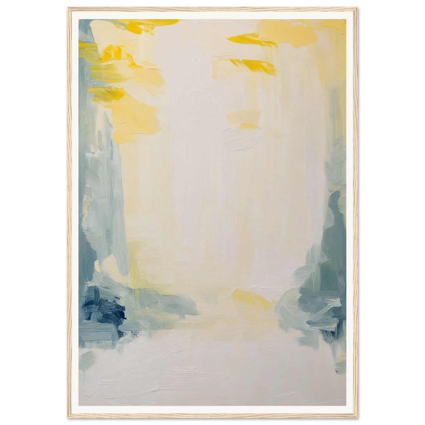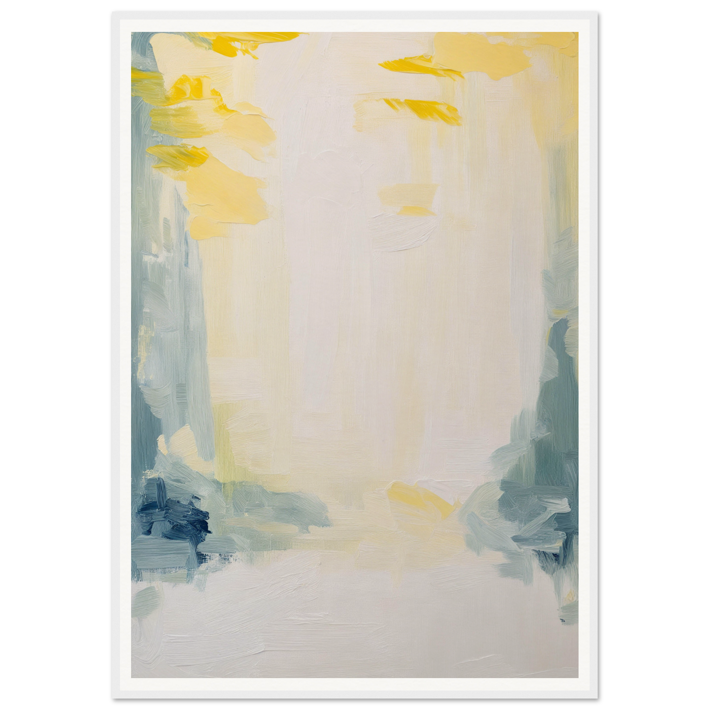 Featuring a soft palette that soothes the senses, this artwork displays sweeping brushstrokes in muted yellows, soft blues, and subtle greens. The dominant warm white cream offers an expansive canvas, inviting quiet contemplation and emotional resonance.
