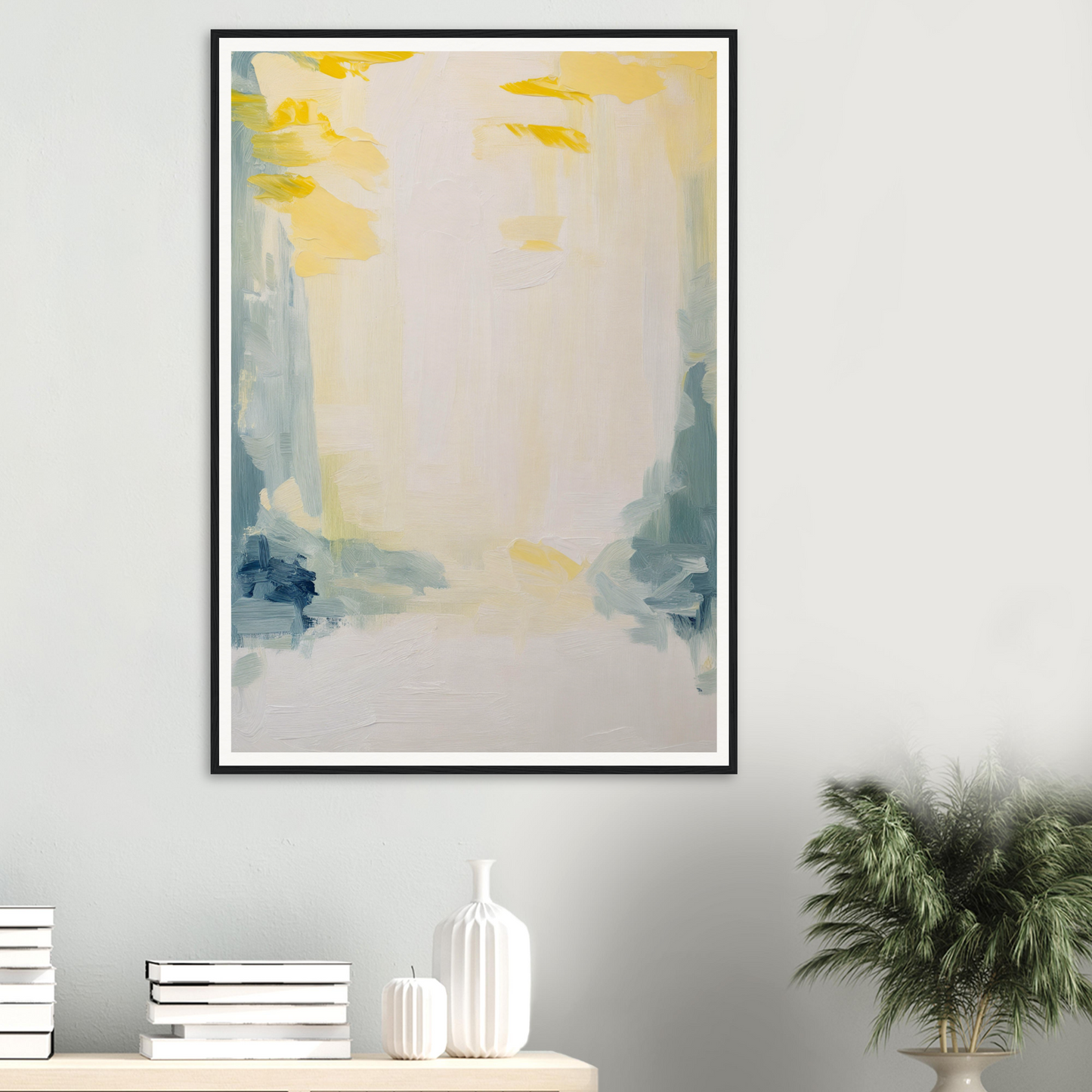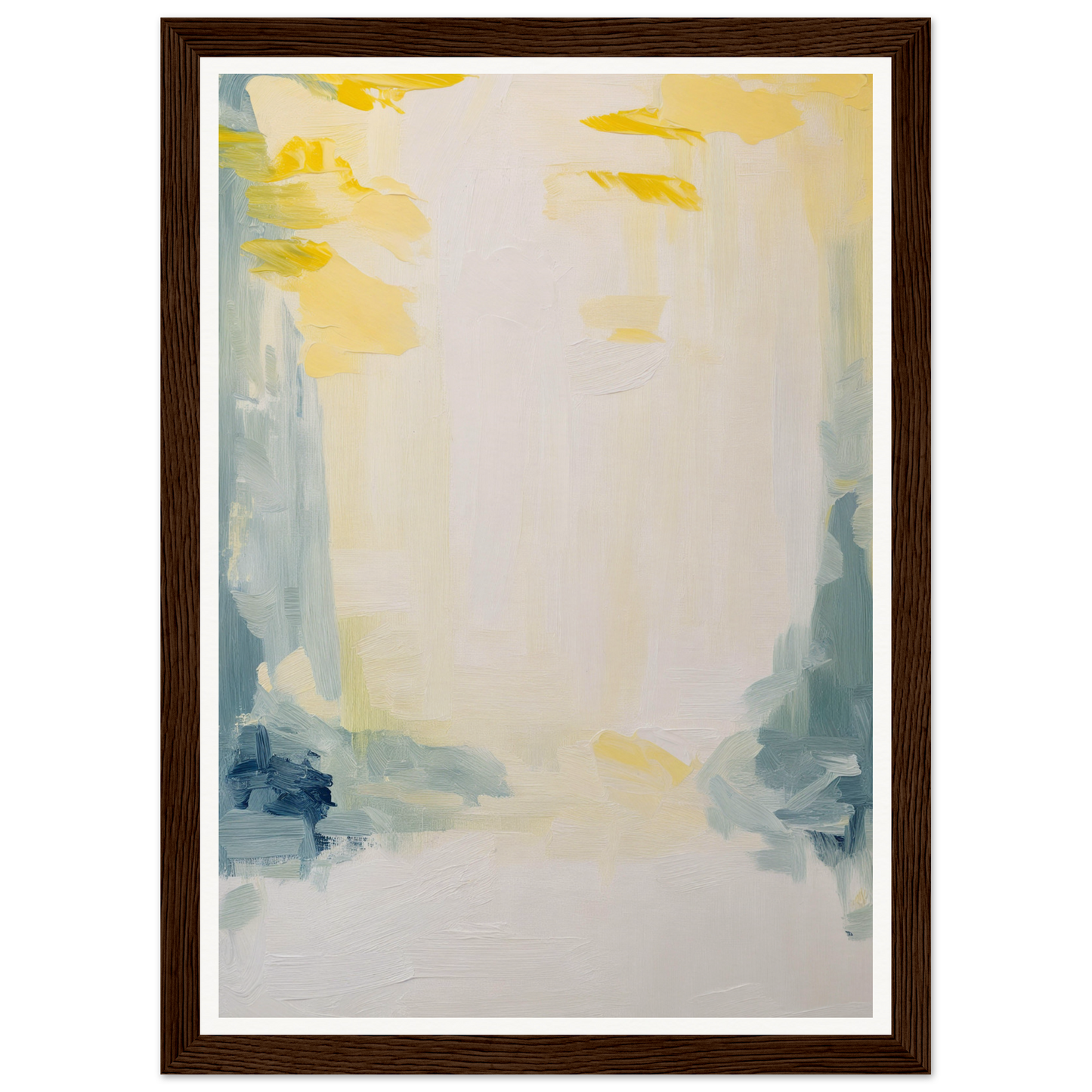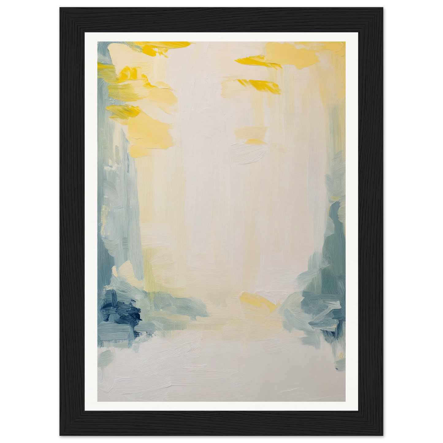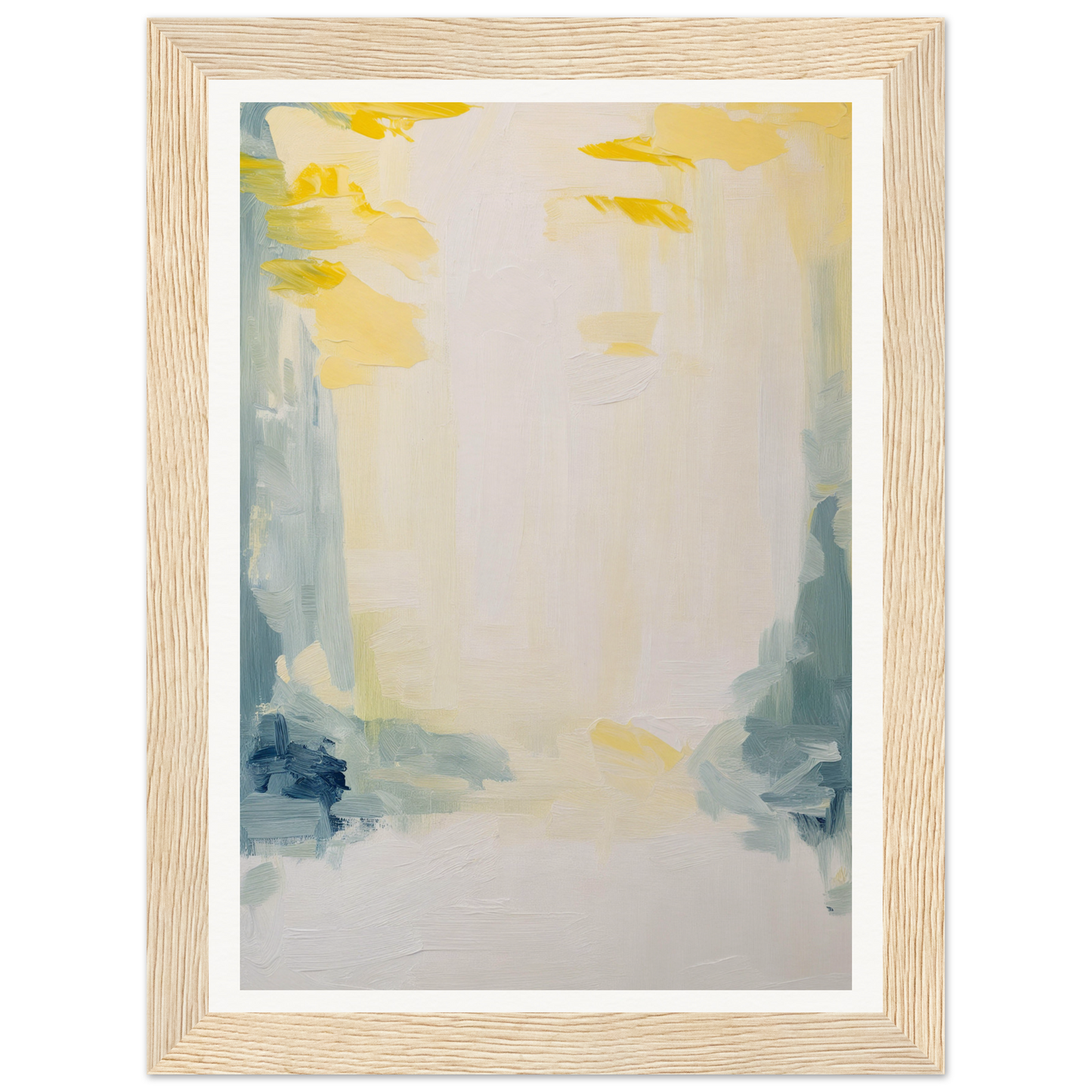 Featuring a soft palette that soothes the senses, this artwork displays sweeping brushstrokes in muted yellows, soft blues, and subtle greens. The dominant warm white cream offers an expansive canvas, inviting quiet contemplation and emotional resonance.