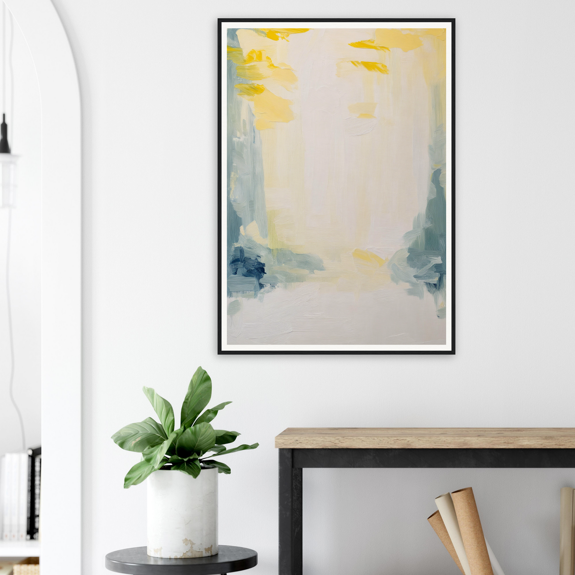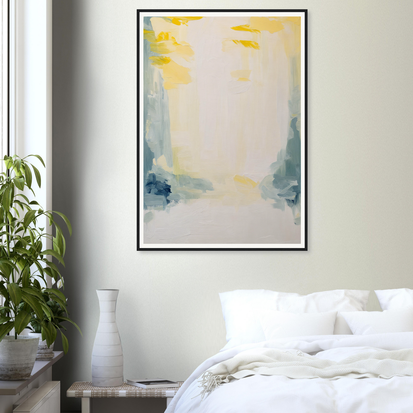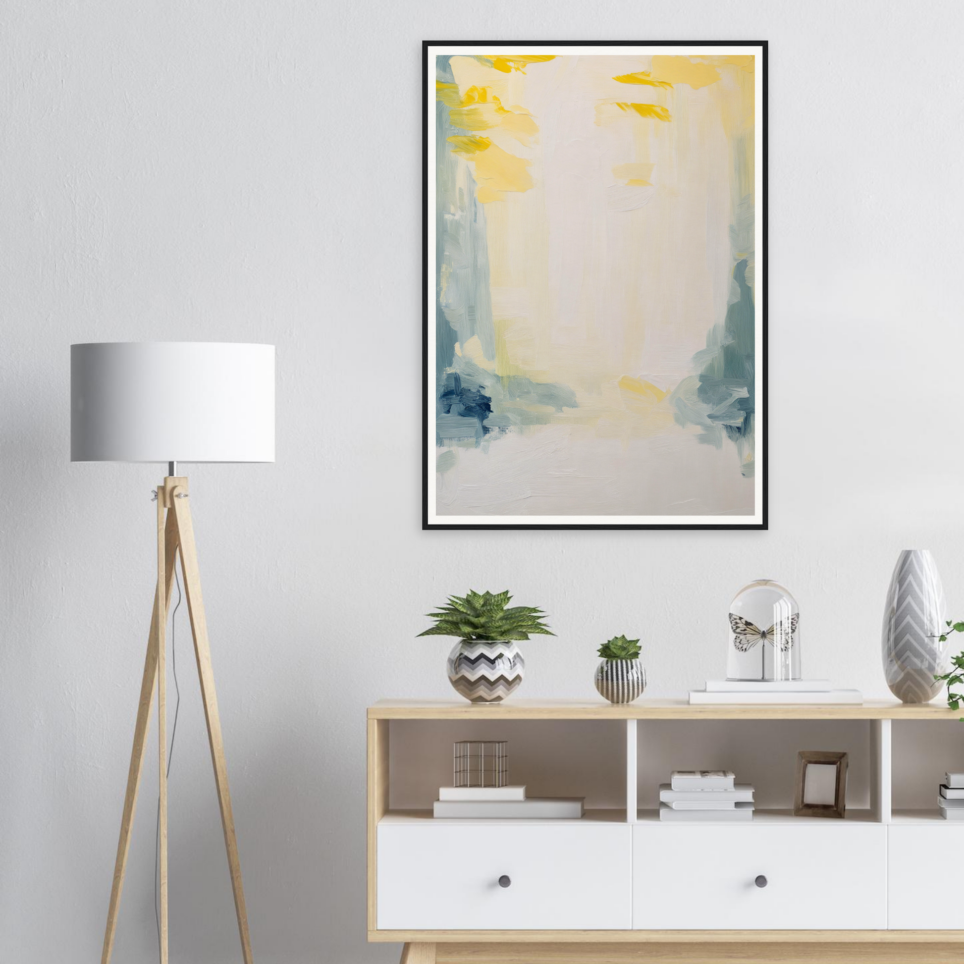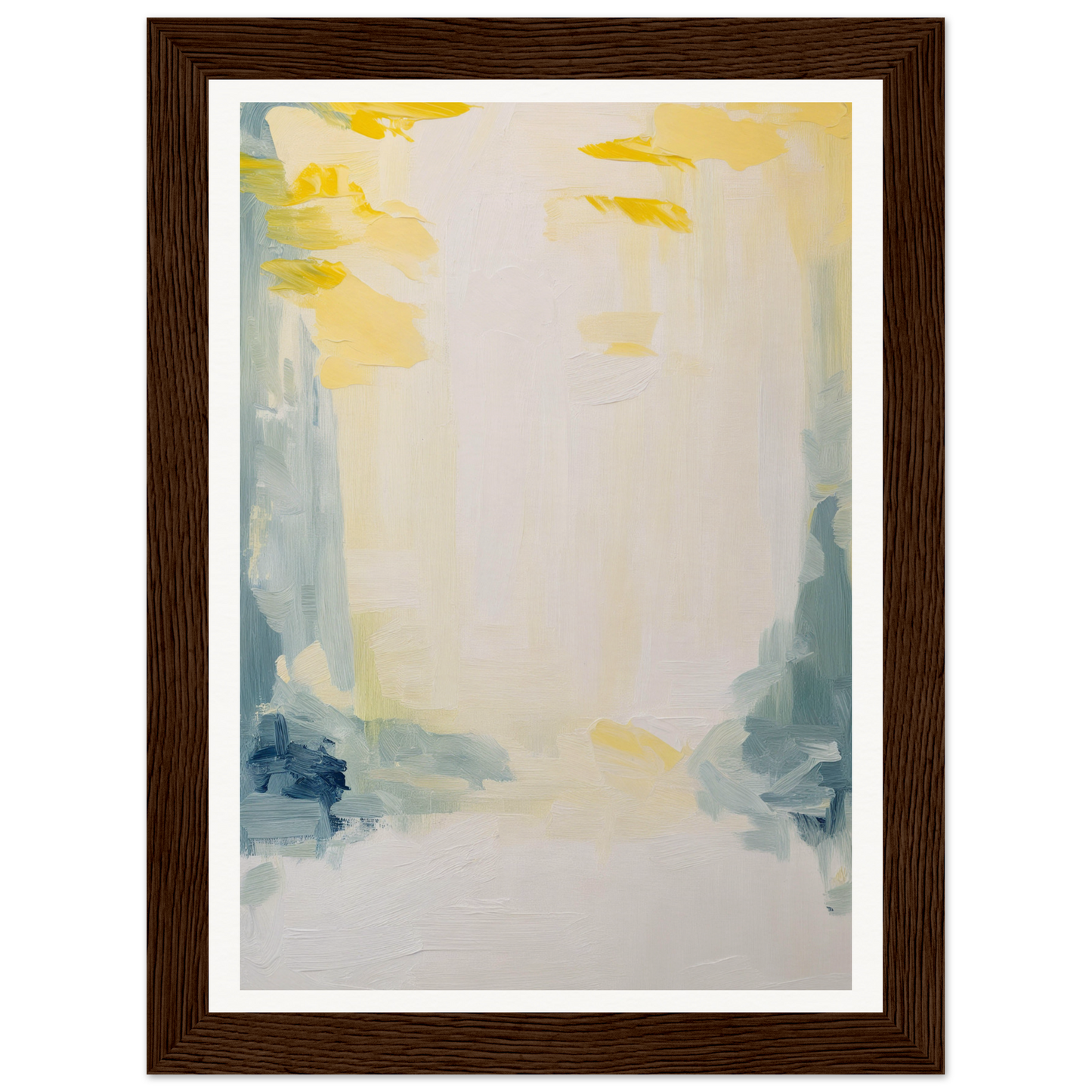 Featuring a soft palette that soothes the senses, this artwork displays sweeping brushstrokes in muted yellows, soft blues, and subtle greens. The dominant warm white cream offers an expansive canvas, inviting quiet contemplation and emotional resonance.