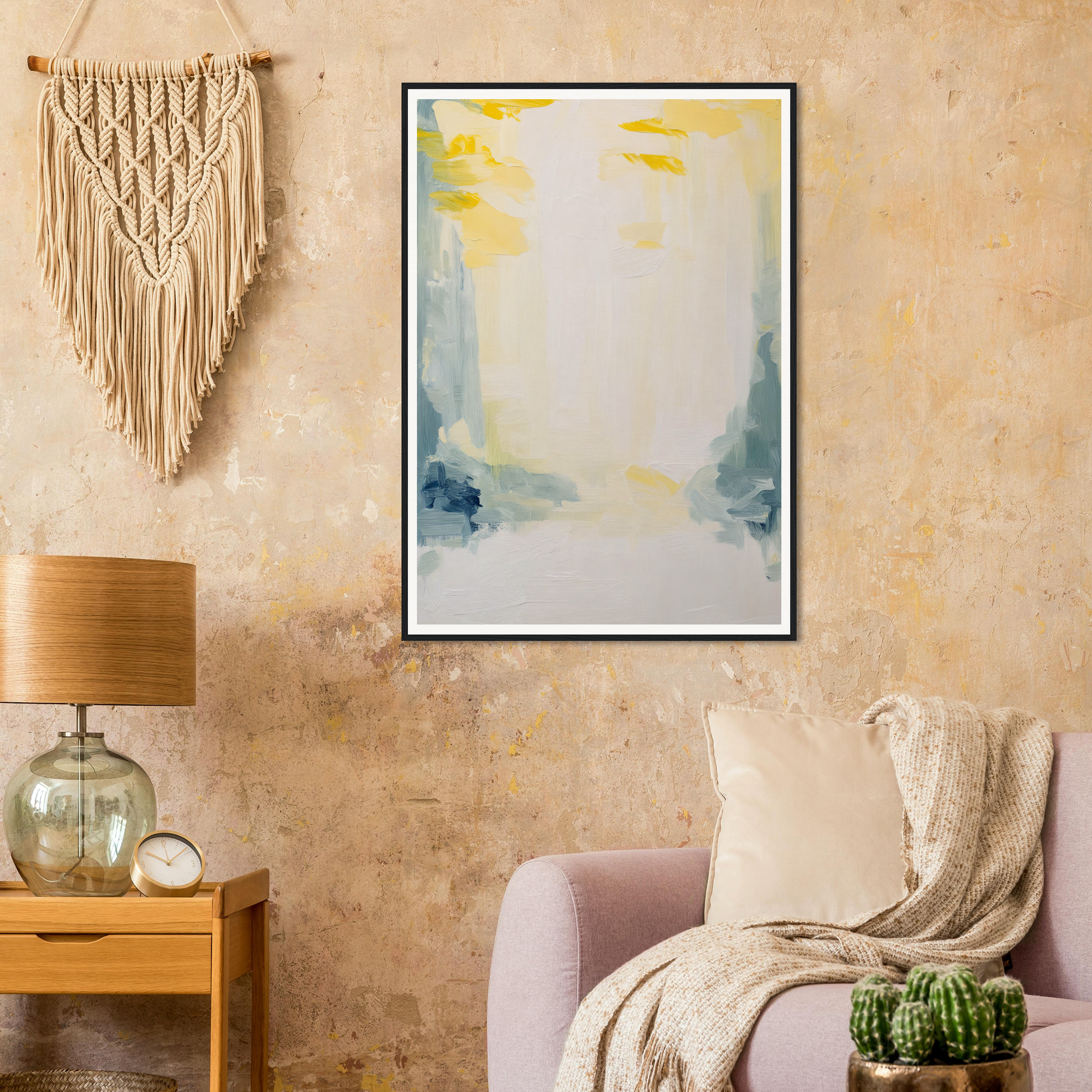 Our frames, custom-made from environmentally committed sources, echo nature's elegance, complementing the art's soft tones and abstract forms. Available in various finishes, each frame adds a unique touch to your decor, from living rooms to tranquil bedrooms.