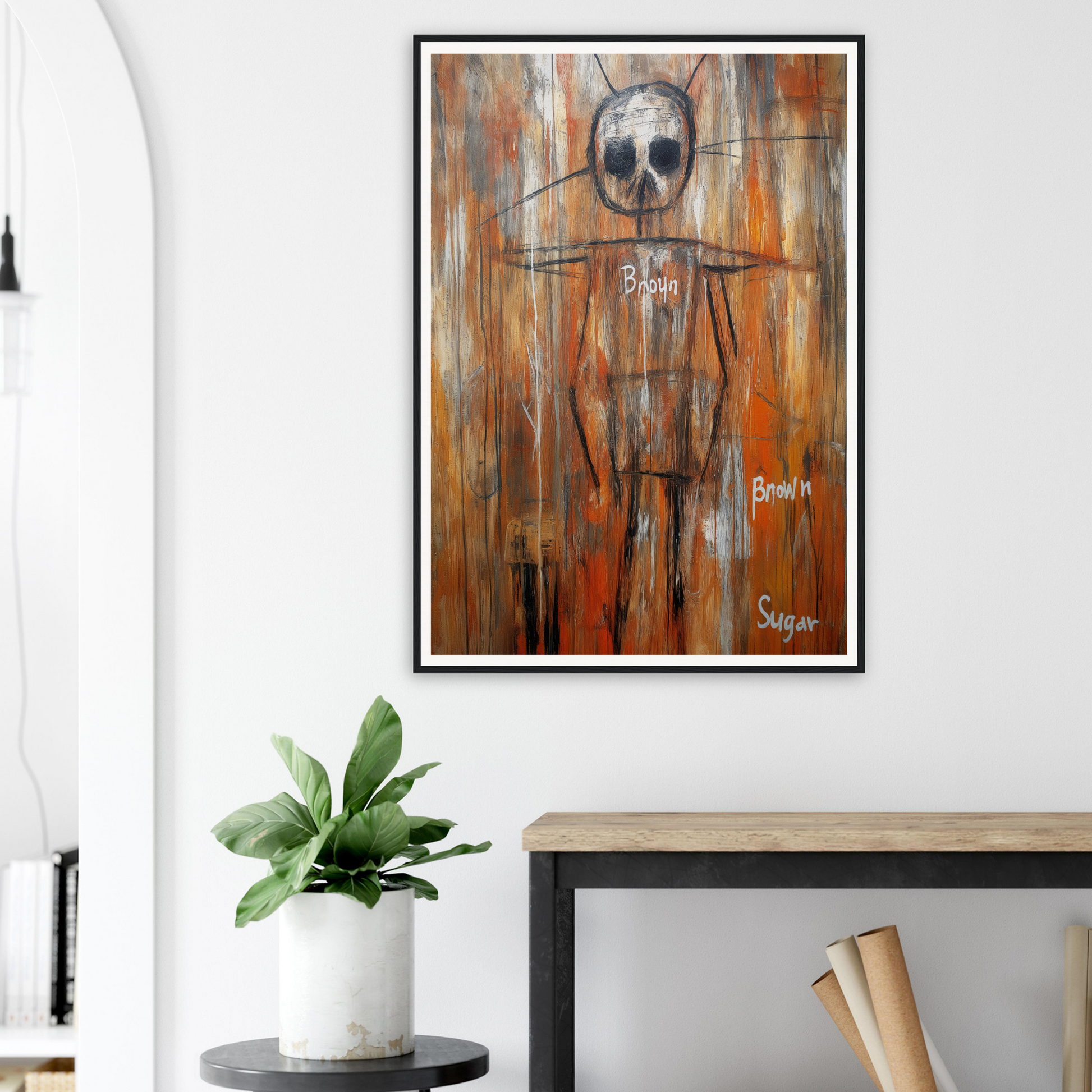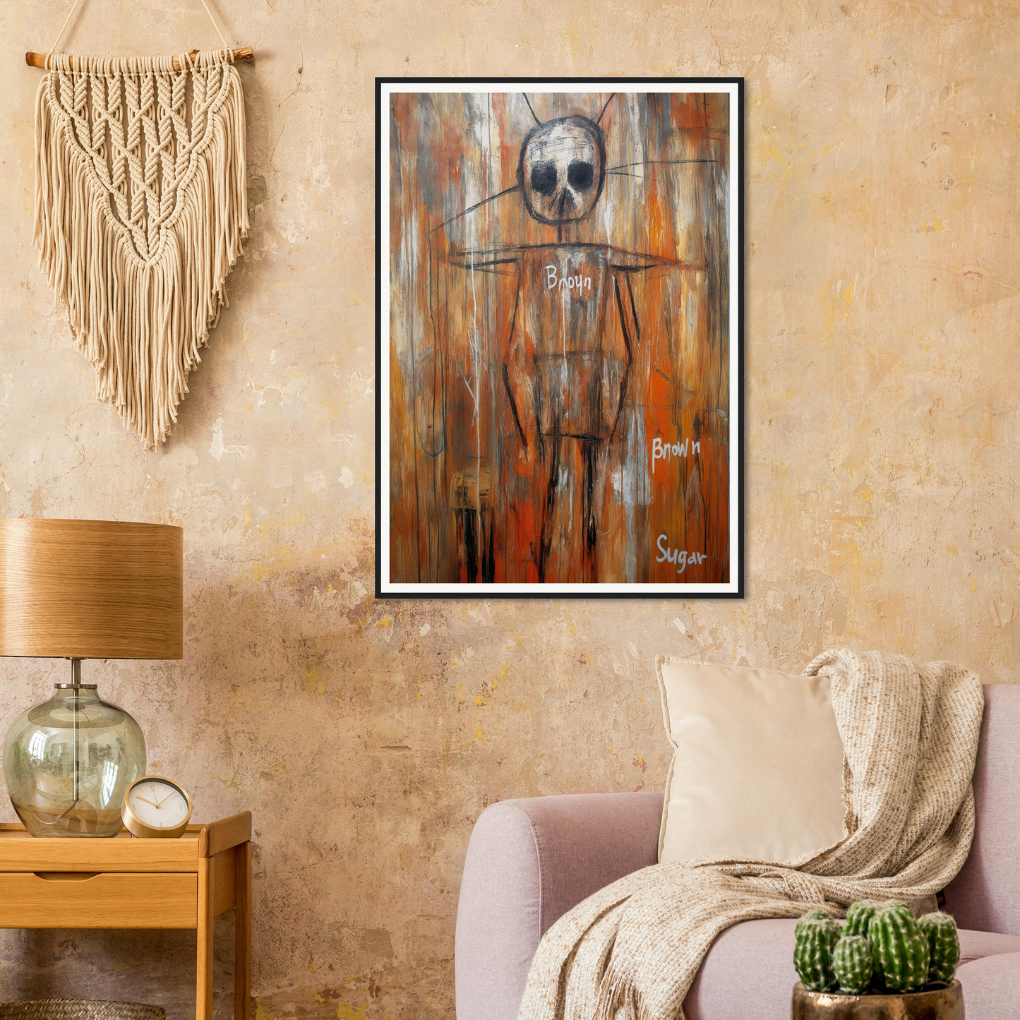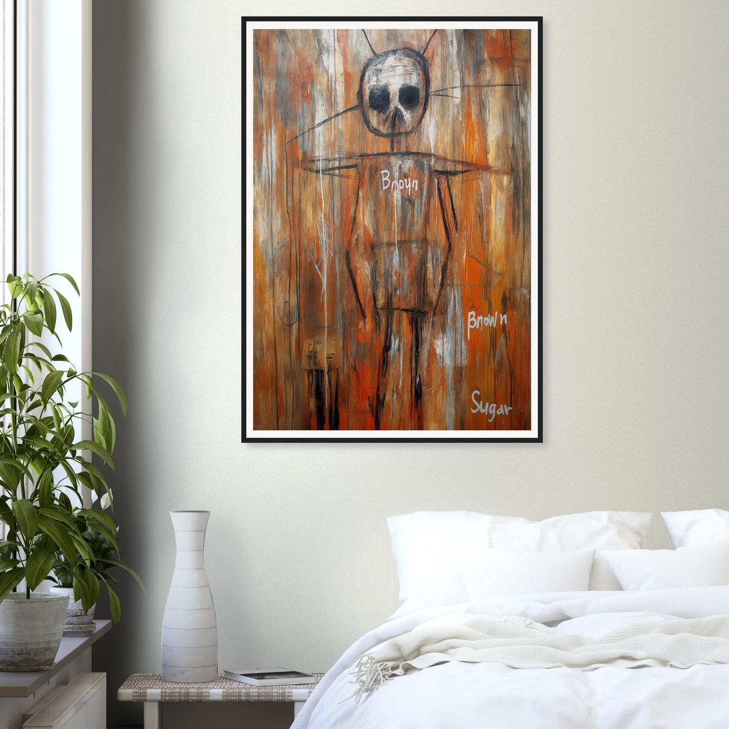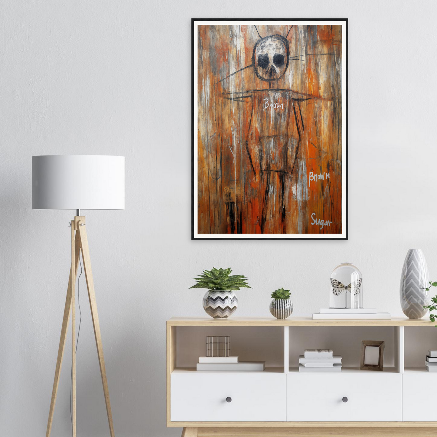 Drenched in earthy hues of warm browns and oranges, this piece evokes the rich palette of autumn. Black and white accents add sharp contrast, inviting you to contemplate its deeper meanings. Perfect for spaces like the living room or office, it offers a tasteful blend of introspective charm and modern aesthetics.