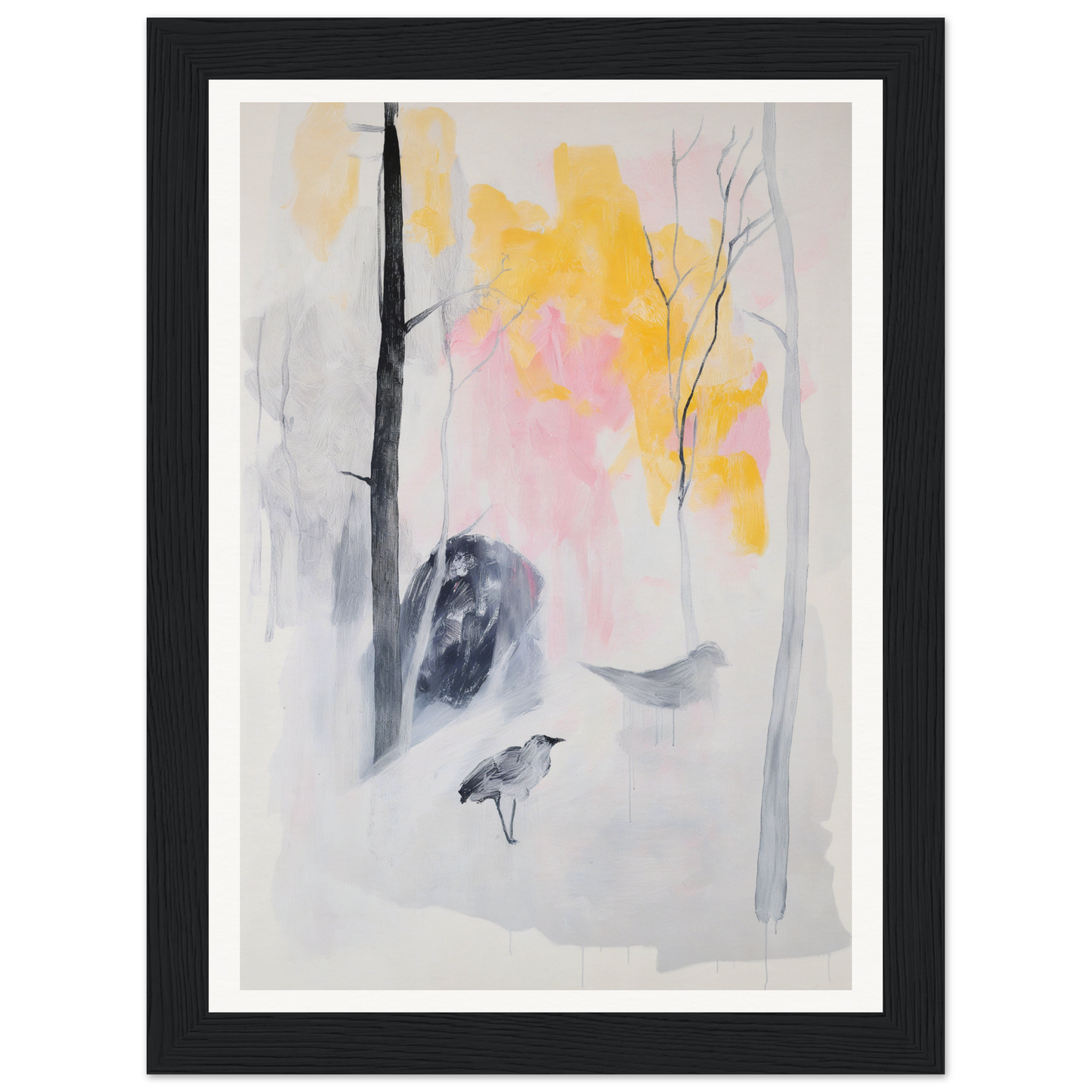 The artwork features a harmonious blend of muted whites and grays, enhanced by delicate hints of yellow and pink. A calming backdrop reminiscent of snowy or misty environs, it sets the stage for a gentle narrative infused with life by the subtle presence of two birds. This interplay evokes solitude and connection, urging reflection on nature’s quiet dialogues.