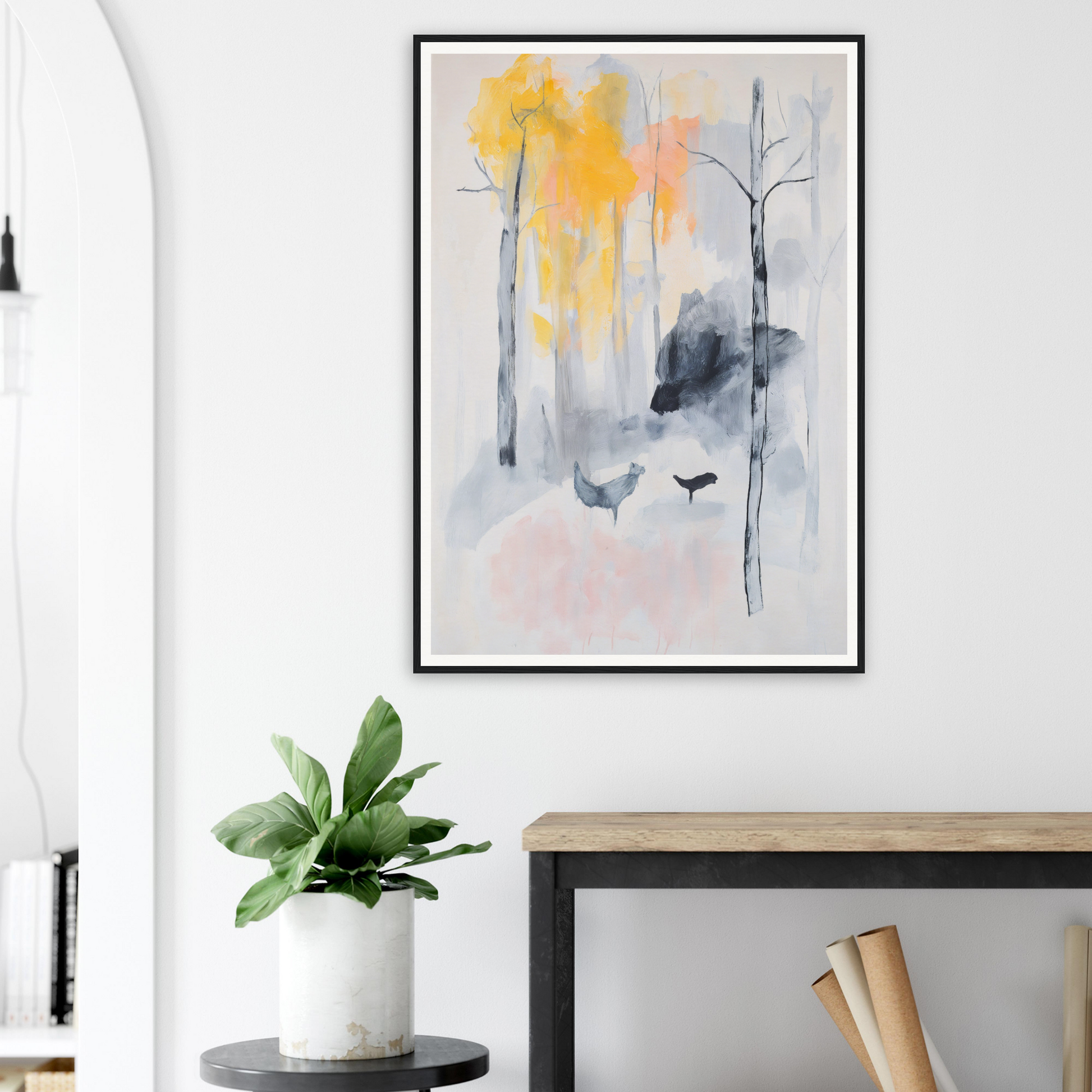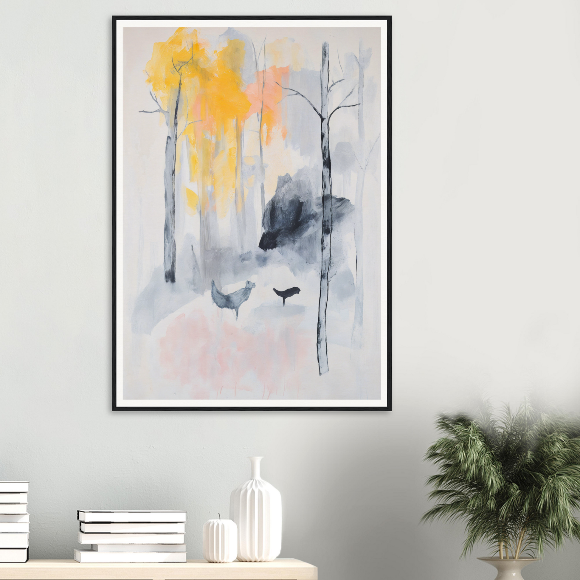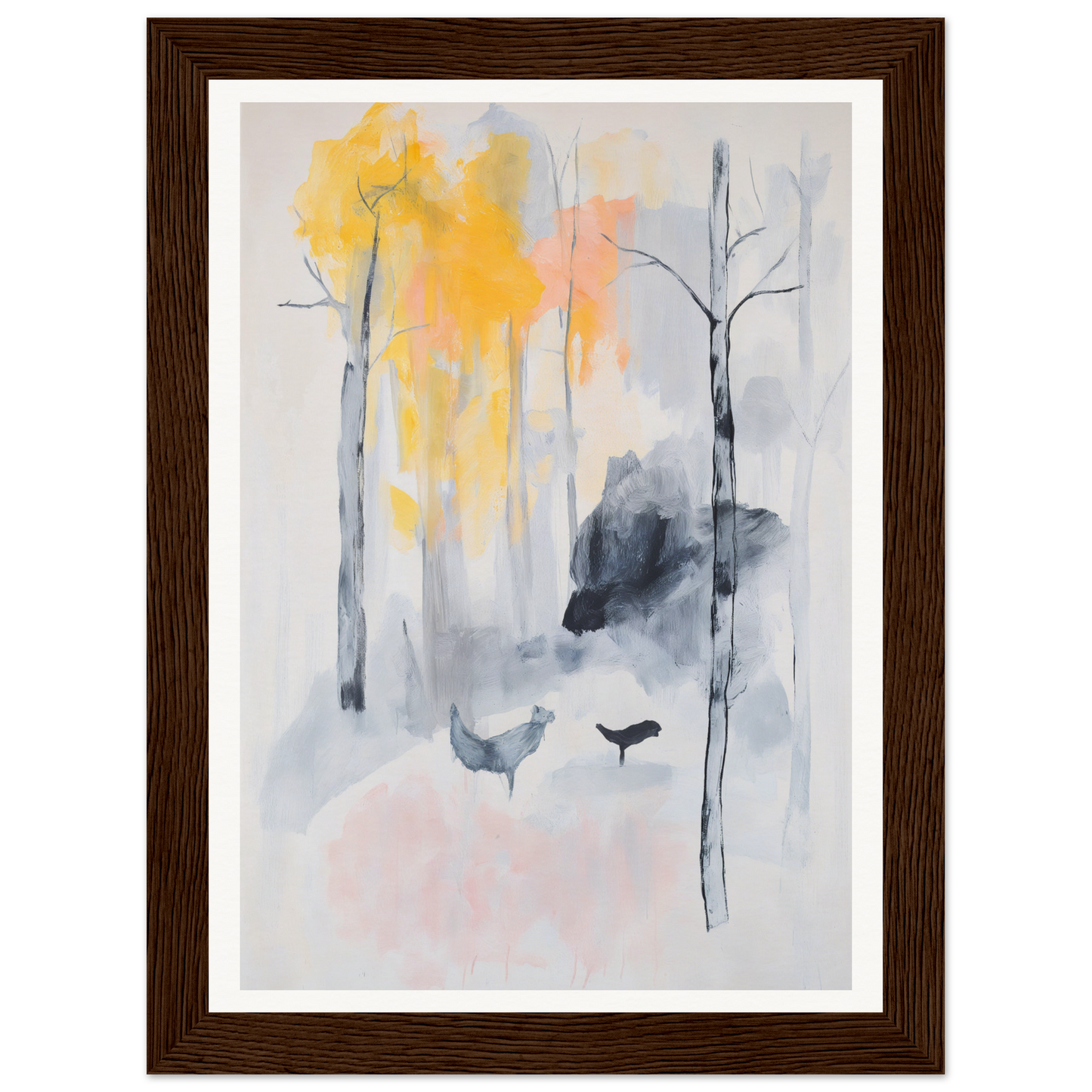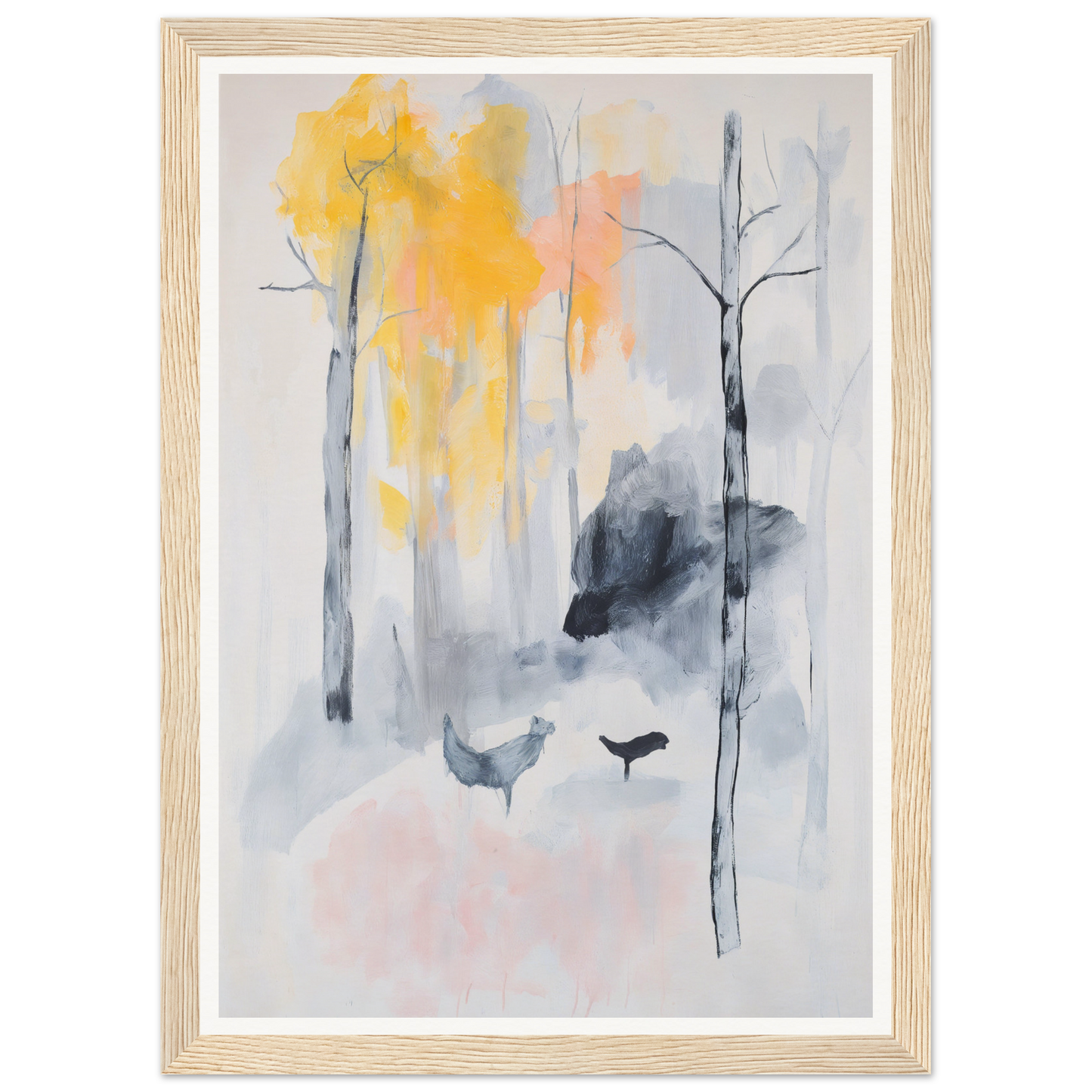 This artwork captures the cool serenity of gray backgrounds paired with the vibrant whispers of yellow autumn leaves. Hints of orange and pink hues lend a sense of mystique, while the delicate Baltic woods of the frame highlight every feature without distraction from nature’s own creativity.