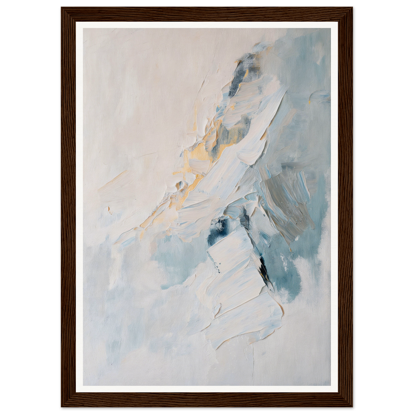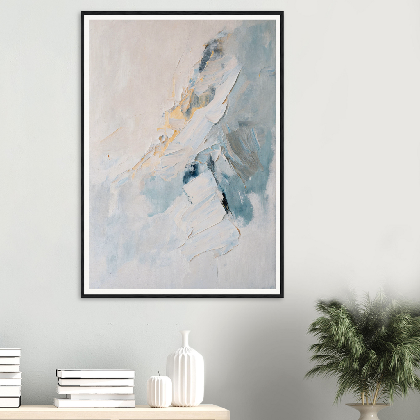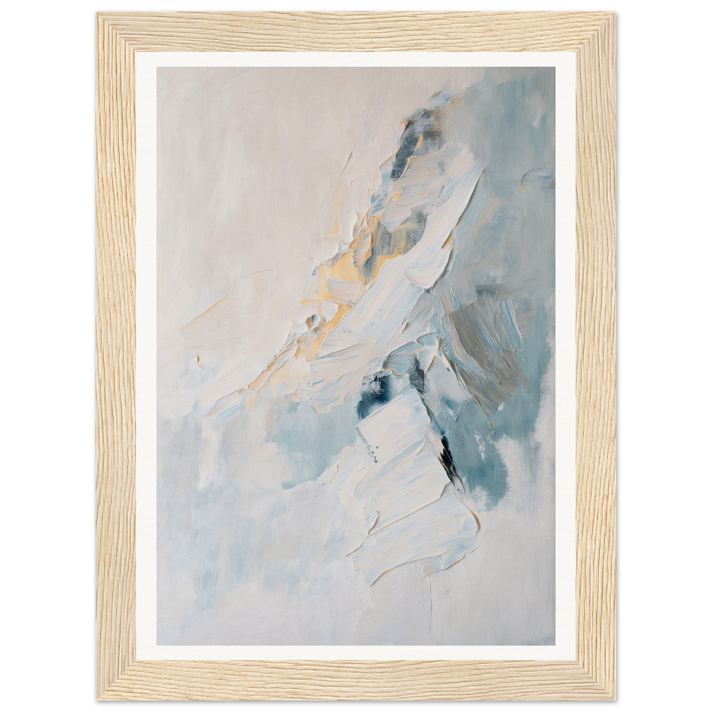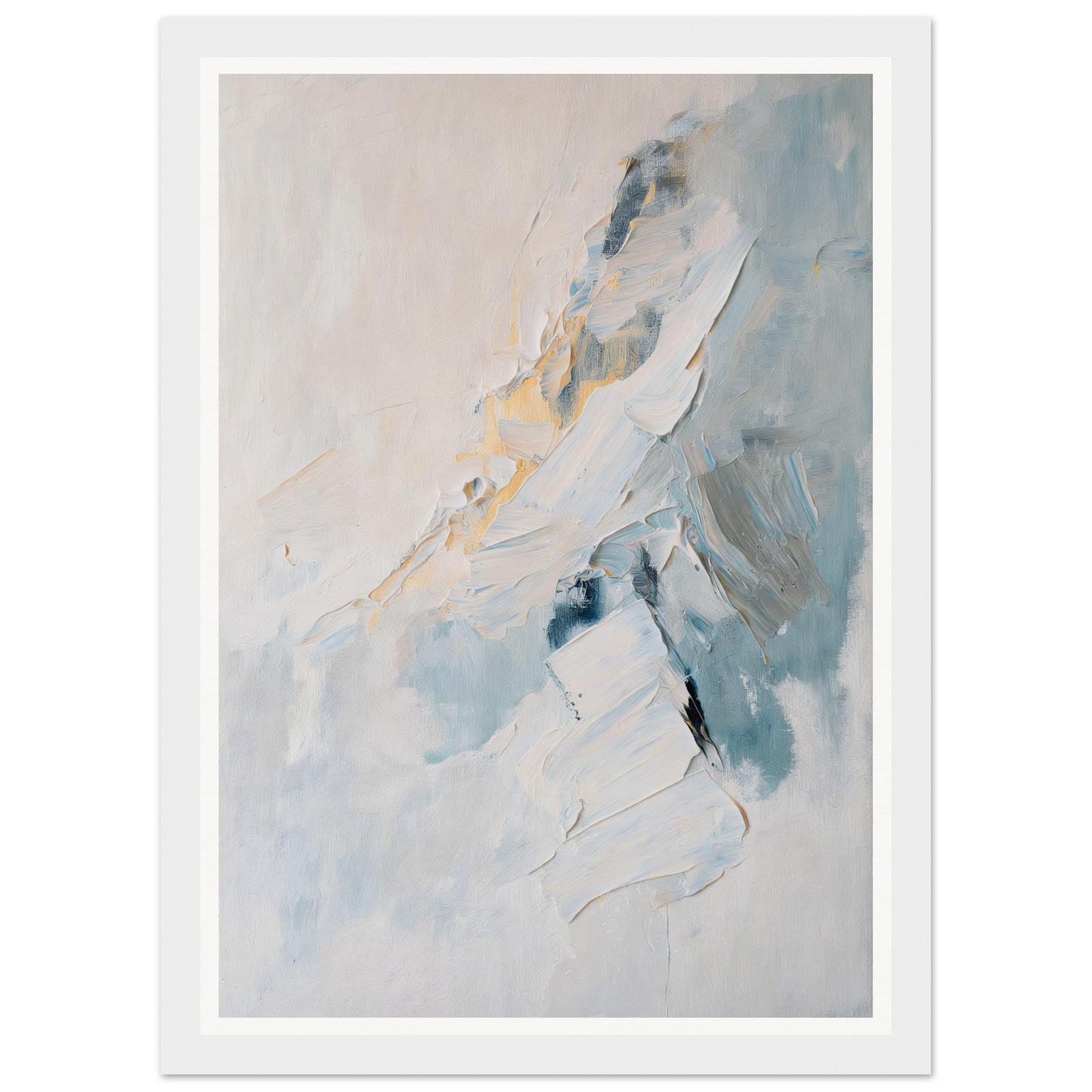 This artwork features a predominantly muted color palette that dances across the canvas. Dominant hues of soft white blend seamlessly with shades of gentle blue and grey, while whispers of warm beige and subtle yellows introduce a calming contrast. The abstract textures suggest fluid movement, like the soothing rhythm of ocean waves.