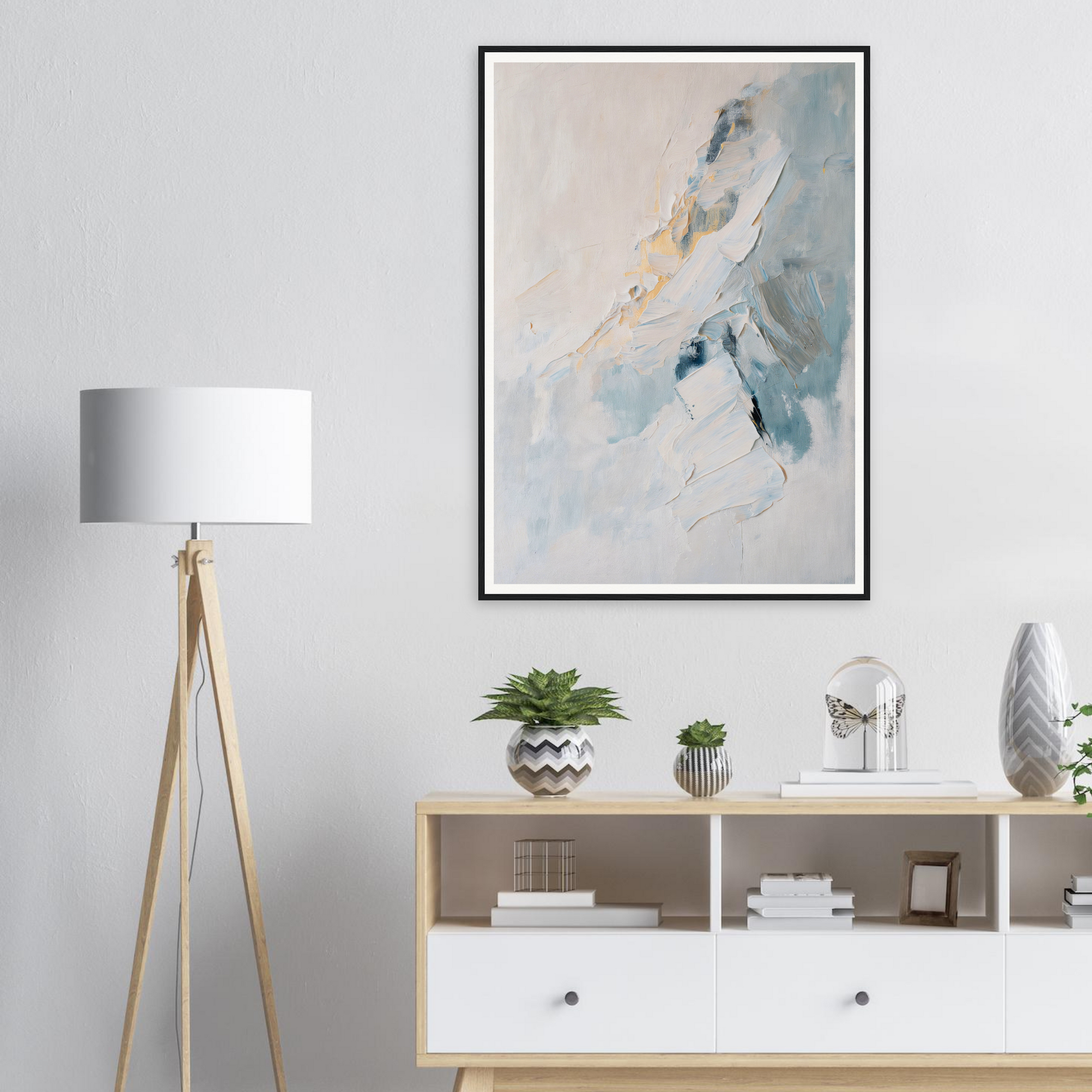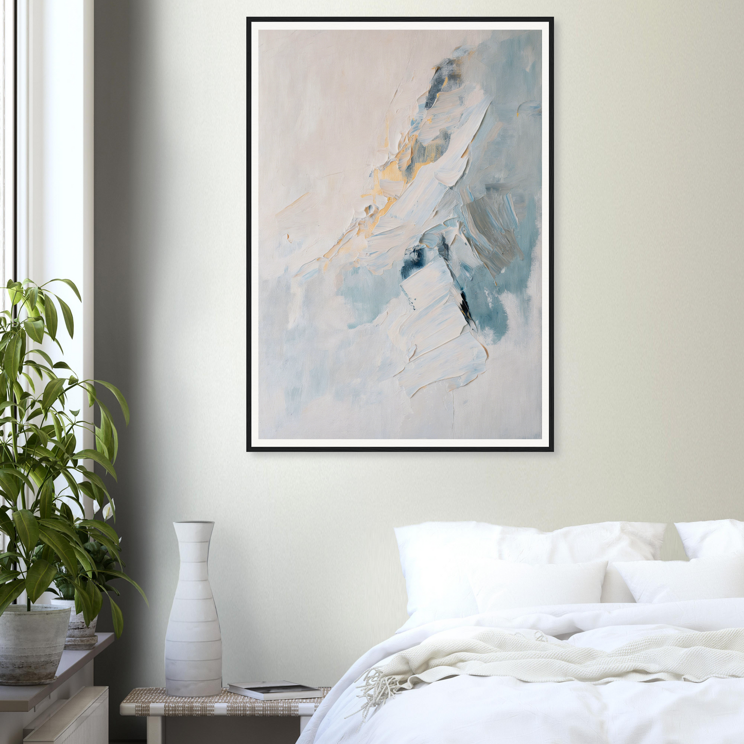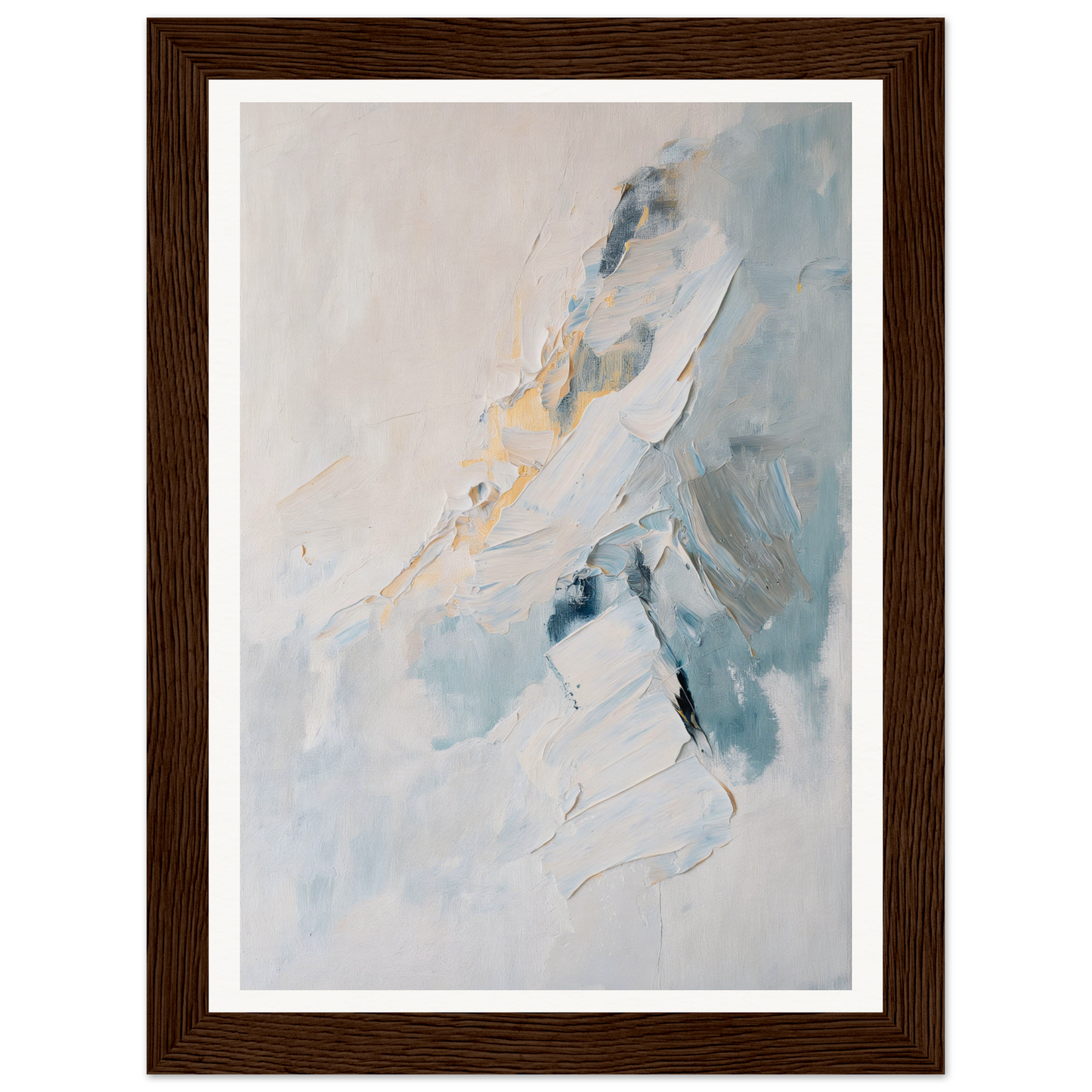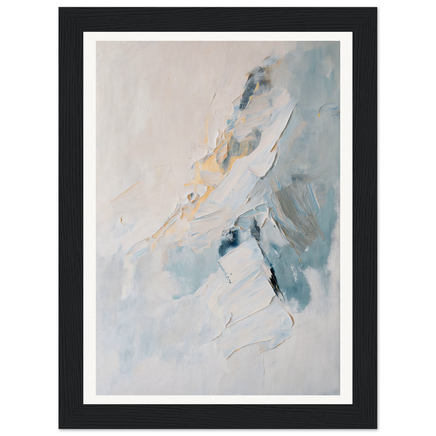 This artwork features a predominantly muted color palette that dances across the canvas. Dominant hues of soft white blend seamlessly with shades of gentle blue and grey, while whispers of warm beige and subtle yellows introduce a calming contrast. The abstract textures suggest fluid movement, like the soothing rhythm of ocean waves.
