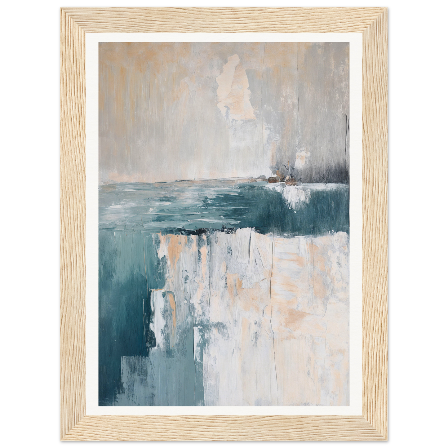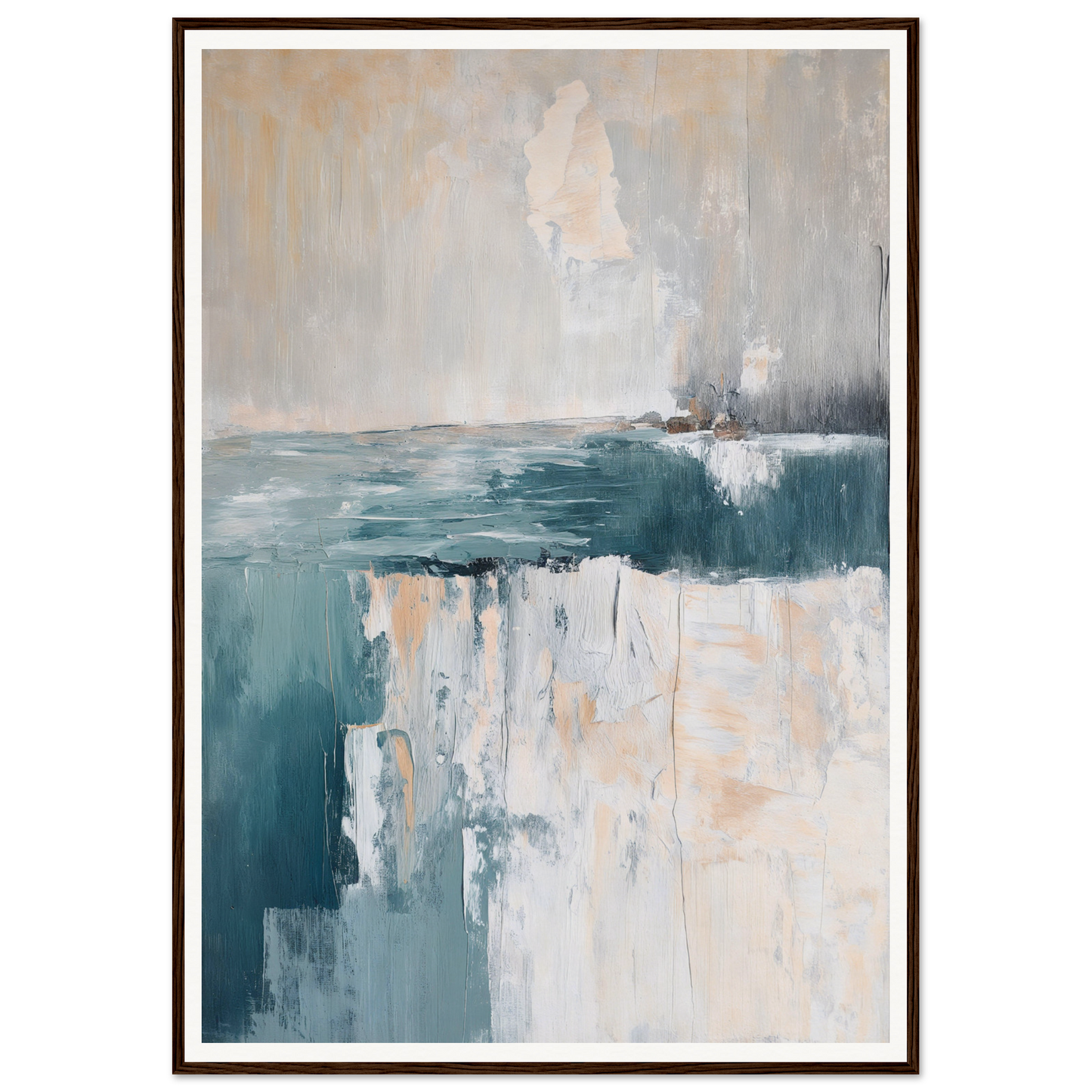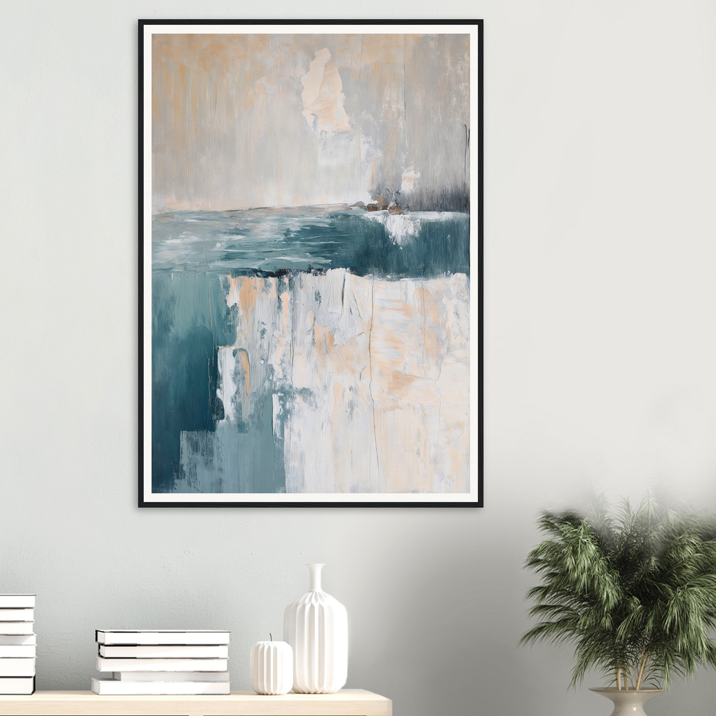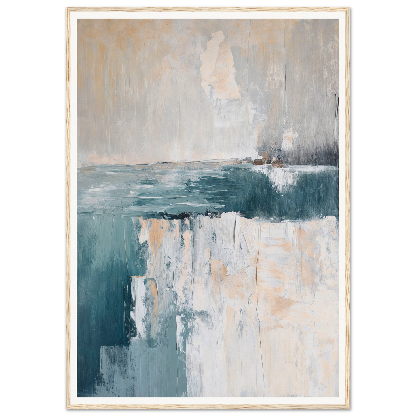 Meticulously framed in your choice of bespoke finishes, this artwork combines subtle elegance and high-quality craftsmanship. Choose from natural wood, black, or white frames, uniquely tailored to blend with the serene hues of blue and sandy beige in the artwork.