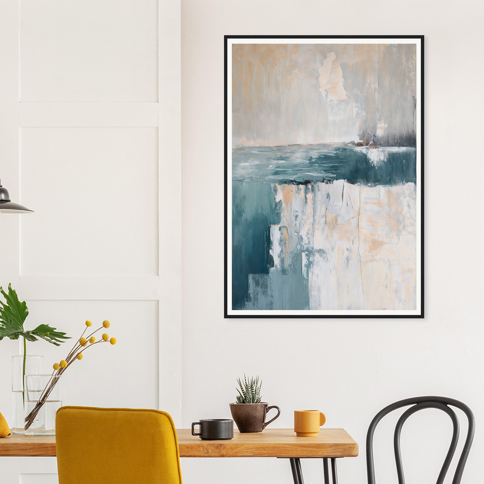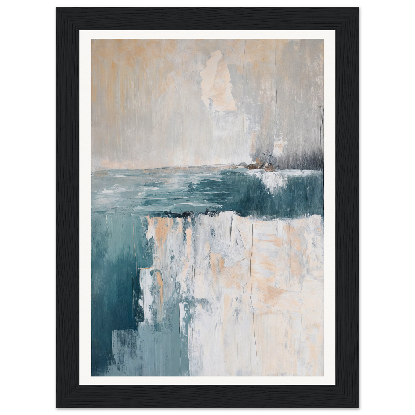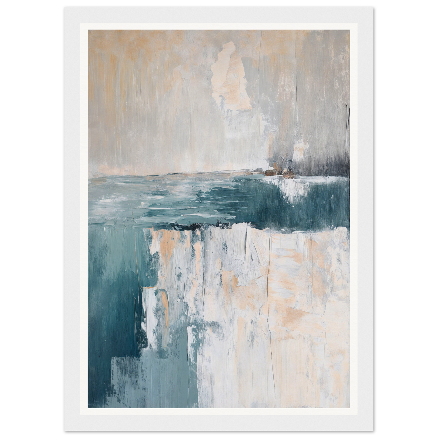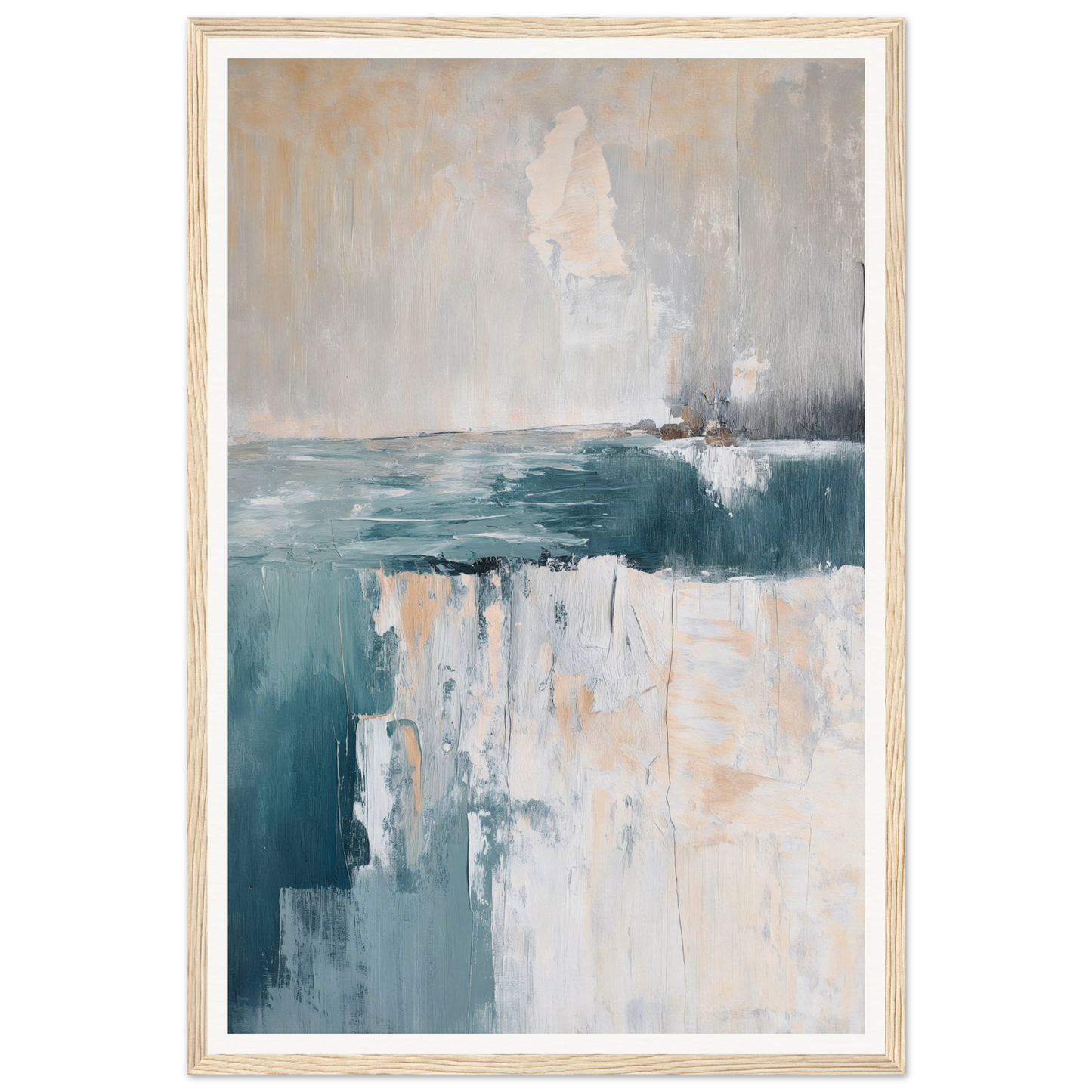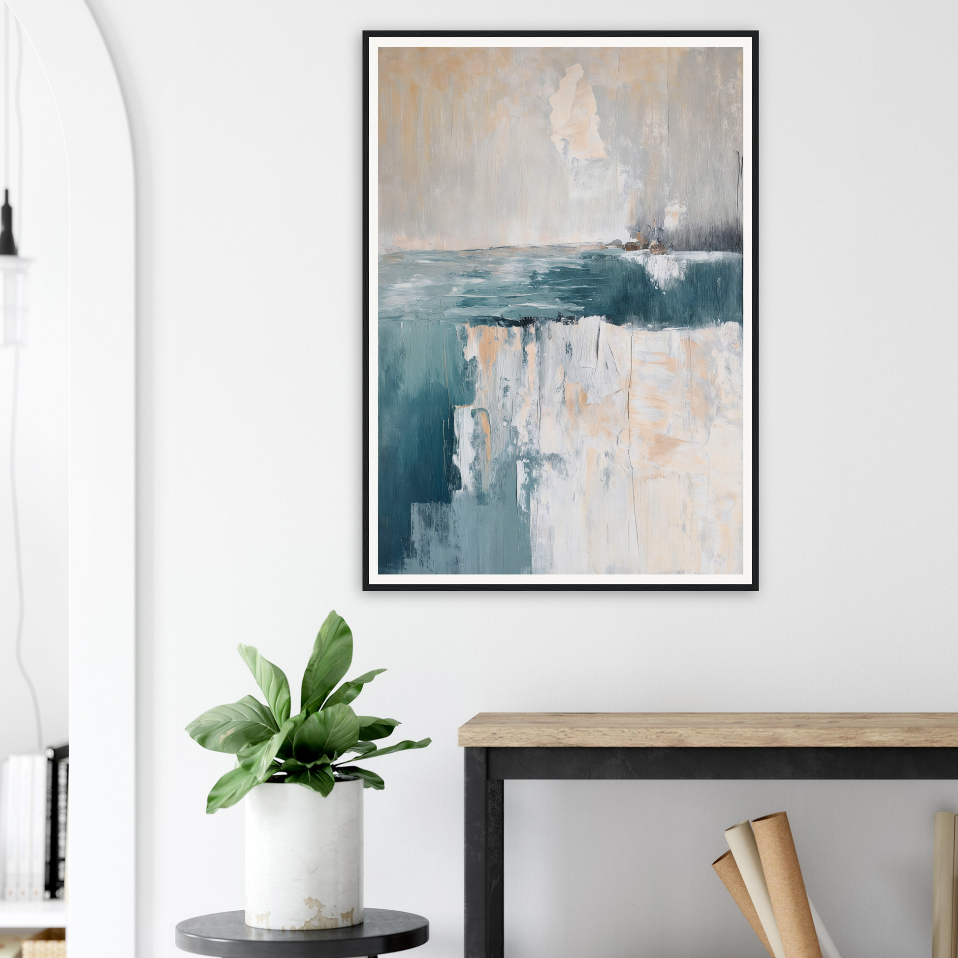 Meticulously framed in your choice of bespoke finishes, this artwork combines subtle elegance and high-quality craftsmanship. Choose from natural wood, black, or white frames, uniquely tailored to blend with the serene hues of blue and sandy beige in the artwork.