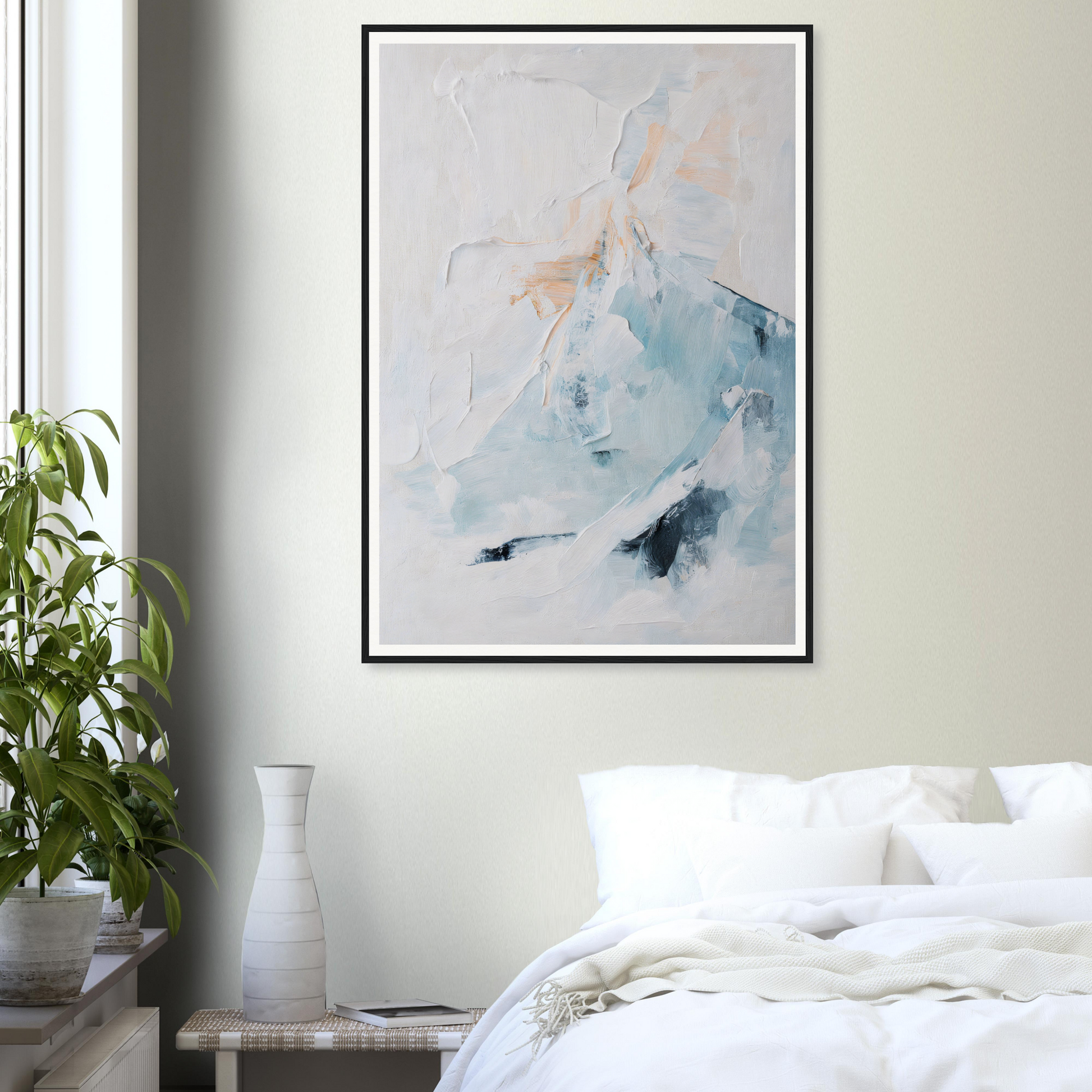 This stunning artwork is printed on premium quality framed canvas. The main color palette of pastel blues and off-whites evokes feelings of peace and continuity, while soft hints of peach and cream infuse warmth. Ideal for living rooms to bring a soothing ambiance or for your office to inspire creativity and calm reflection.