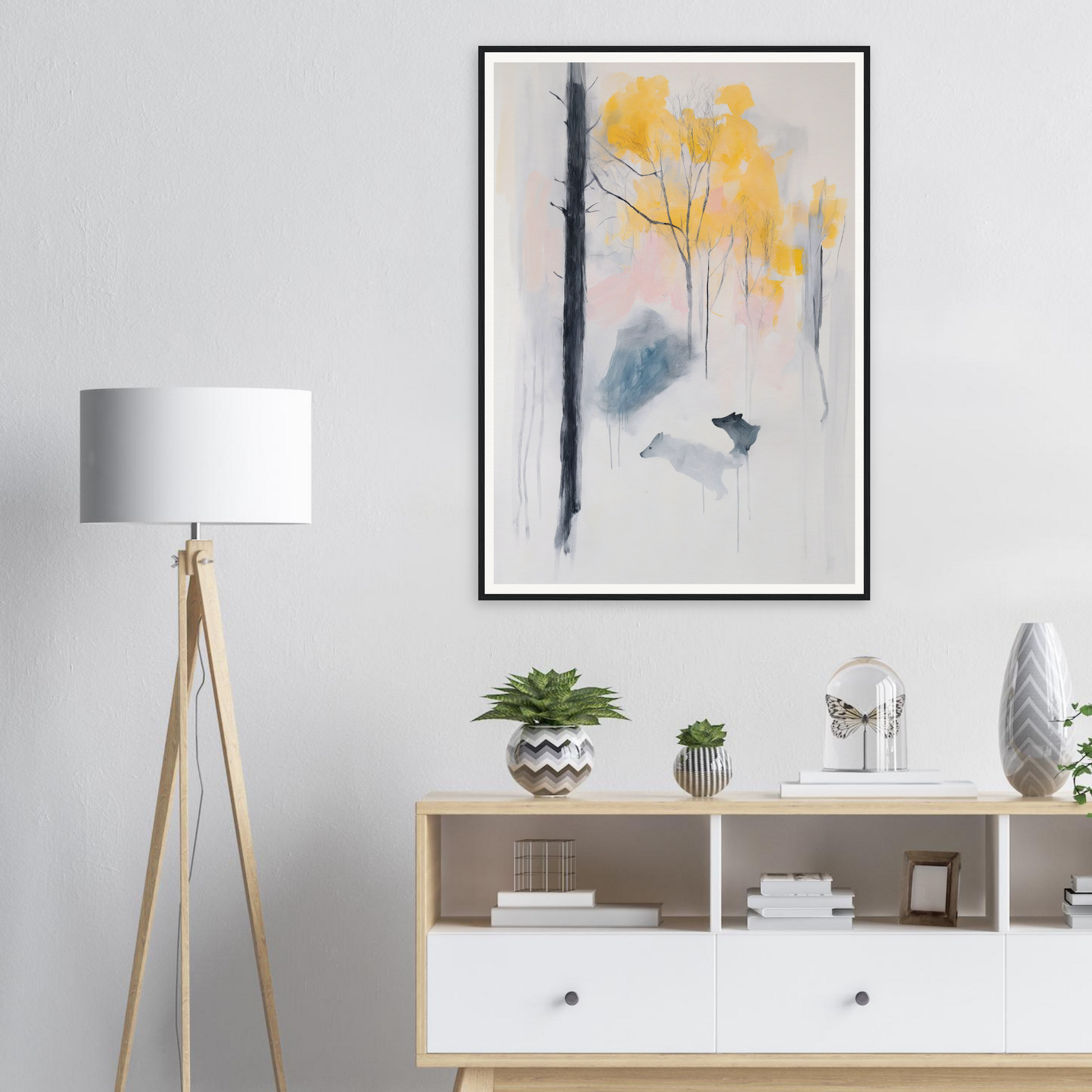 Our art features the dominant soft, bright yellow of the autumn trees, infusing warmth among cool, muted tones of pale grays and delicate blues. The canvas showcases a harmonious palette finished with gentle touches of pink, evoking an ethereal quality reminiscent of a dreamy morning mist.
