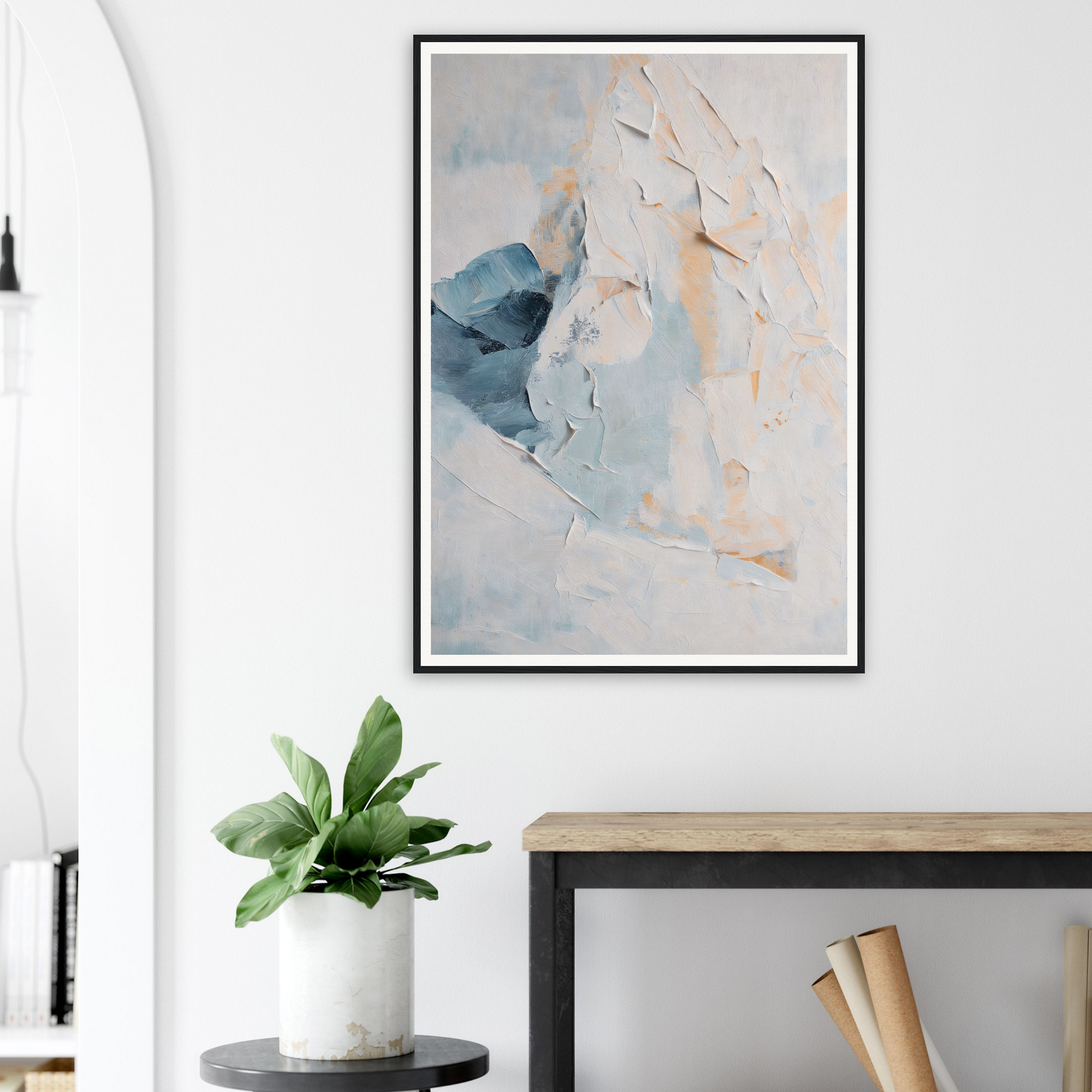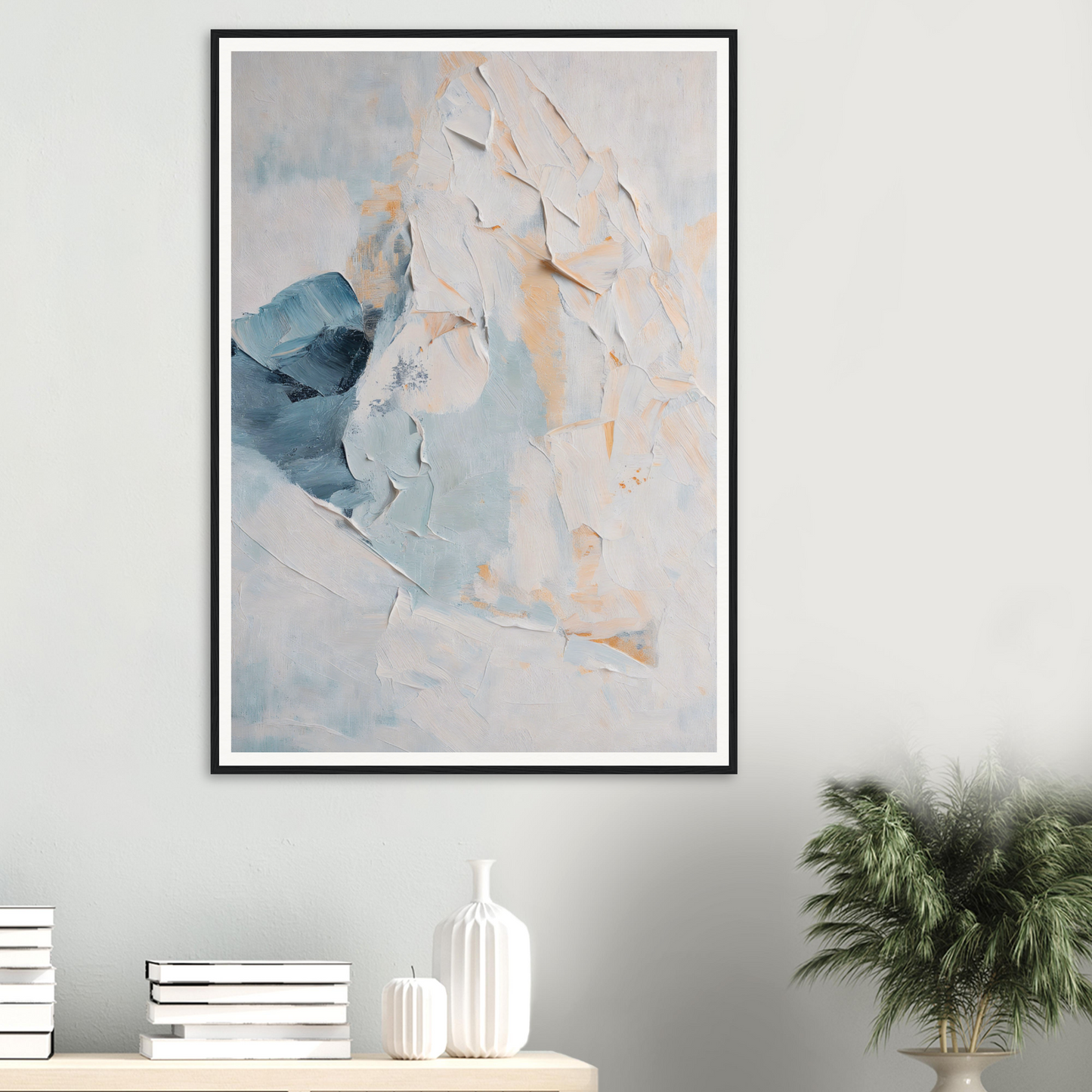 - Dynamic textural strokes: Simulating movement and emotion within a serene cool blue and white landscape.
