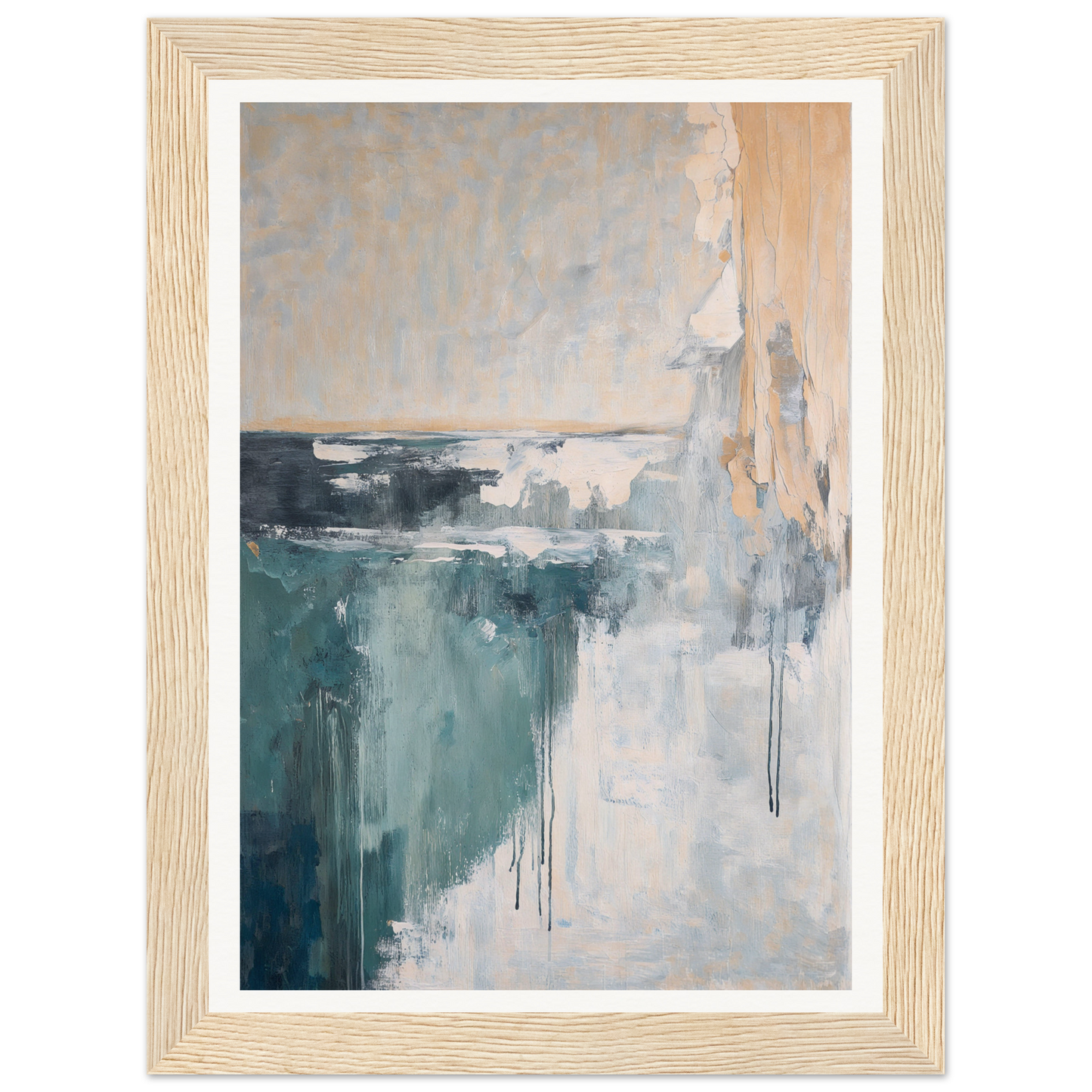 The dominant soft teal gently guides the eye across the canvas, harmonizing with warm beige undertones, creating a serene depiction of sky and sea entwined. This balanced contrast evokes a natural harmony, making it ideal for your living room to create sanctuary-like peace, bedrooms for a calming retreat, or even offices to inspire creativity.