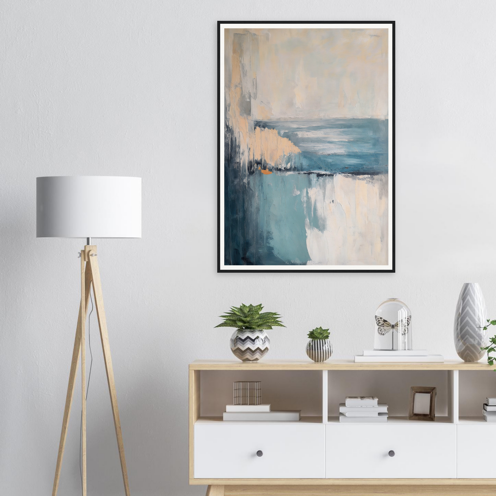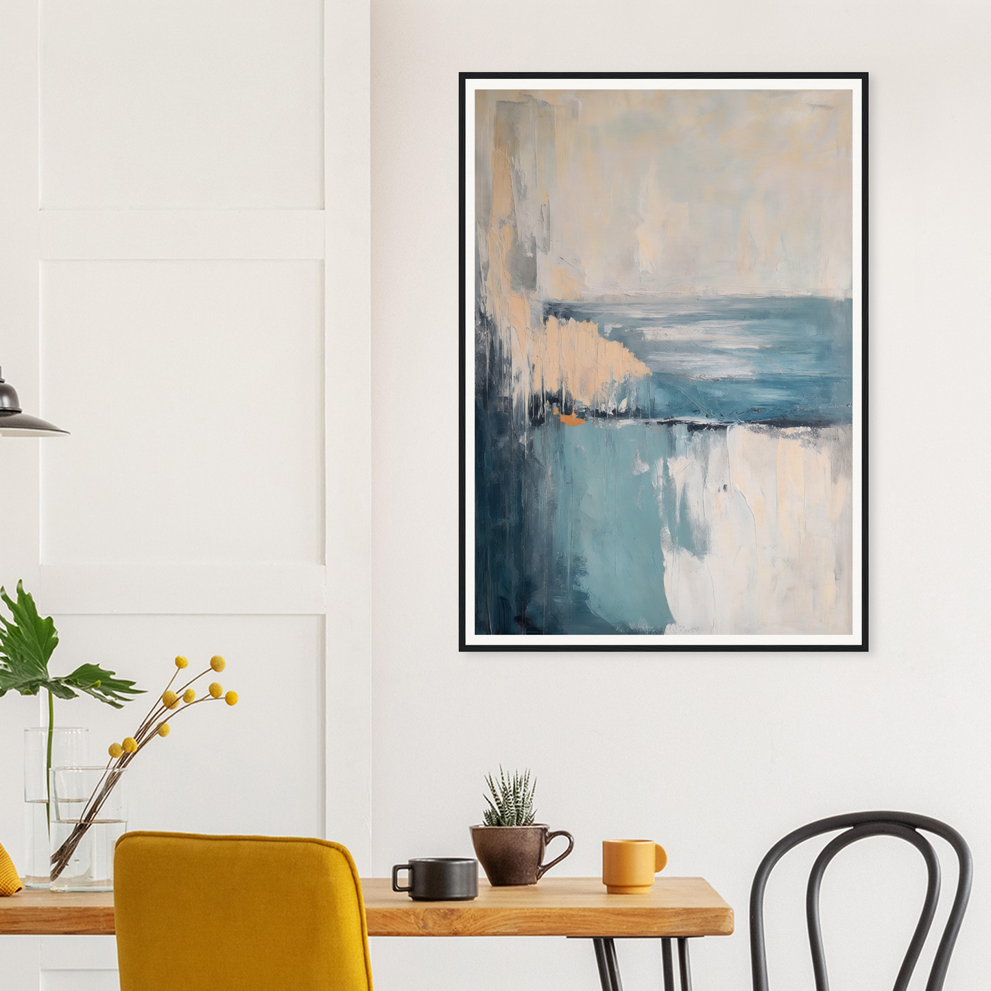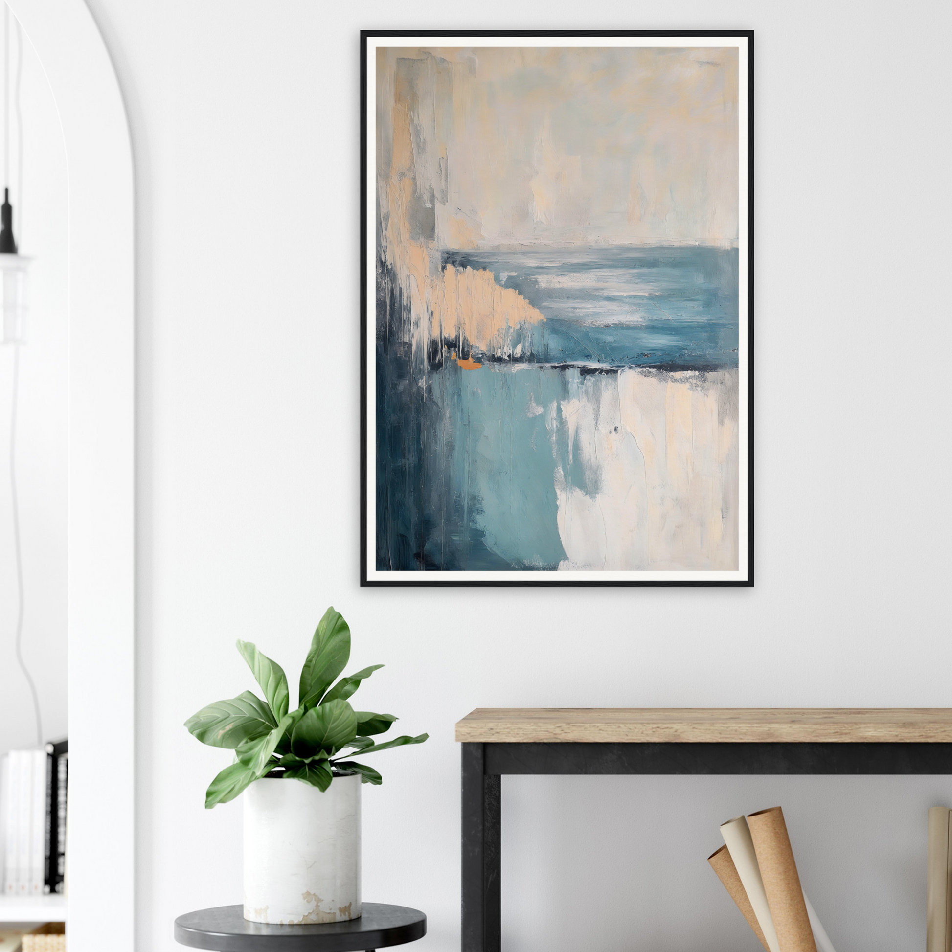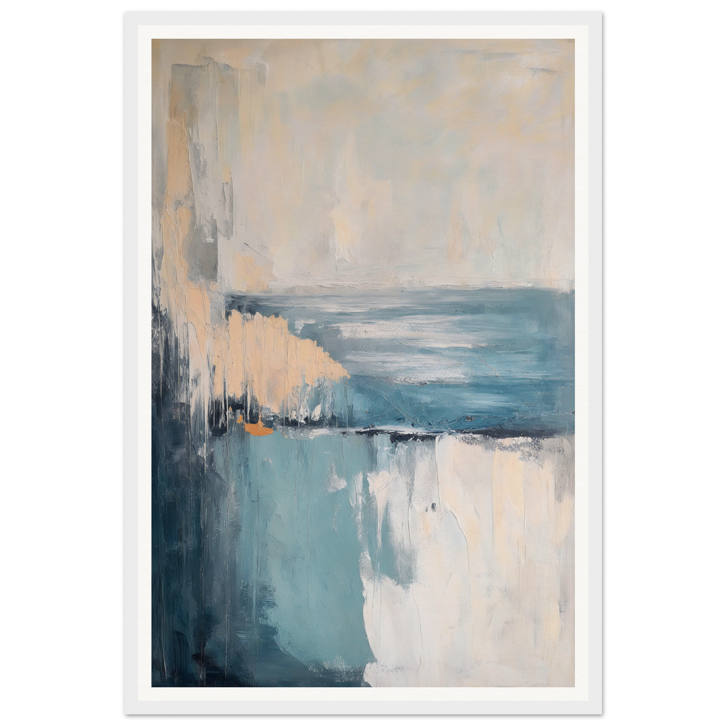 Encased within a frame of natural wood, each piece is an ode to sustainability and tailored beauty. The wood grain, distinct in each frame, promises to add character and poised elegance to any space it graces. With a harmonious color palette that transitions from soft blues to gentle beiges, this artwork will infuse your home with sophistication.
