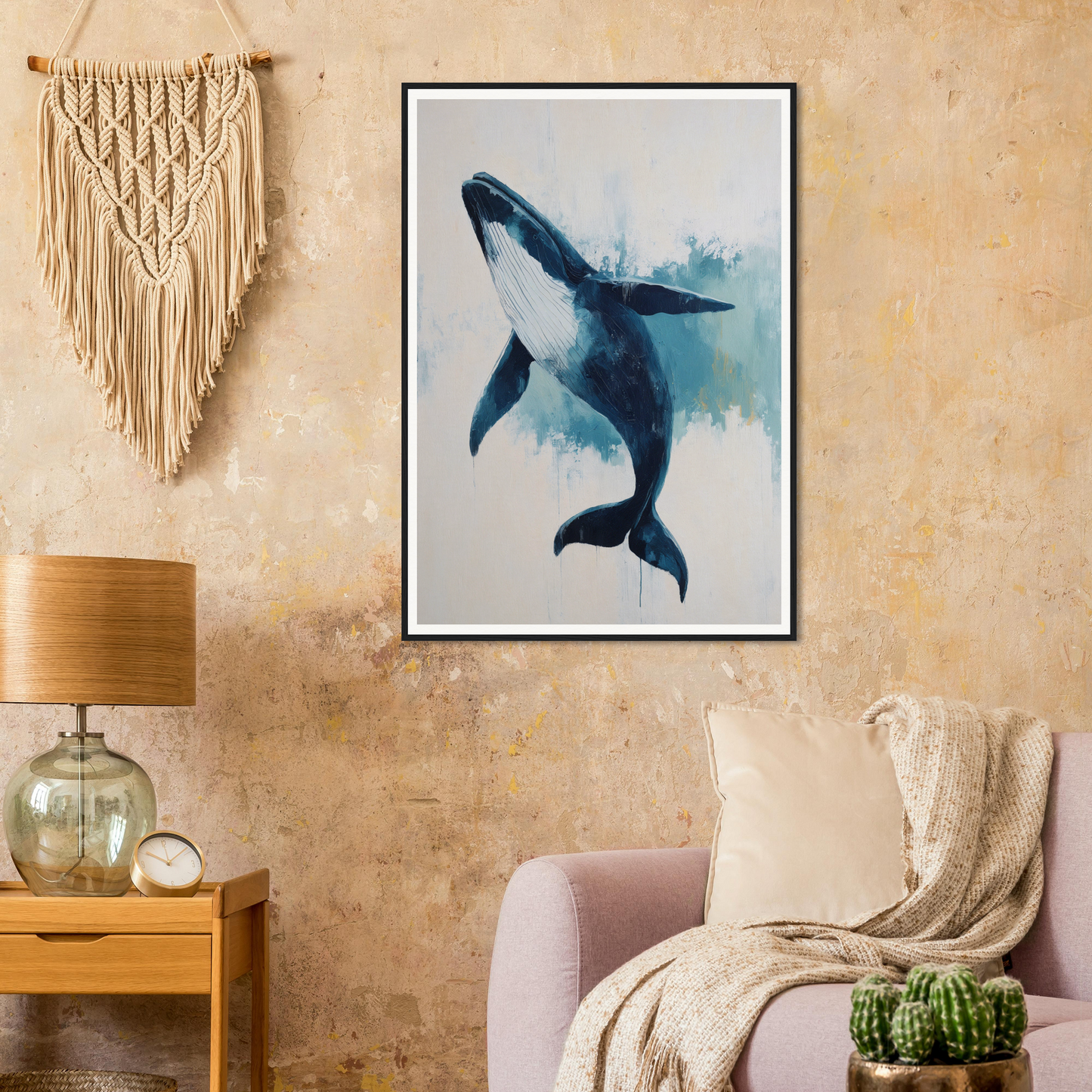 Experience the powerful serenity of the sea through our Majestic Blue Song. This exclusive framed canvas, featuring cutting-edge AI-generated imagery, captures the fleeting grace and majesty of the ocean giant in its minimalist magic, transforming your living spaces into lessons of natural beauty and freedom.