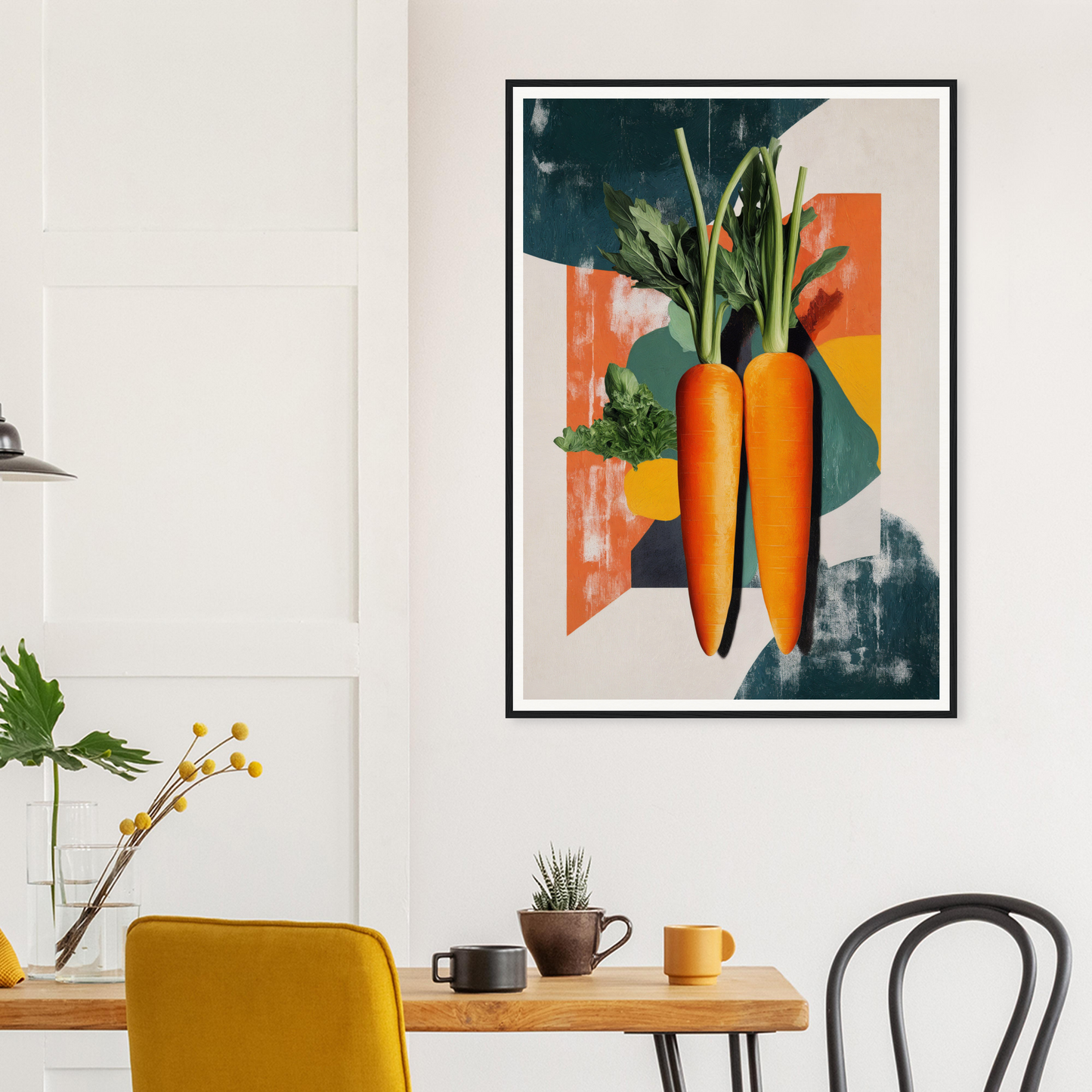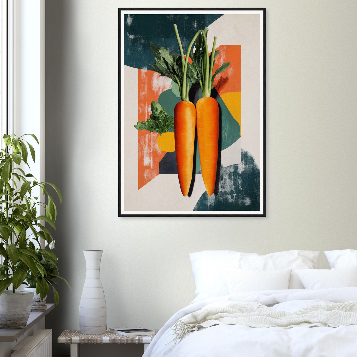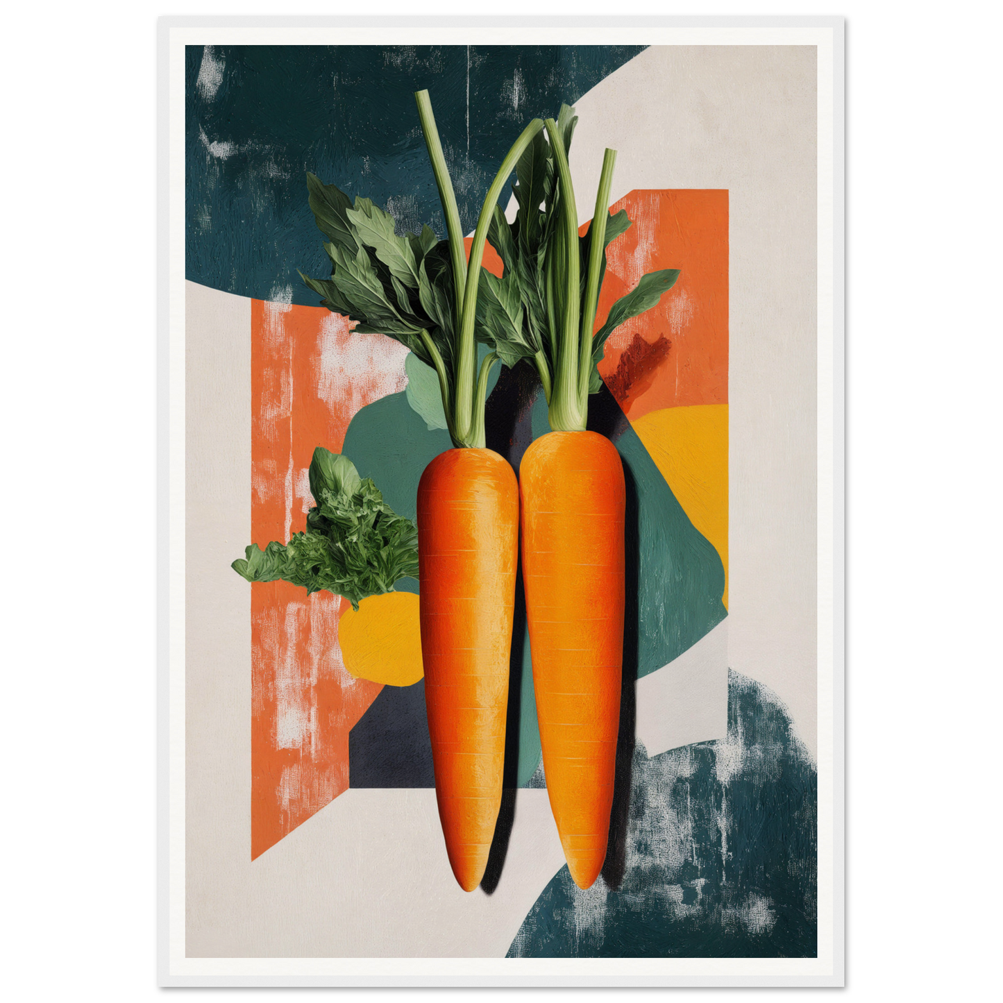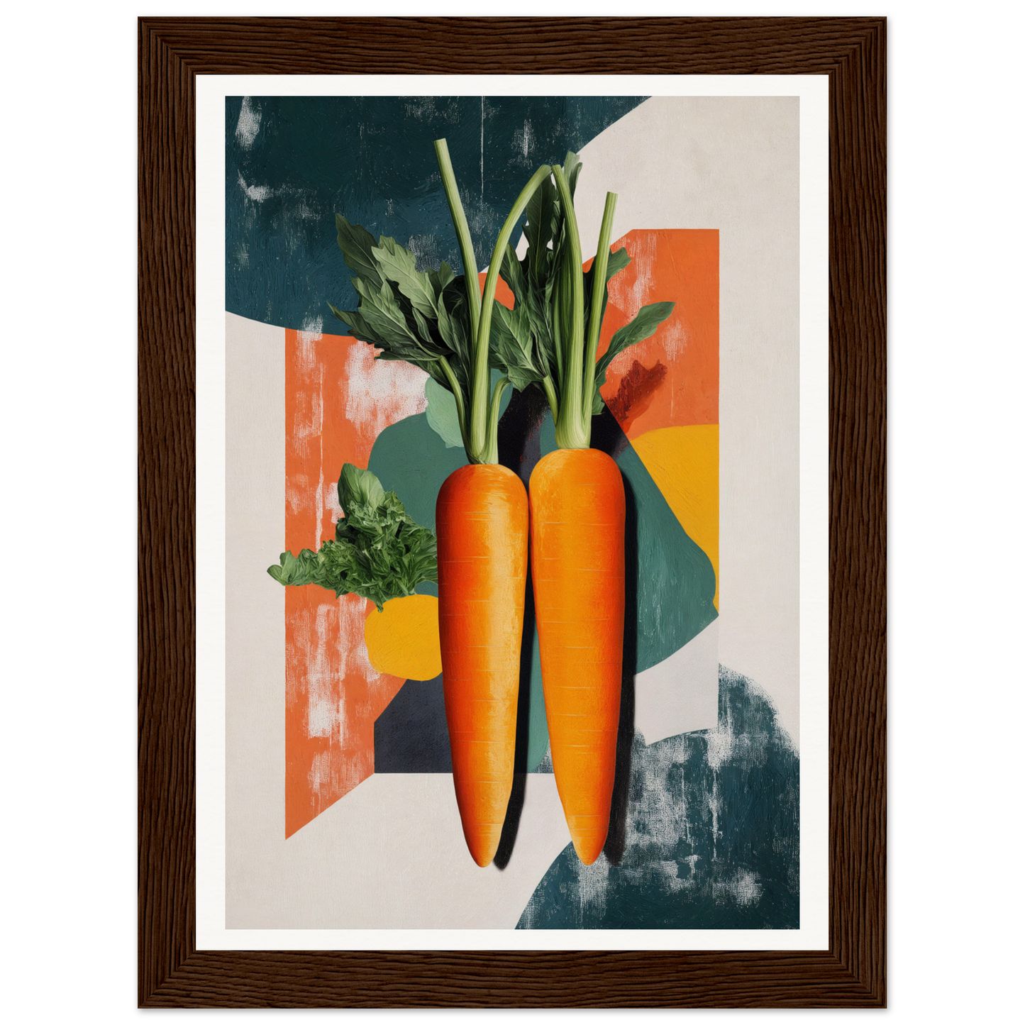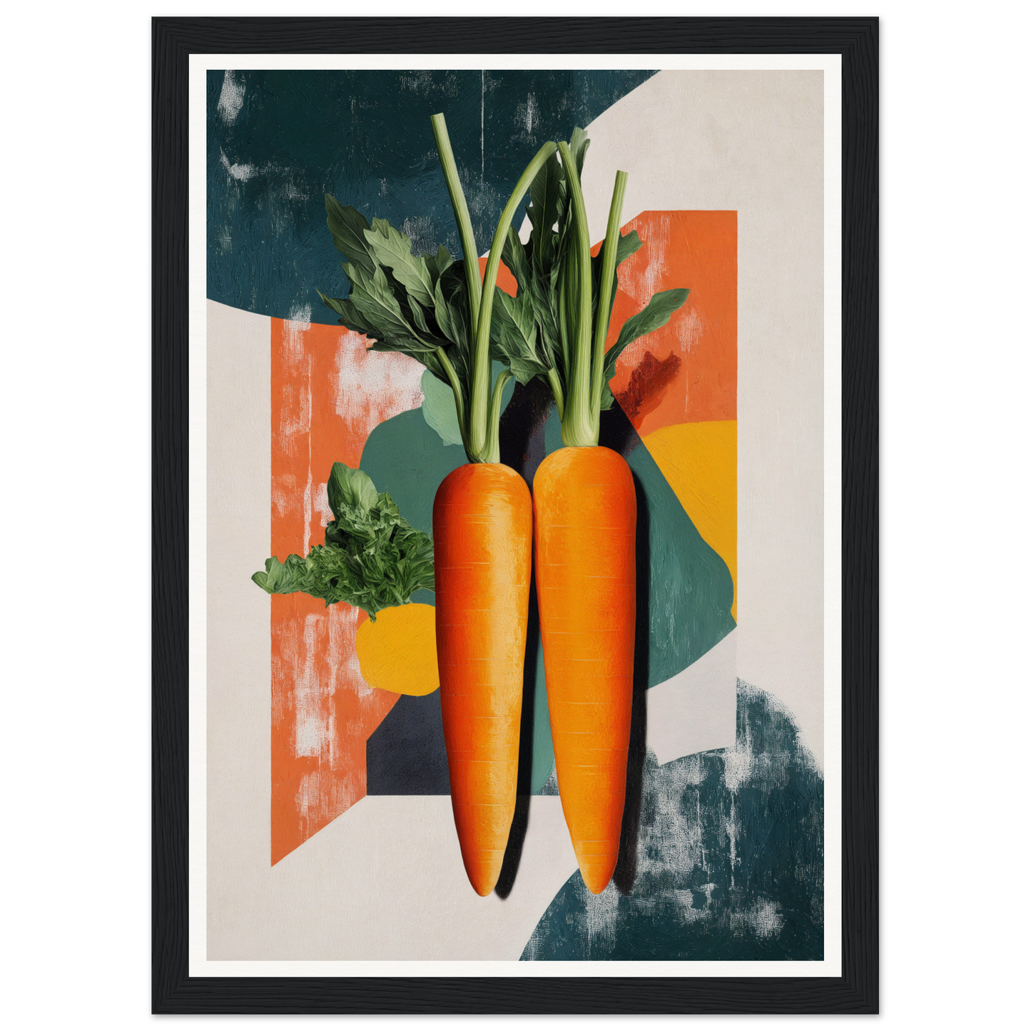Encased within artisan frames, the artwork showcases two realistic, vibrant orange carrots set against an eclectic, colorful blend of teal, cream, and muted red hues. Whether natural wood, black, or white frames, each piece is meticulously crafted to enhance any modern decor. A subtle creamy backdrop, combined with nature’s palette of greens and hints of deep blue, offers an elegant balance of vibrancy and calm.