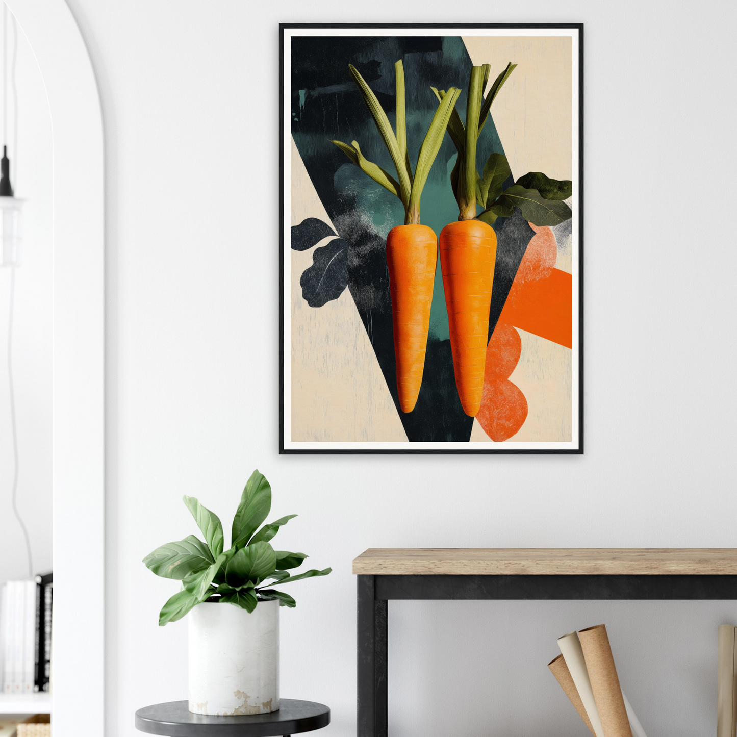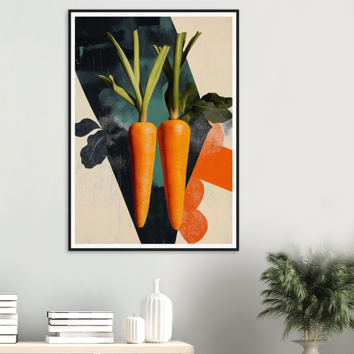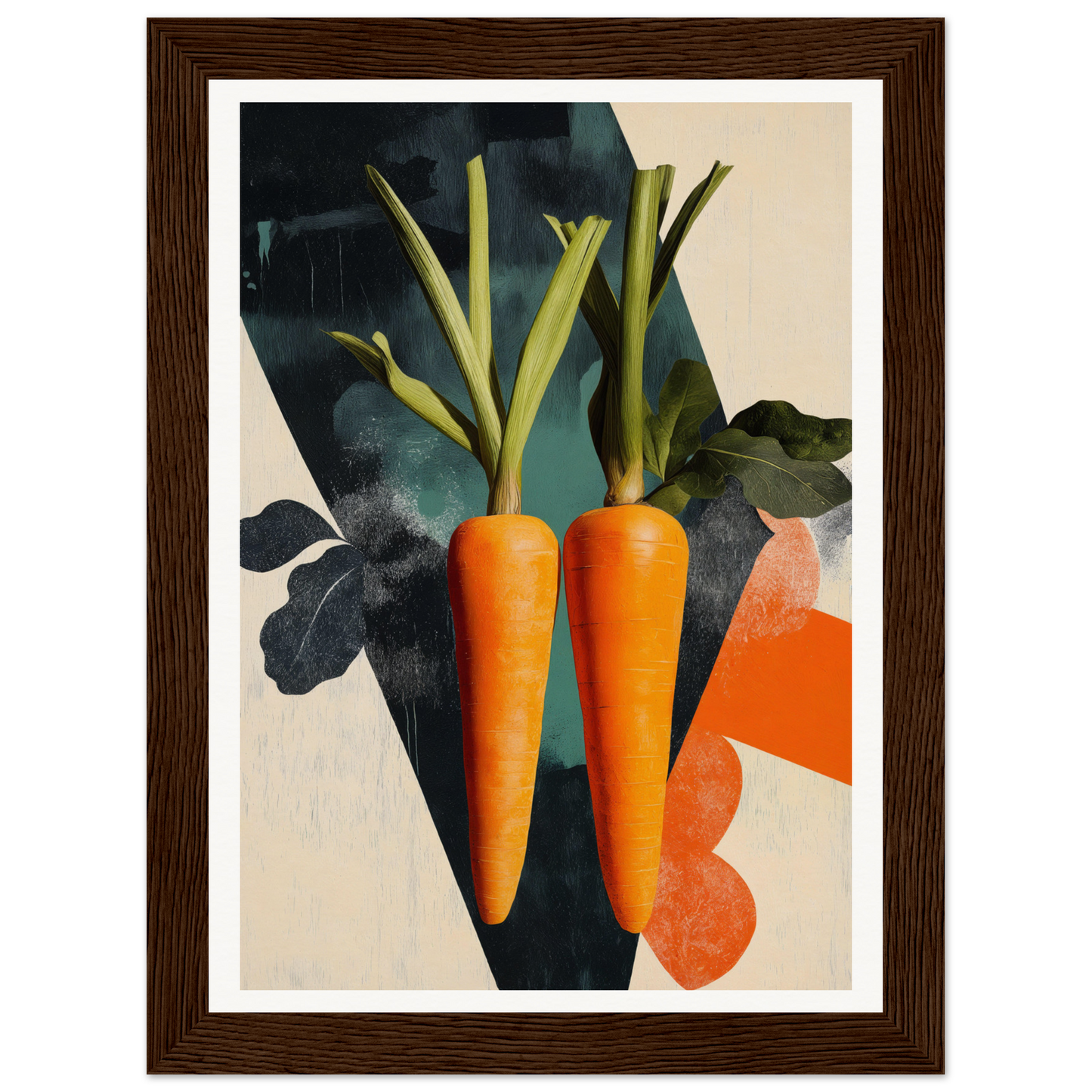 Two brilliantly depicted carrots in vibrant orange take center stage, their presence accentuated by lush green leaves, embodying a natural harmony on a canvas of cream and navy hues. This color fusion captures attention, offering a spirited yet calming visual experience that breathes life into your space.
