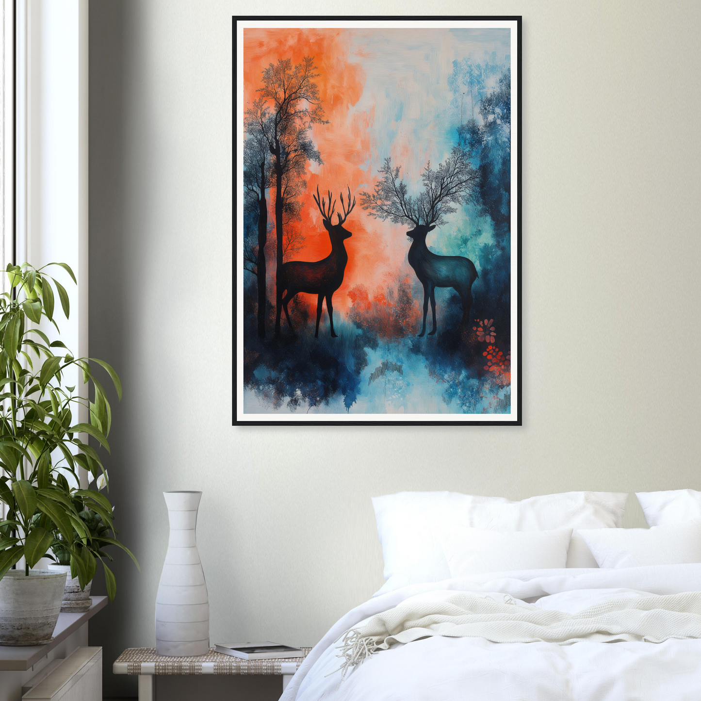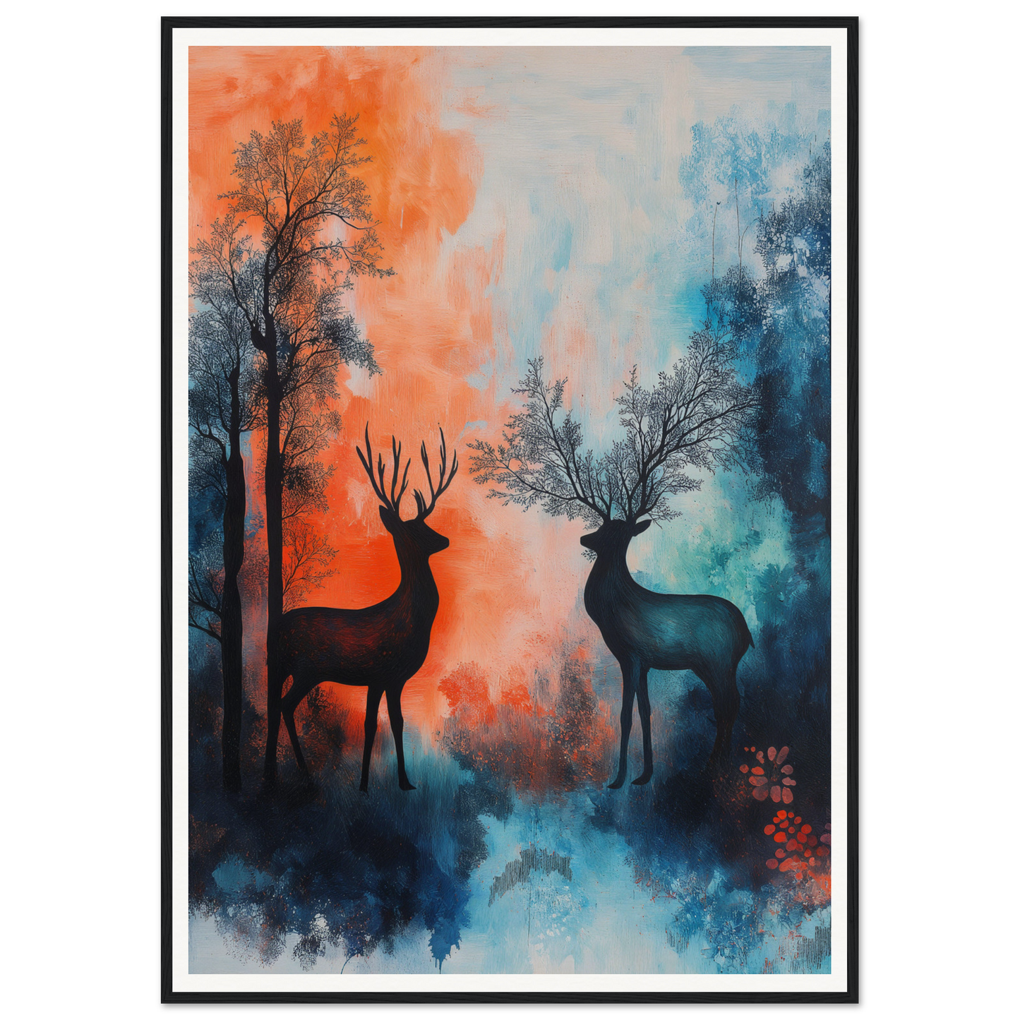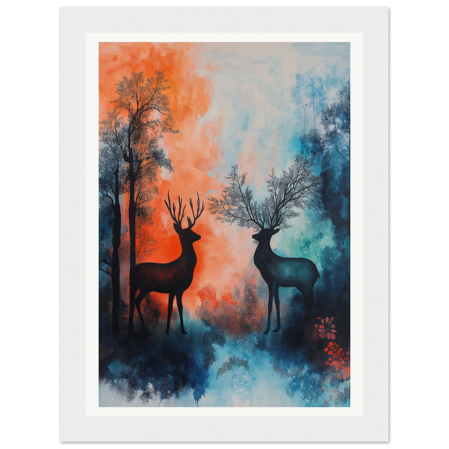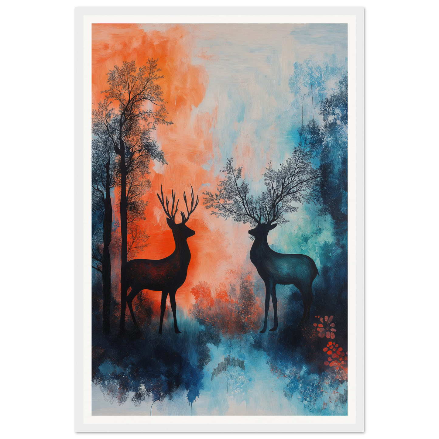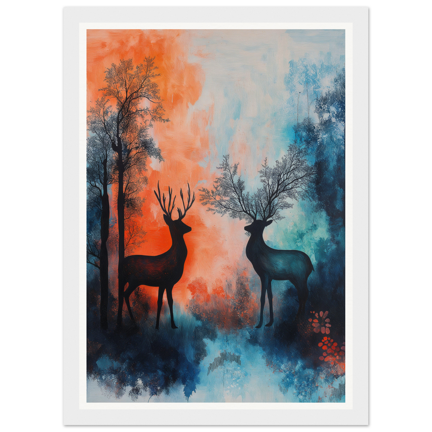 This captivating piece blends surrealist inspiration with impressionistic textures, offering a dream-like symphony of colors. Vibrant oranges and deep blues narrate the story of two deer, silhouettes against a lush twilight backdrop—a visual metaphor capturing the delicate balance of our natural realm.