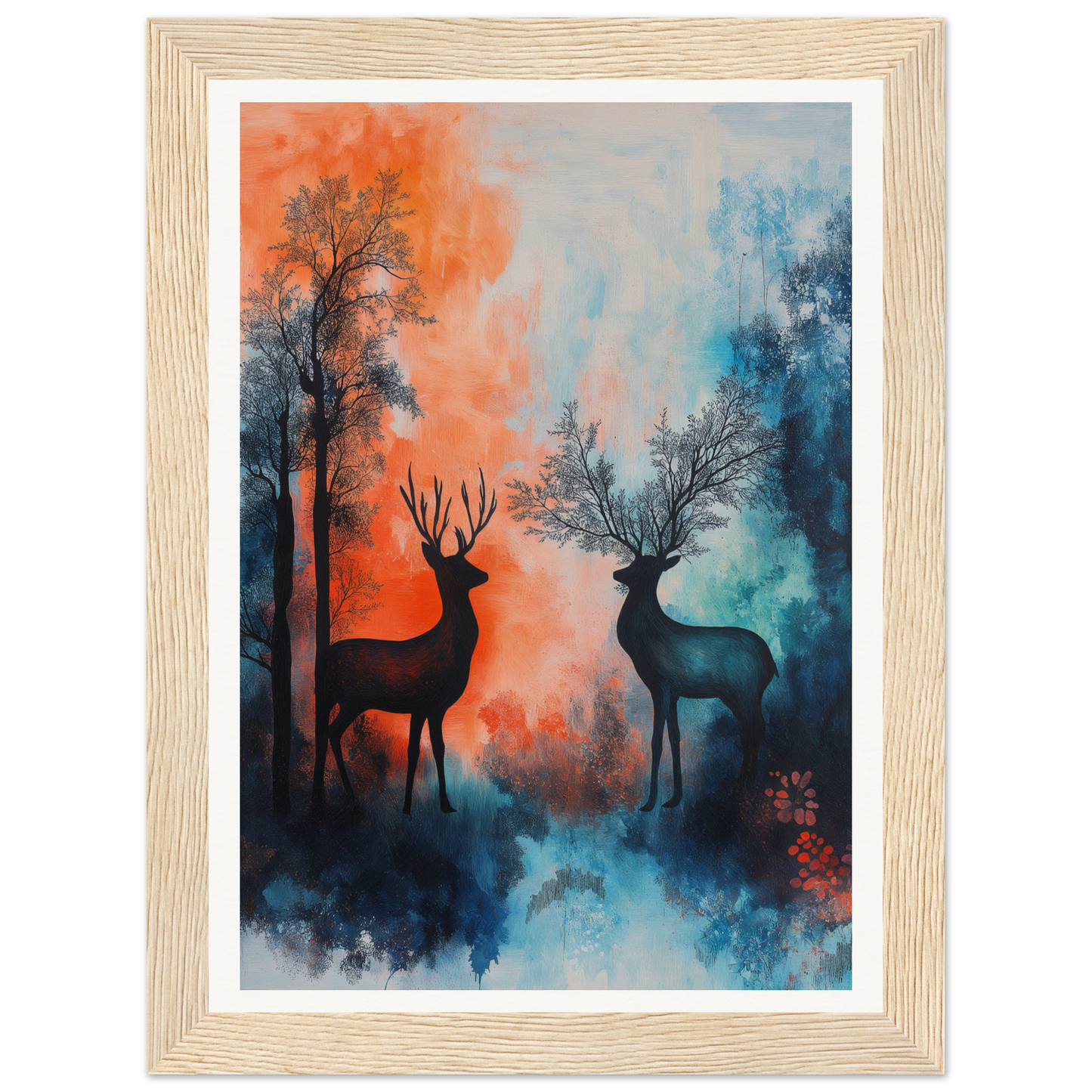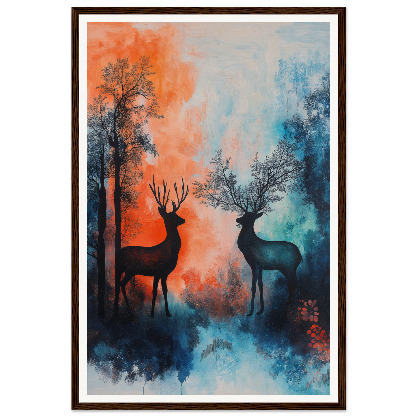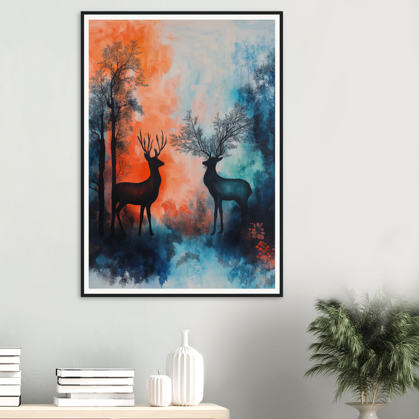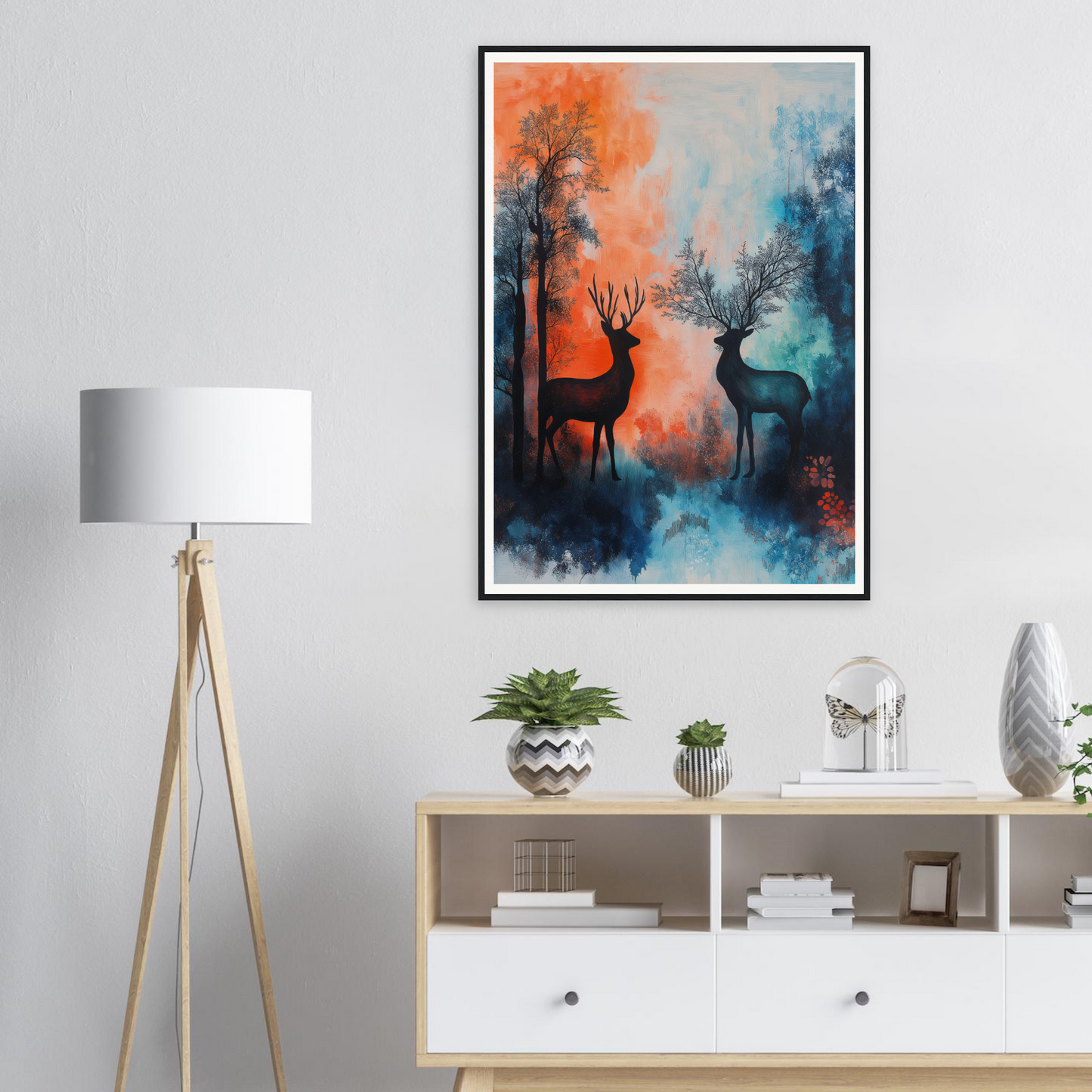 This captivating piece blends surrealist inspiration with impressionistic textures, offering a dream-like symphony of colors. Vibrant oranges and deep blues narrate the story of two deer, silhouettes against a lush twilight backdrop—a visual metaphor capturing the delicate balance of our natural realm.