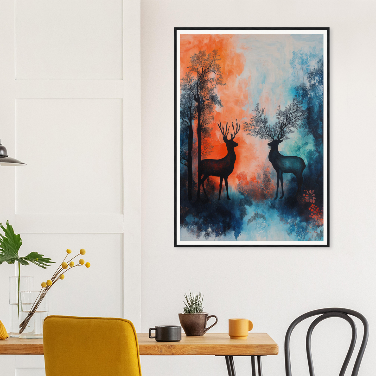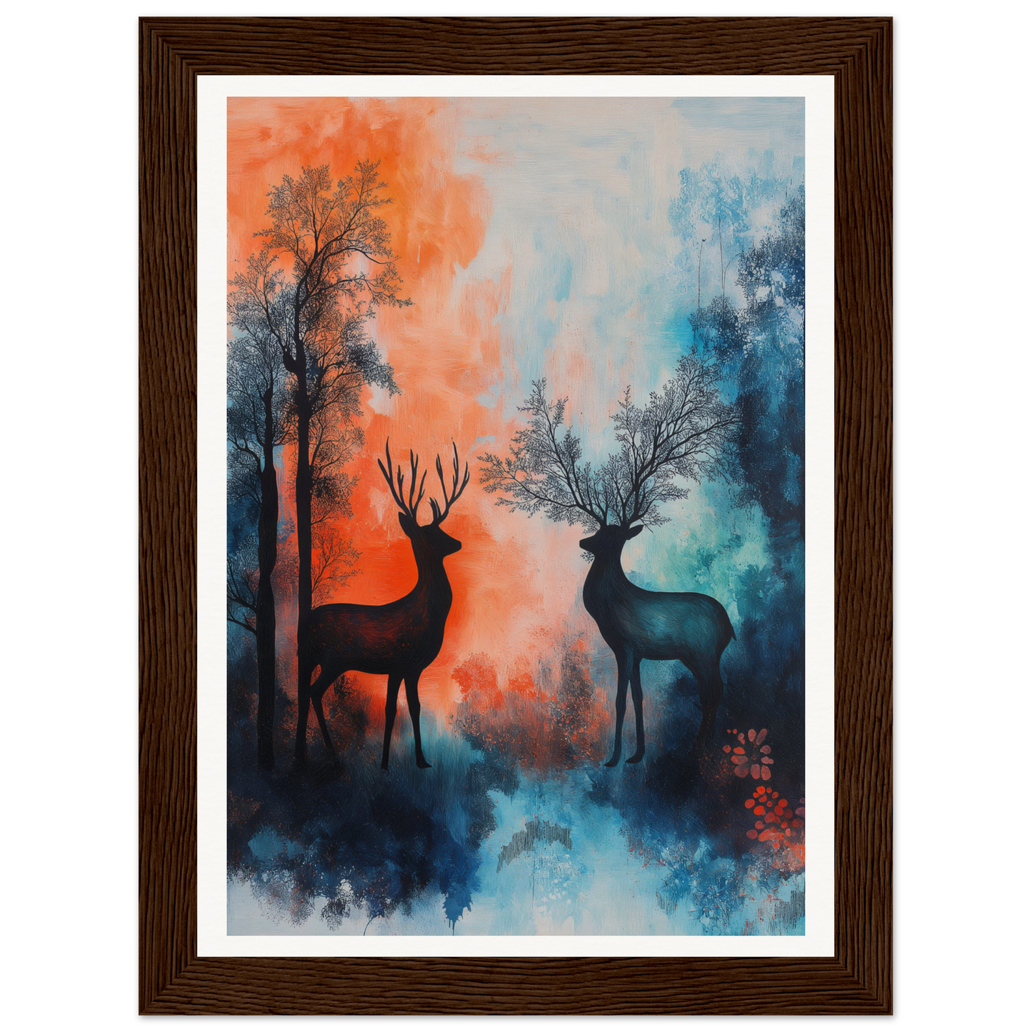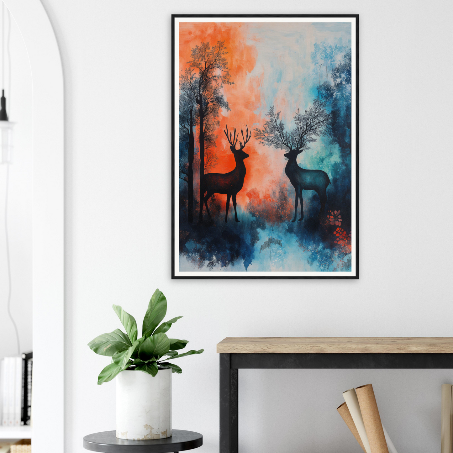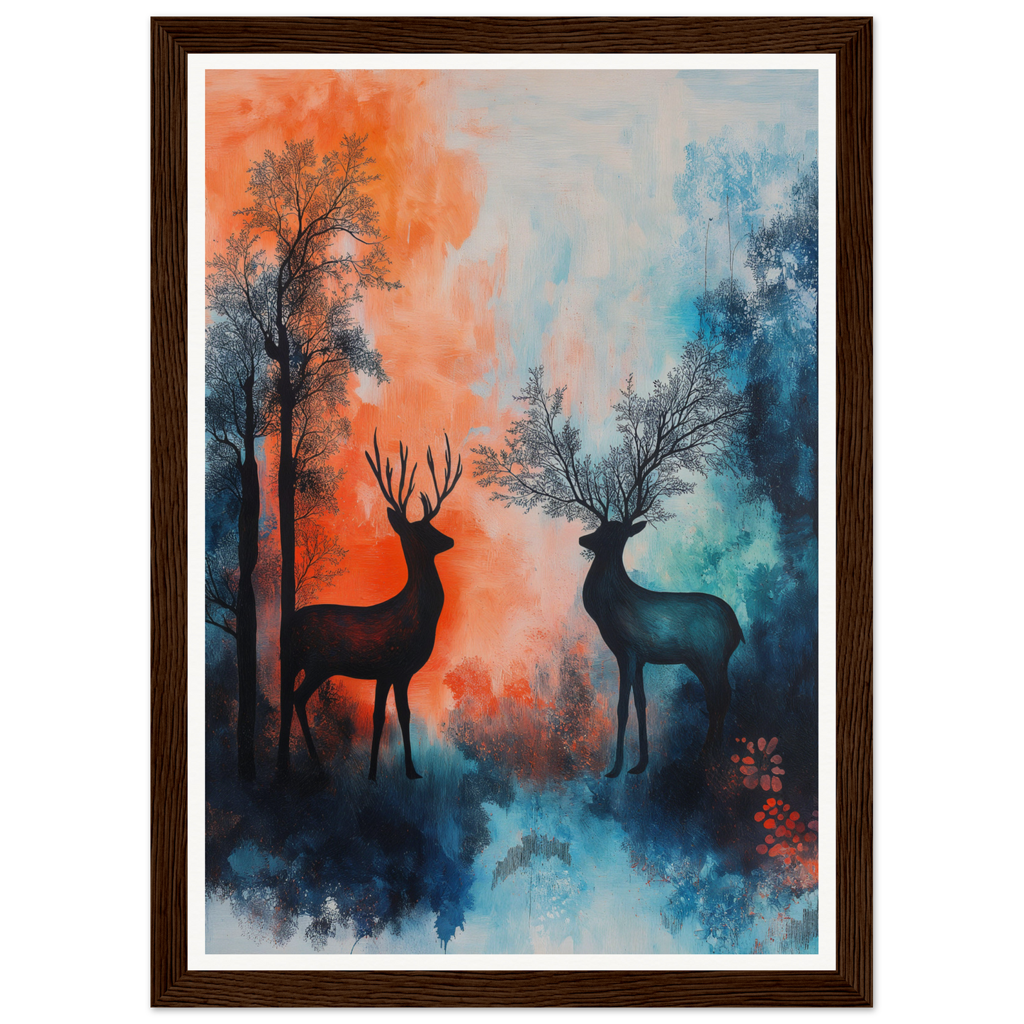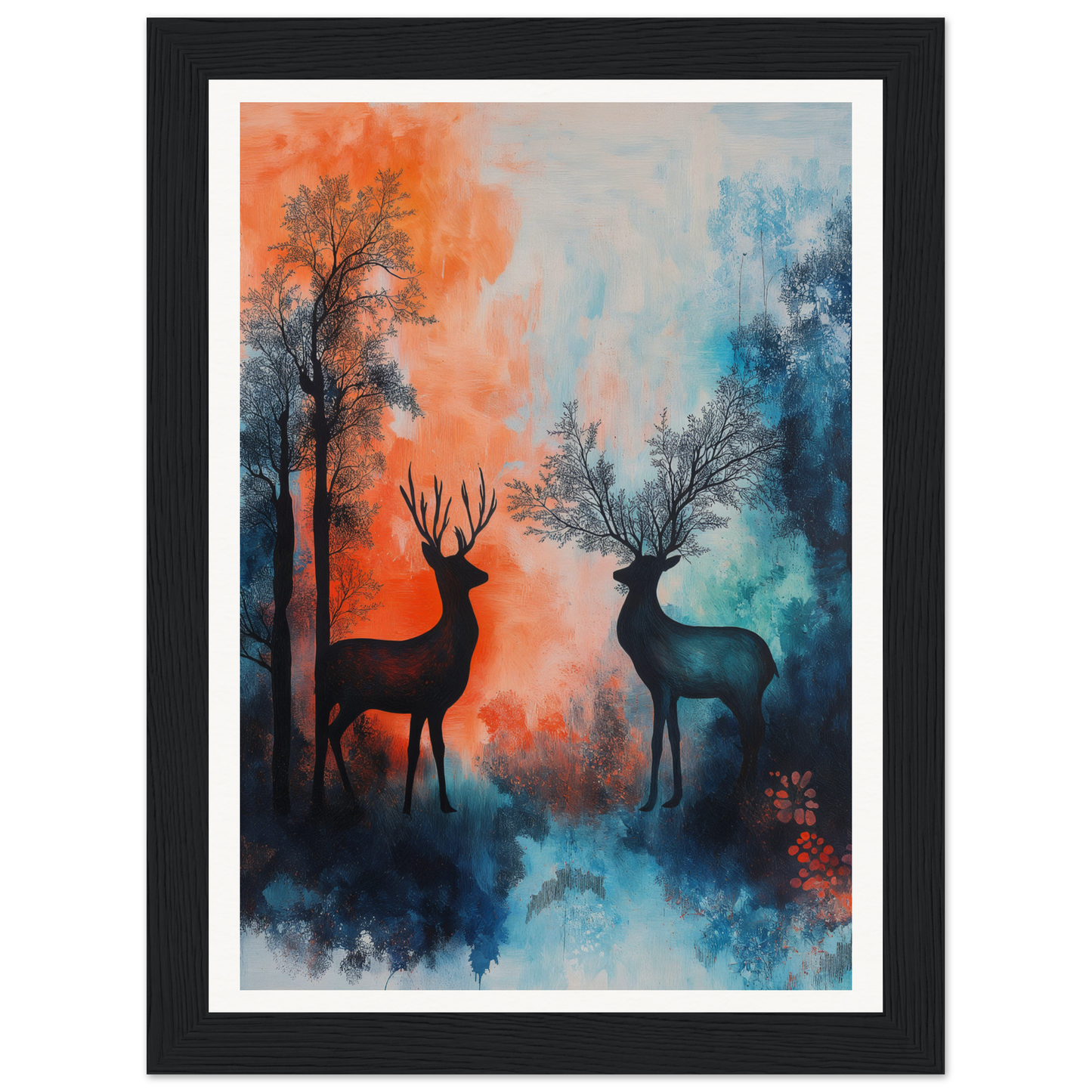 This captivating piece blends surrealist inspiration with impressionistic textures, offering a dream-like symphony of colors. Vibrant oranges and deep blues narrate the story of two deer, silhouettes against a lush twilight backdrop—a visual metaphor capturing the delicate balance of our natural realm.