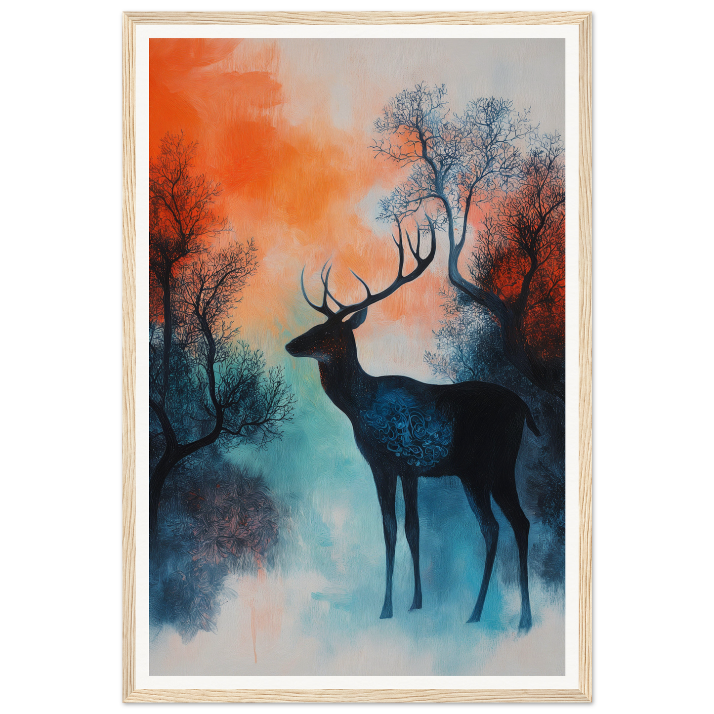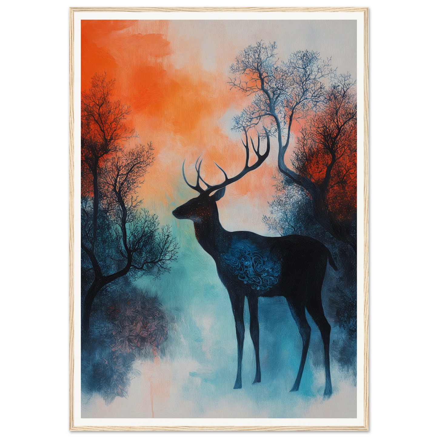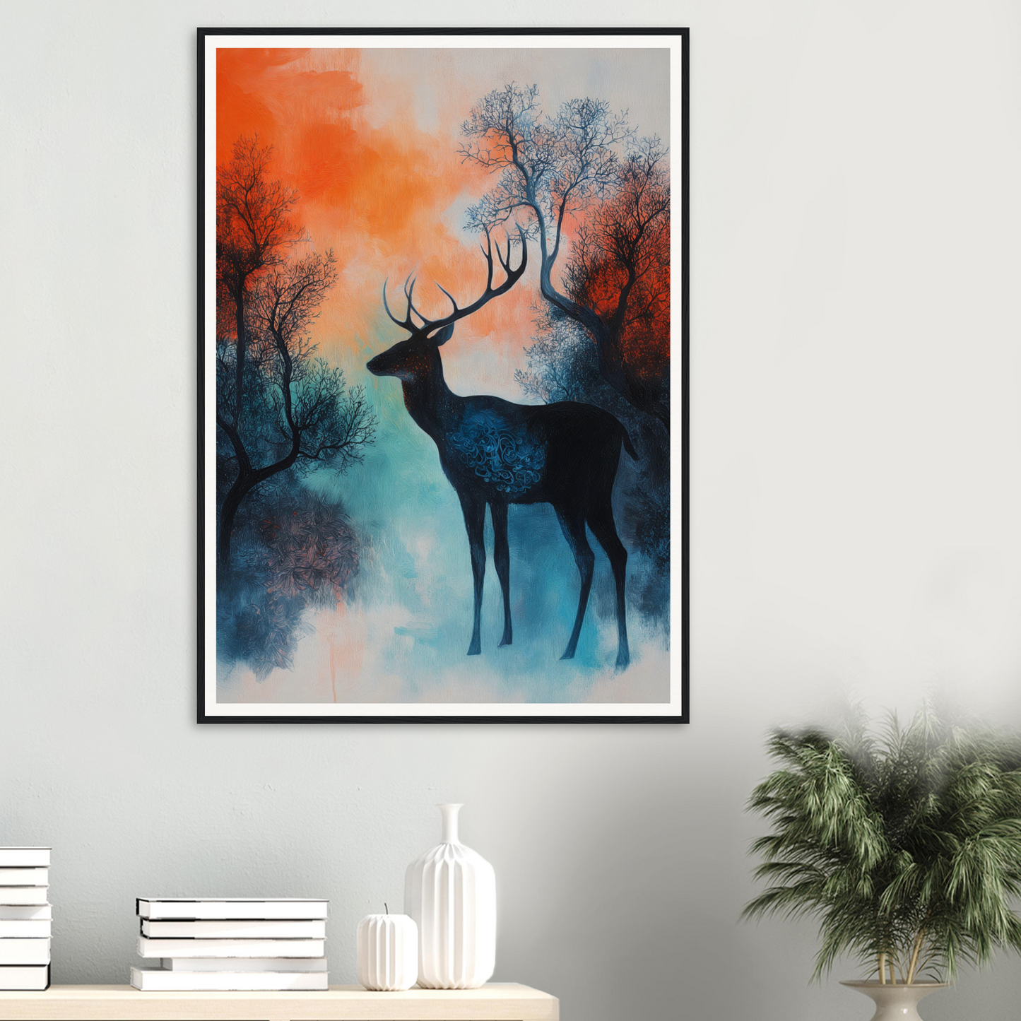 Transform your home with the majestic allure of the Mystical Stag Reverie, a breathtaking fusion of fantasy and nature. Printed using cutting-edge A.I. image generation technology, this masterpiece captures the serenity of a noble stag in a magical forest, basked in shades of vibrant blue, enchanting orange, and rich black.