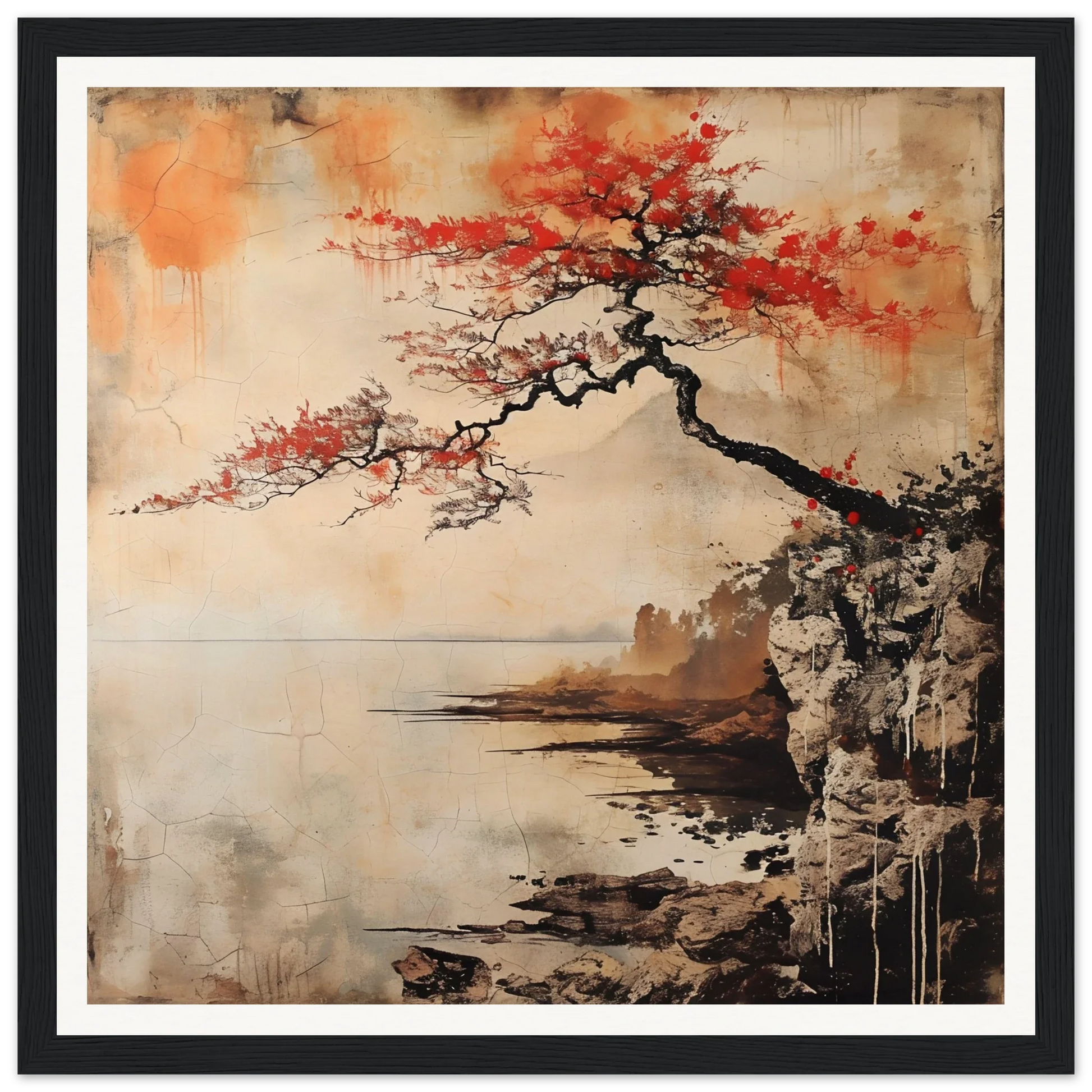 Transform your surroundings with Radiant Cliff Whispers, a captivating masterpiece printed using groundbreaking AI image technology. This exquisite framed wall art captures the vivid resilience of a Japanese maple, its crimson leaves whispering against a serene sky. This blend of tradition and modernity creates an ambiance of balance, harmony, and enduring beauty in your home.
