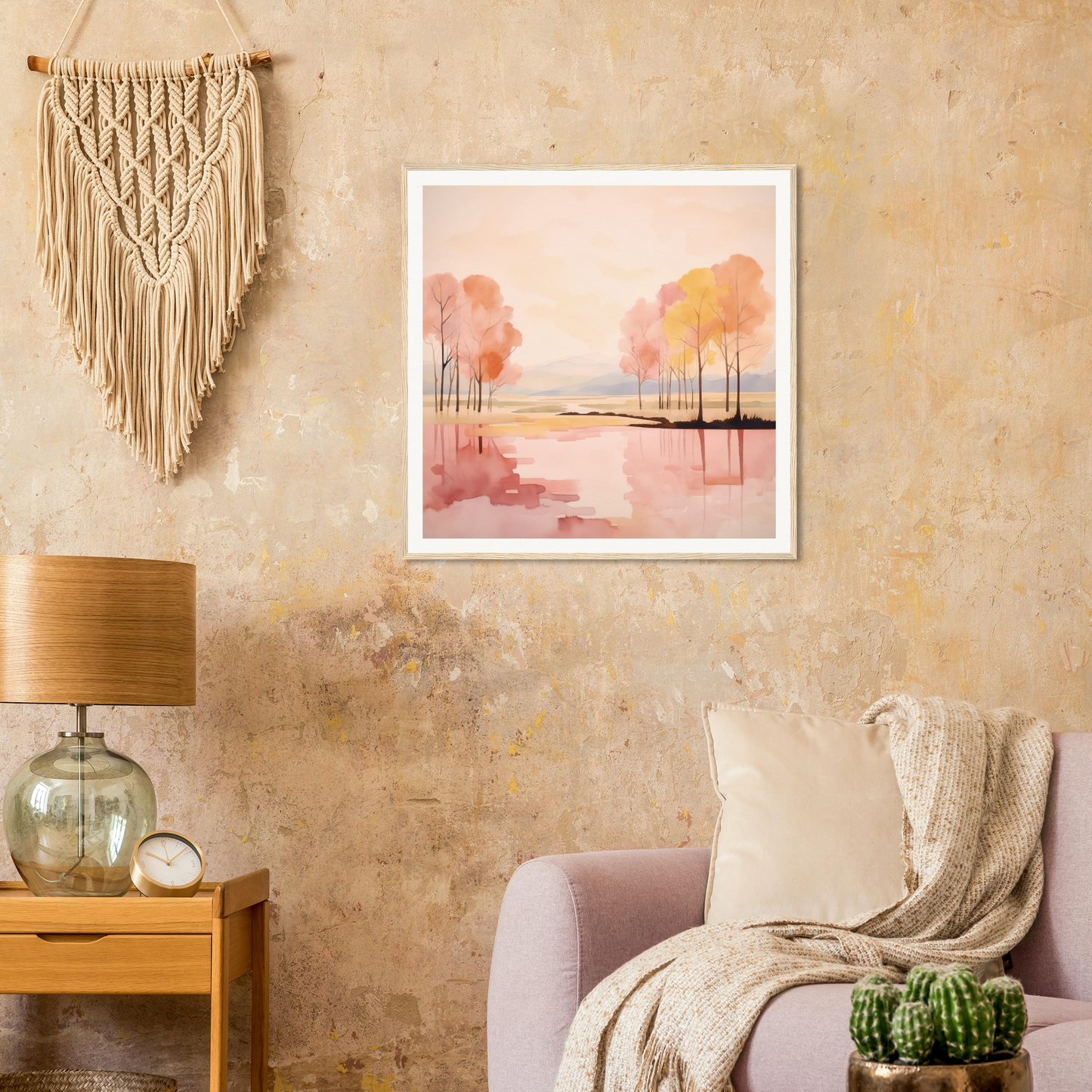 On every framed art piece, colors of soft peach, blush pink, muted yellows, and creamy whites invite calmness and reflection. Witness a landscape poised between reality and imagination.